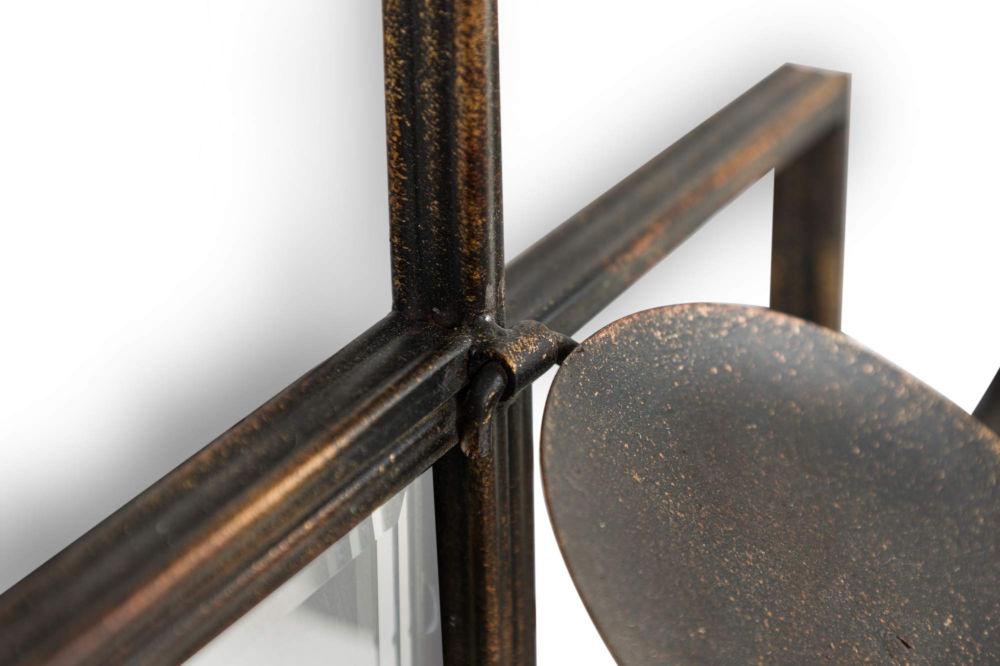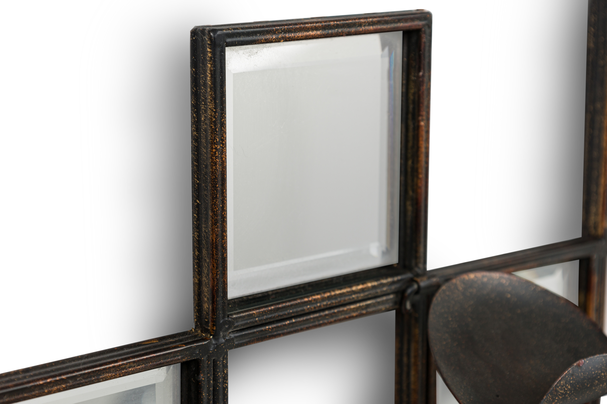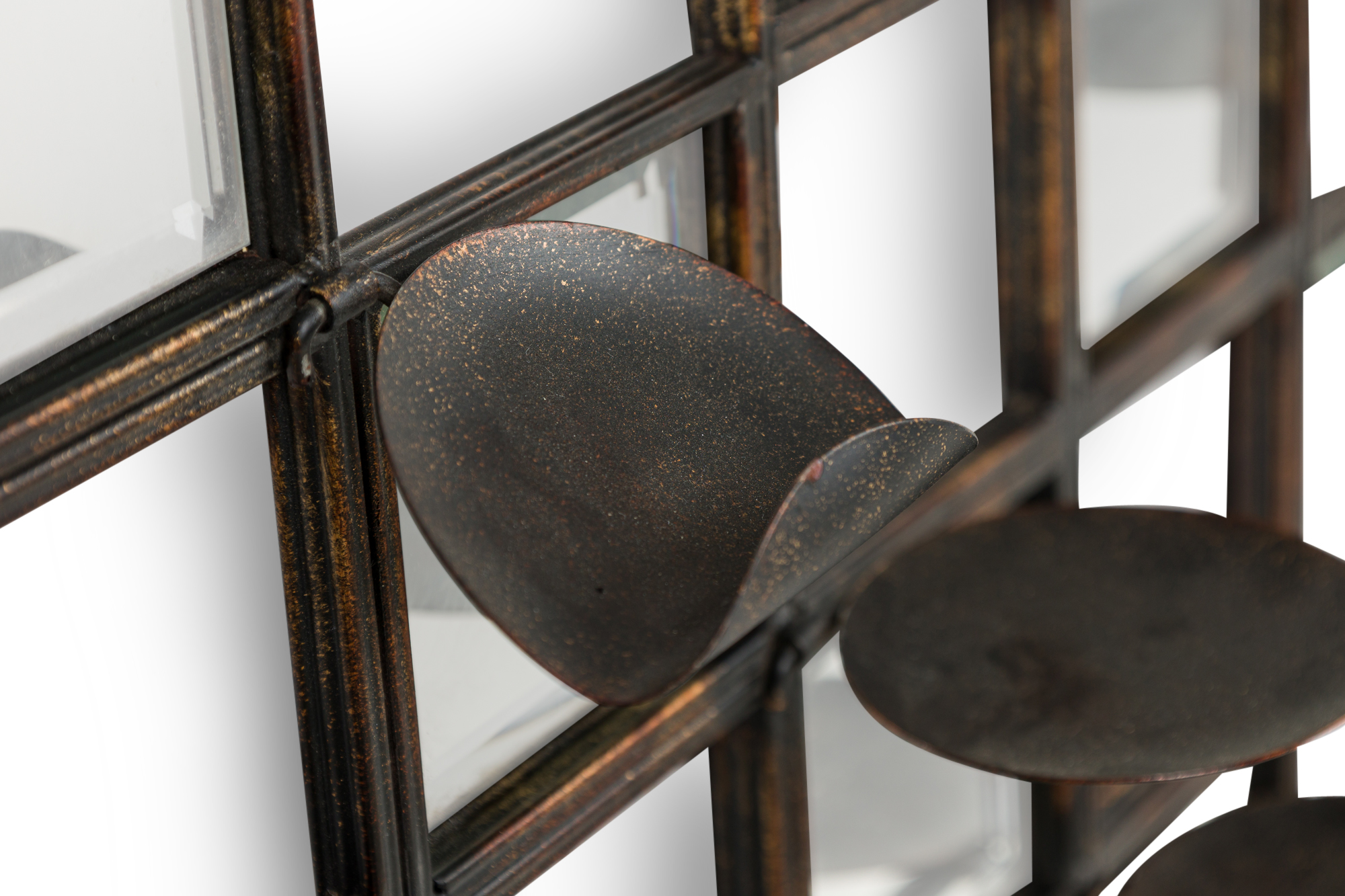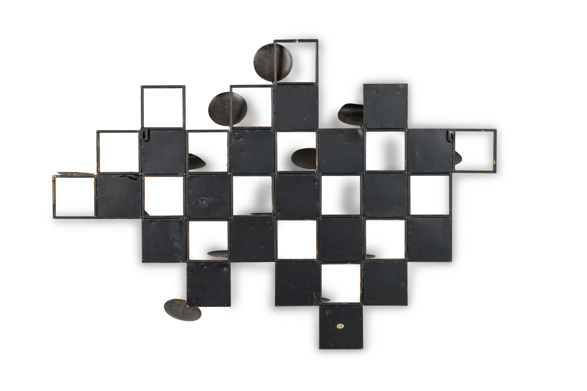 American Contemporary wall sculpture with a checker board pattern with some spaces have a mirror with extended circulars to hold candles