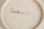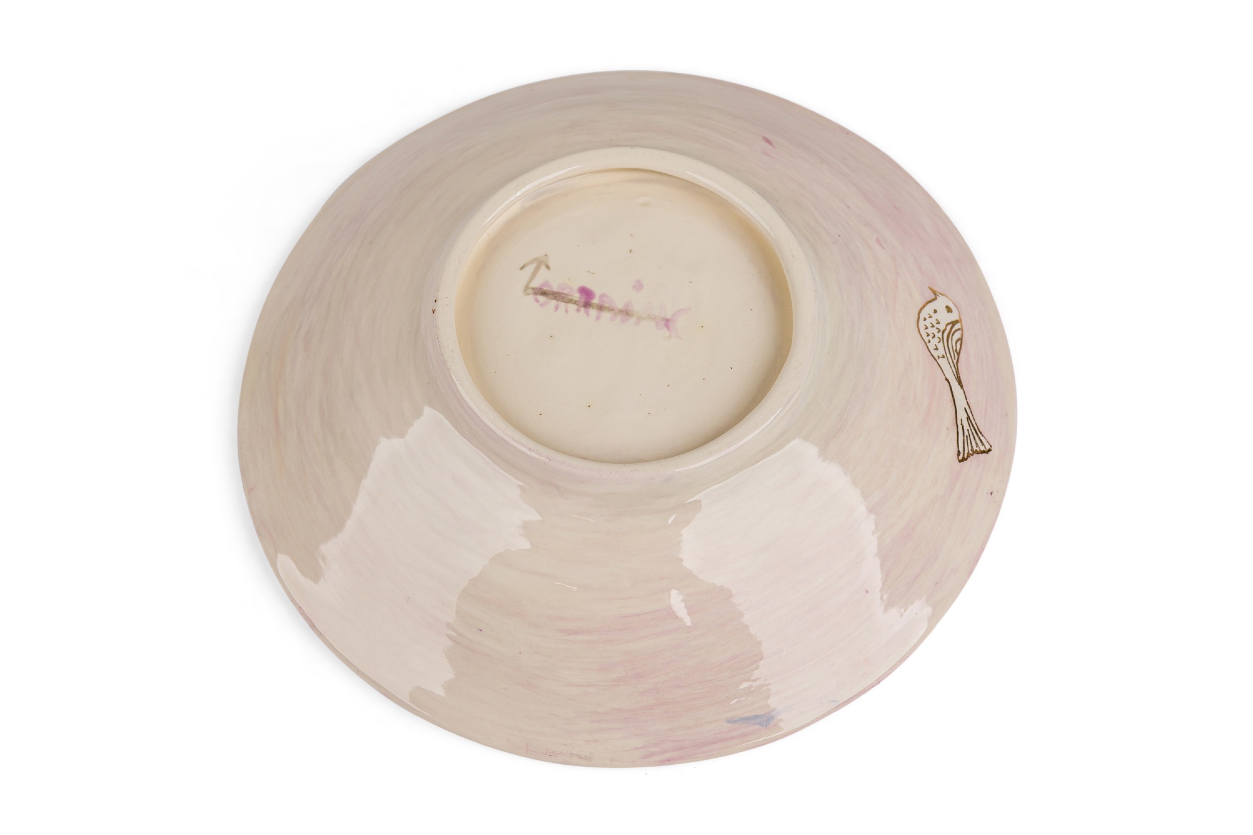 American Contemporary hand painted lavender plate with three white birds in flight and a outline of blue bird (signed on back).