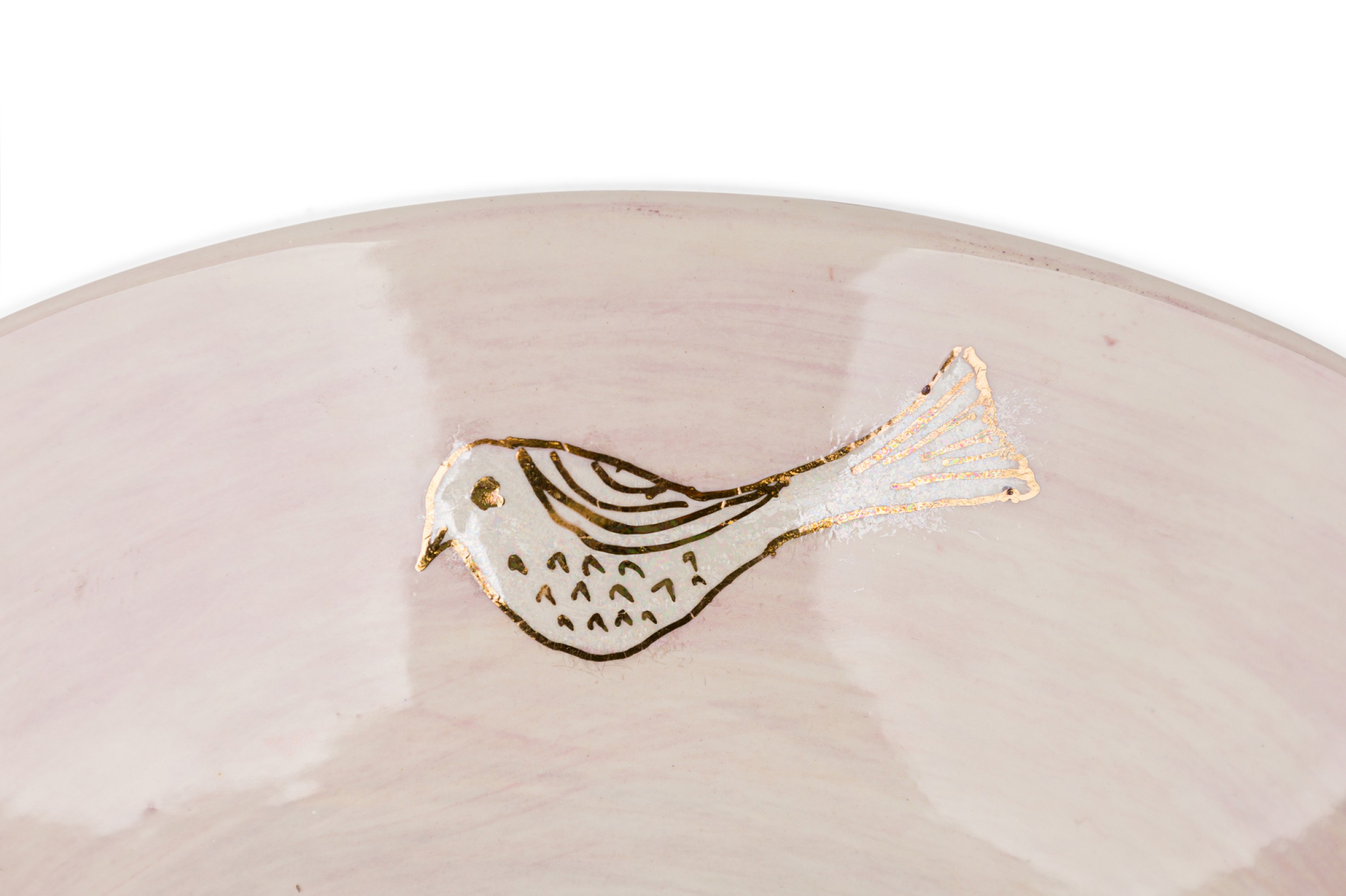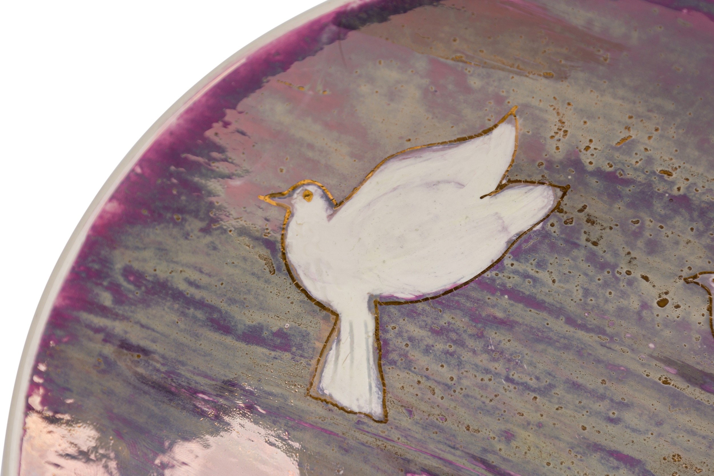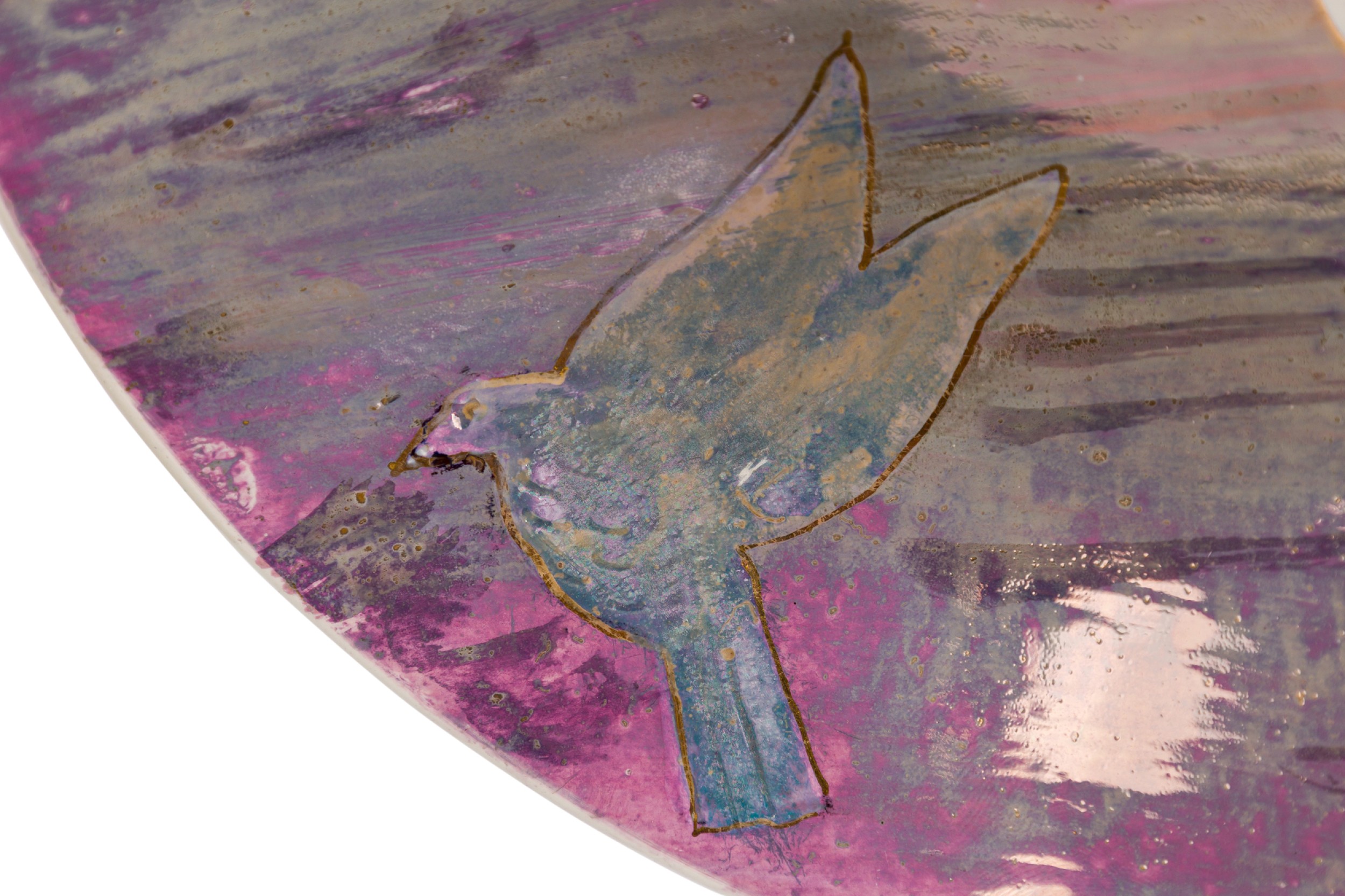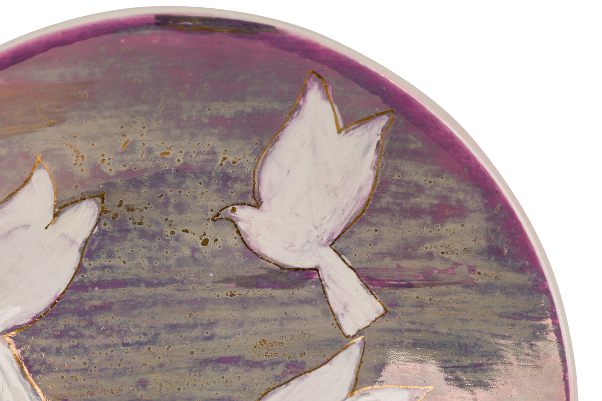 American Contemporary hand painted lavender plate with three white birds in flight and a outline of blue bird (signed on back)