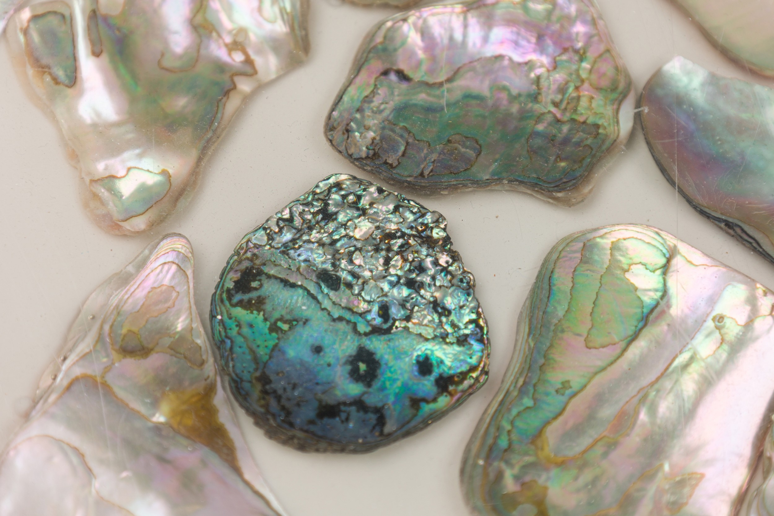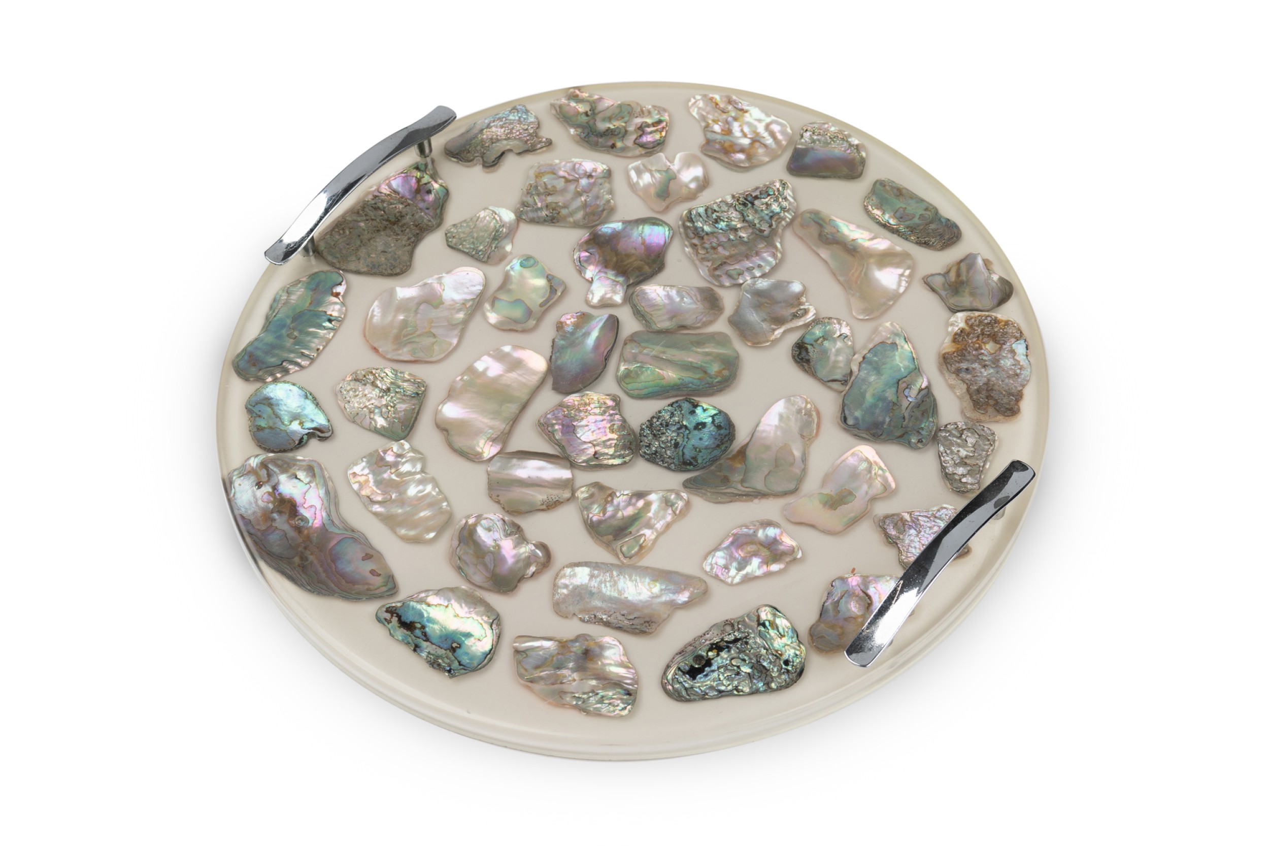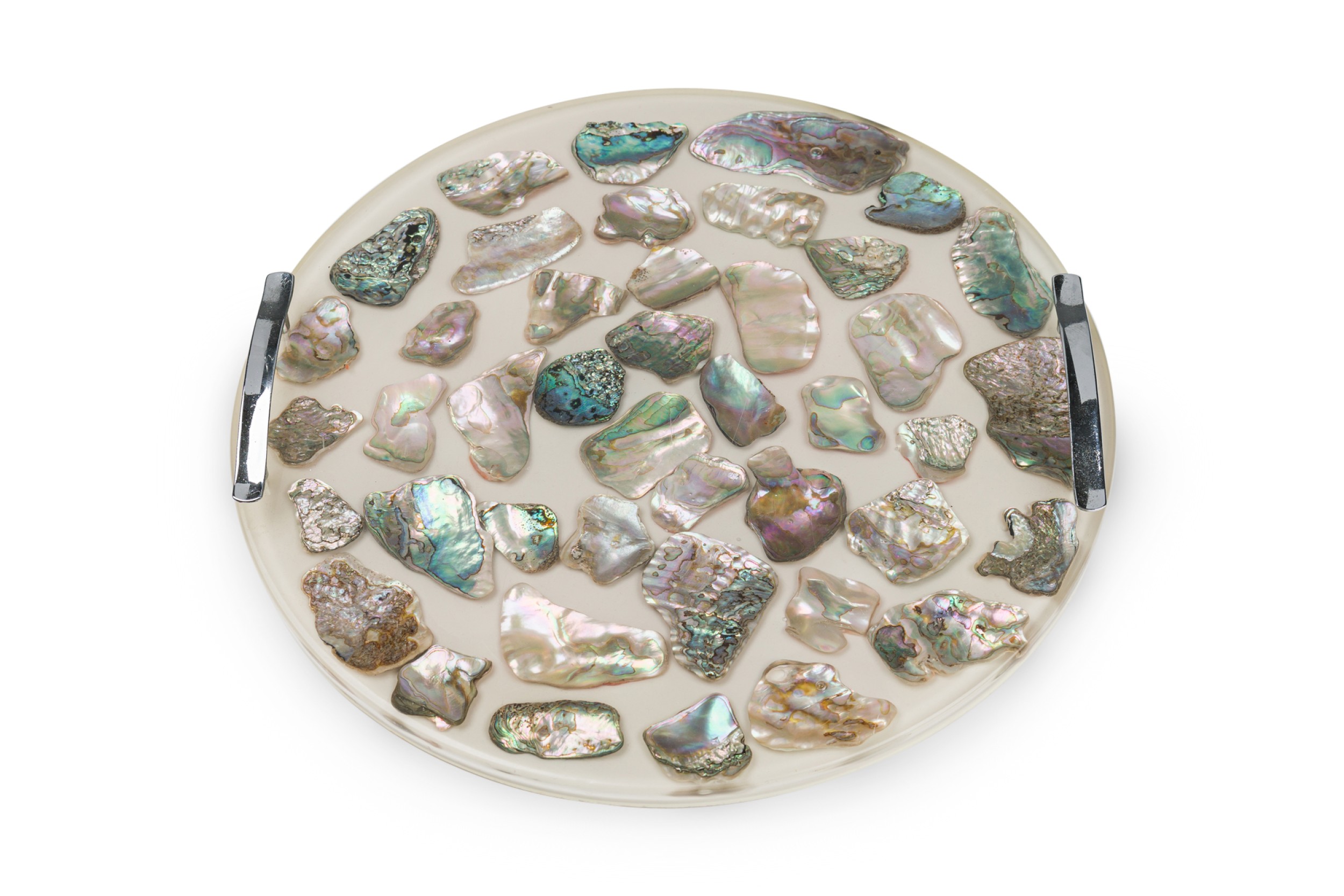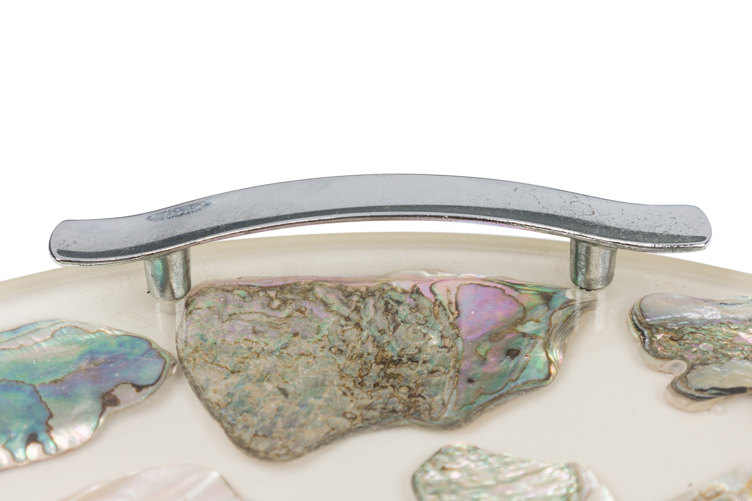 American Contemporary lucite tray adorned with inlaid iridescent abalones.