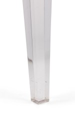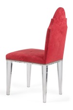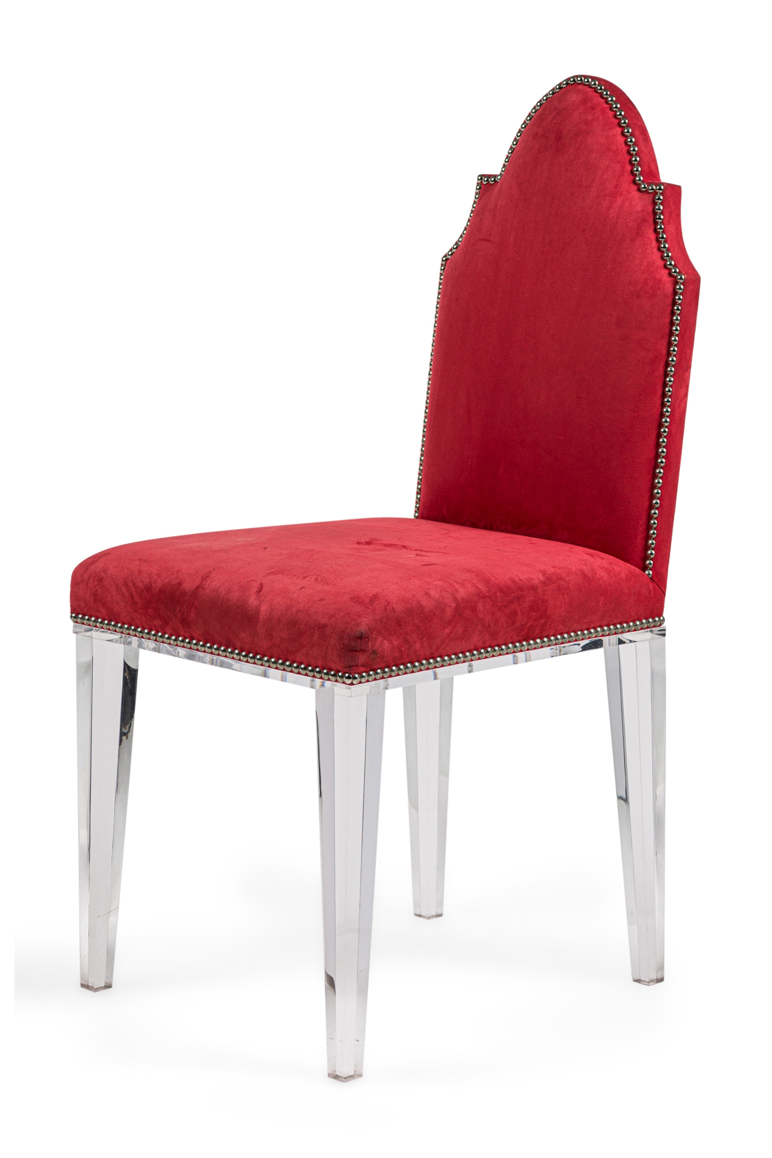 American Contemporary side chair having a shaped arch desgn back and squared Lucite acrylic legs with crimson red upholstered seat and back with nail head trim (GEOFFREY BRADFIELD).