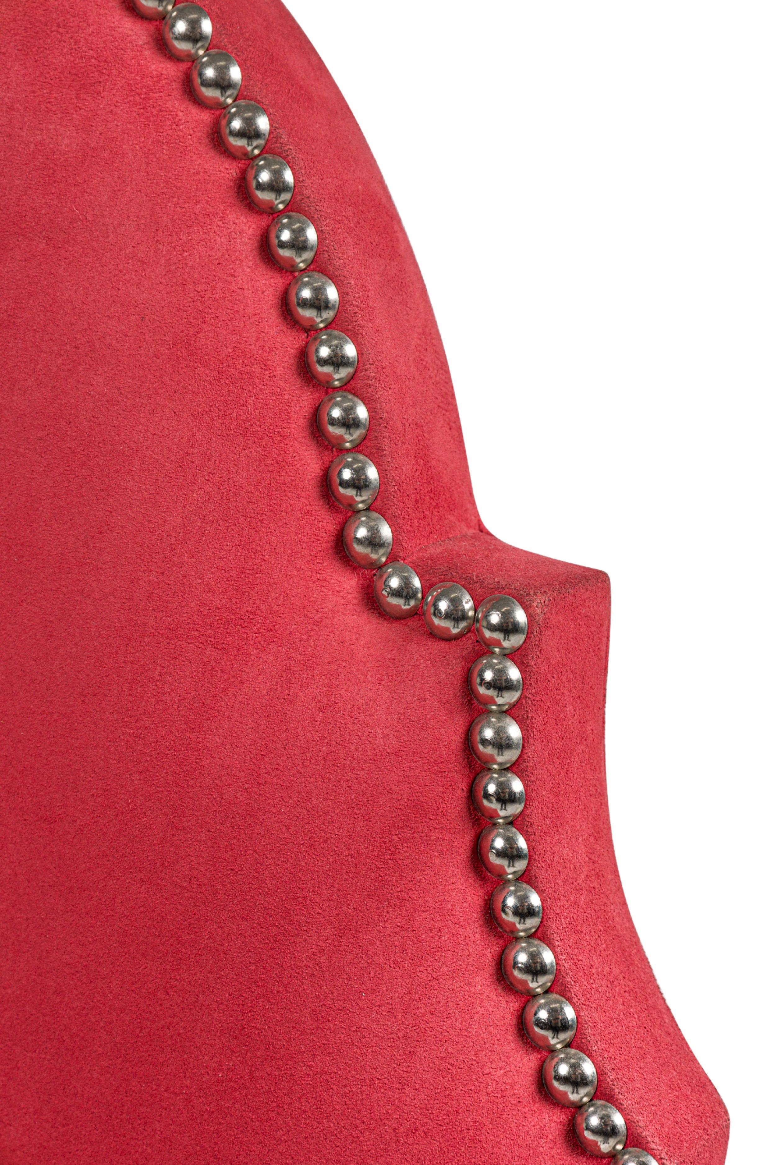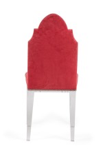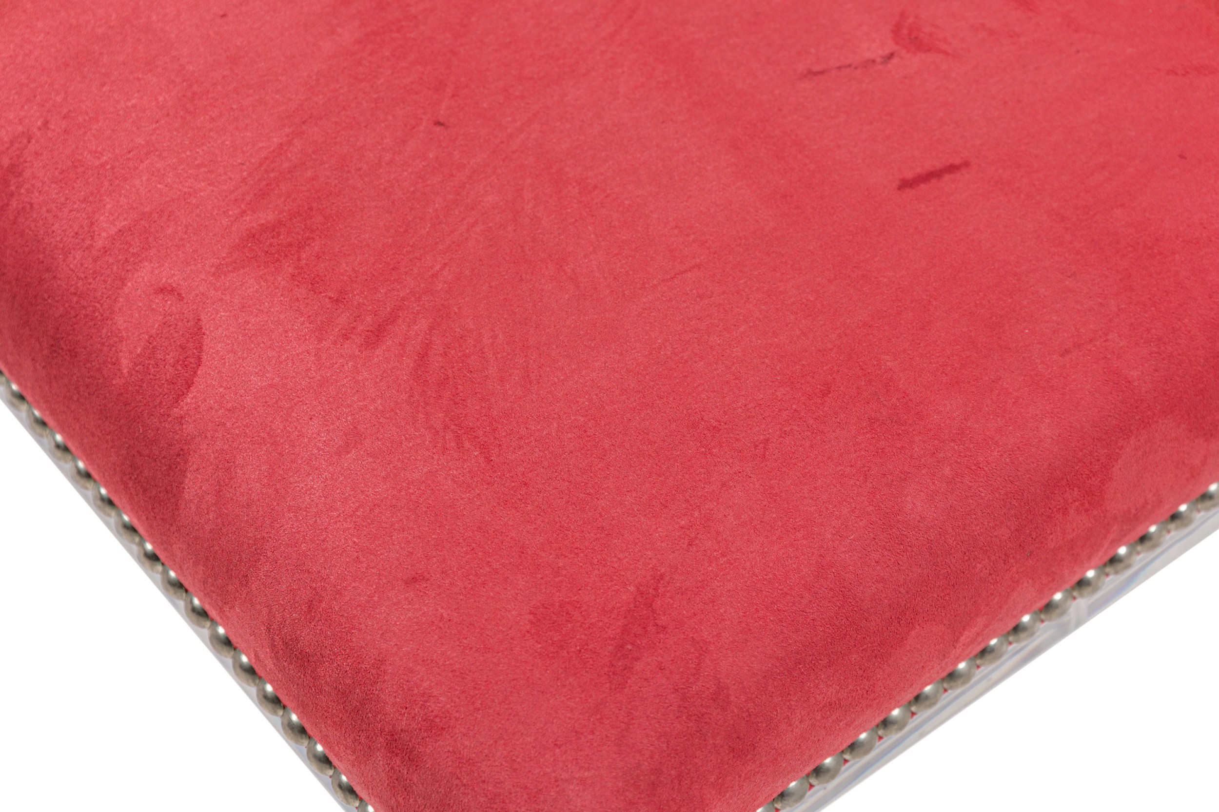 American Contemporary side chair having a shaped arch desgn back and squared Lucite acrylic legs with crimson red upholstered seat and back with nail head trim (GEOFFREY BRADFIELD)