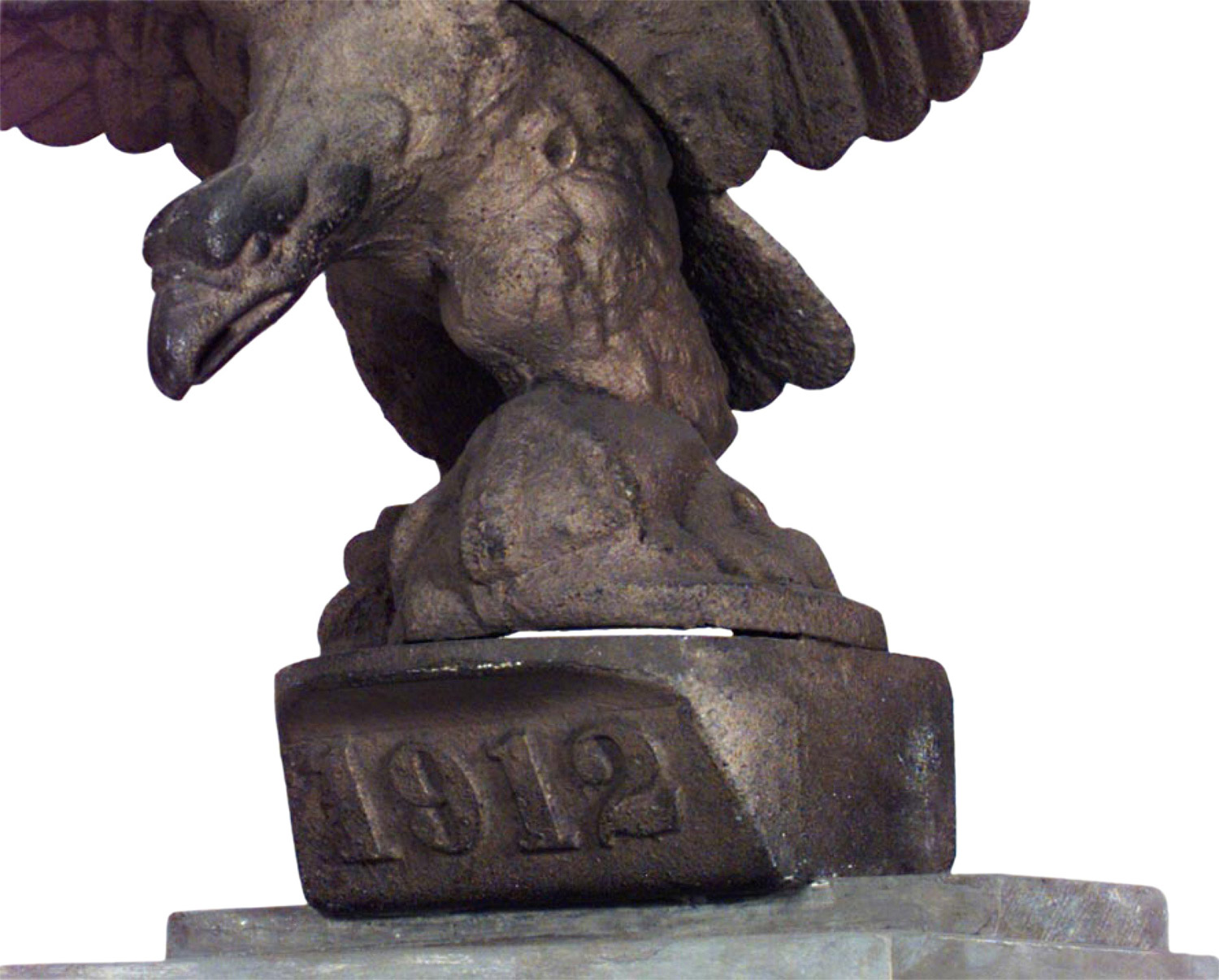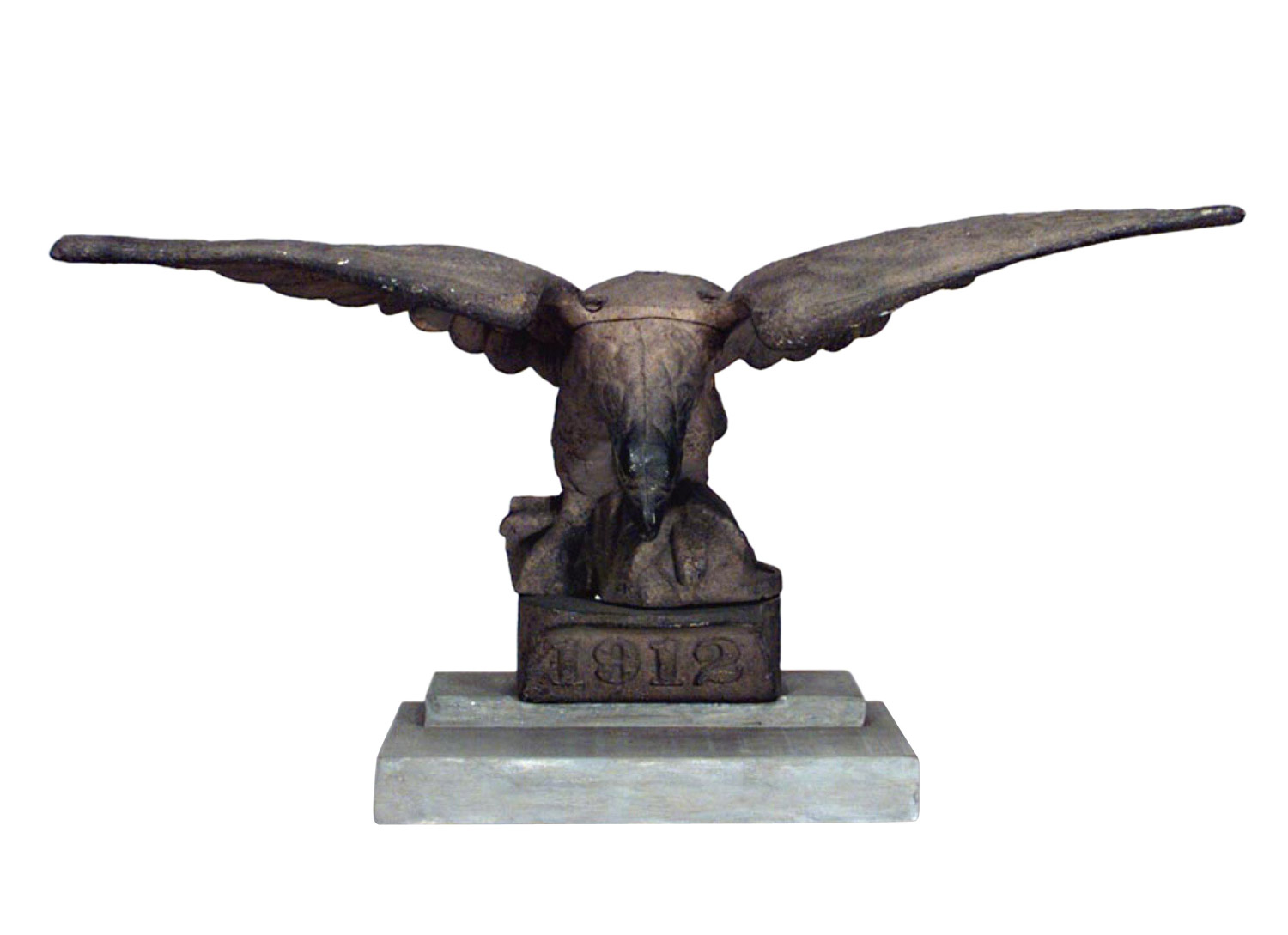 American Country style painted iron eagle figure with spread wings perched on gray painted wood base (with date 1912).
