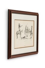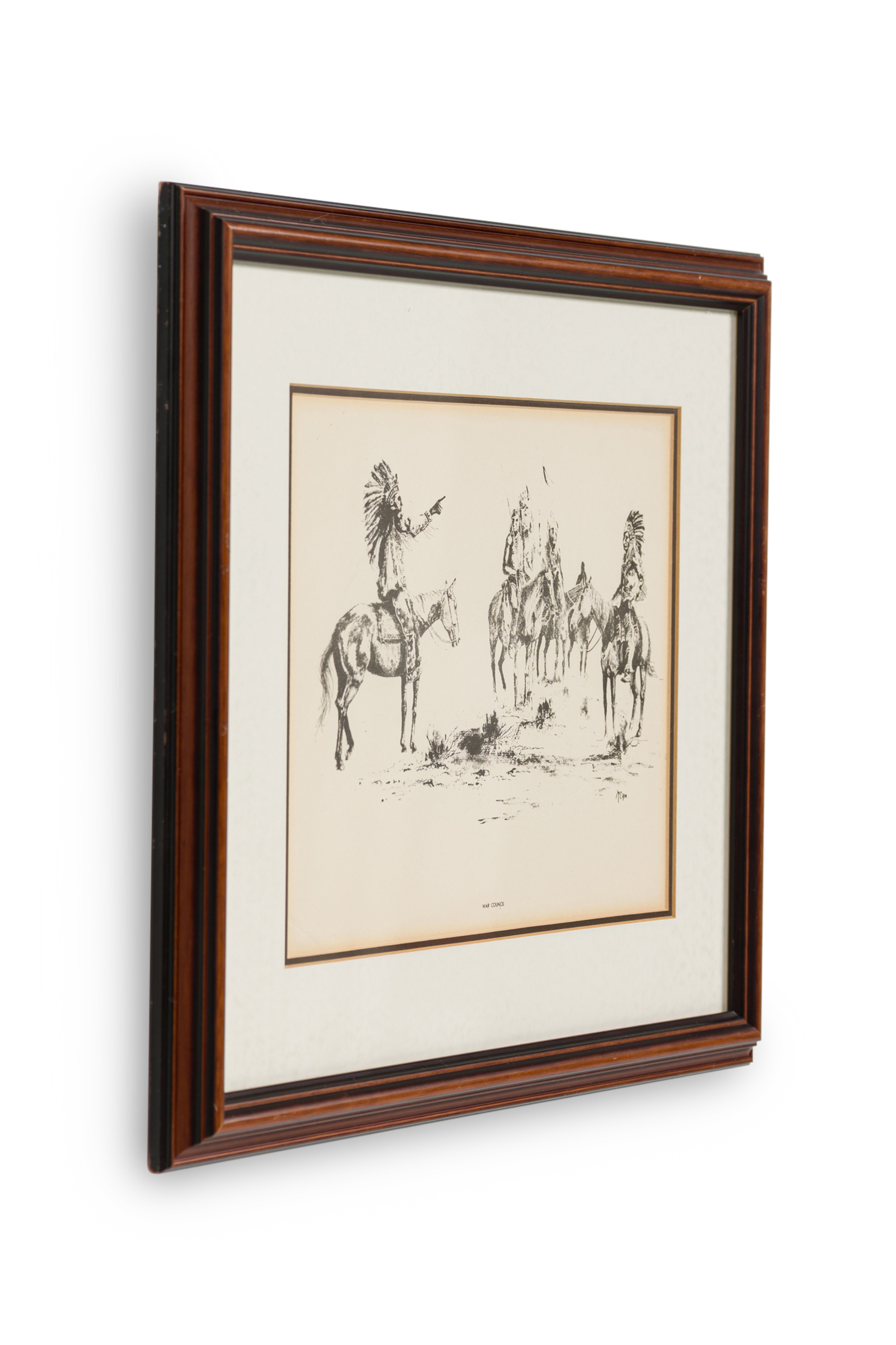 American Western style genre scene print of a group of Indians oh horses titlled: "War Council" in a mahogany frame and white mat (SIGNED: McCAIN) (similar items: NWL7281,, 7282A, 7284, 7285)