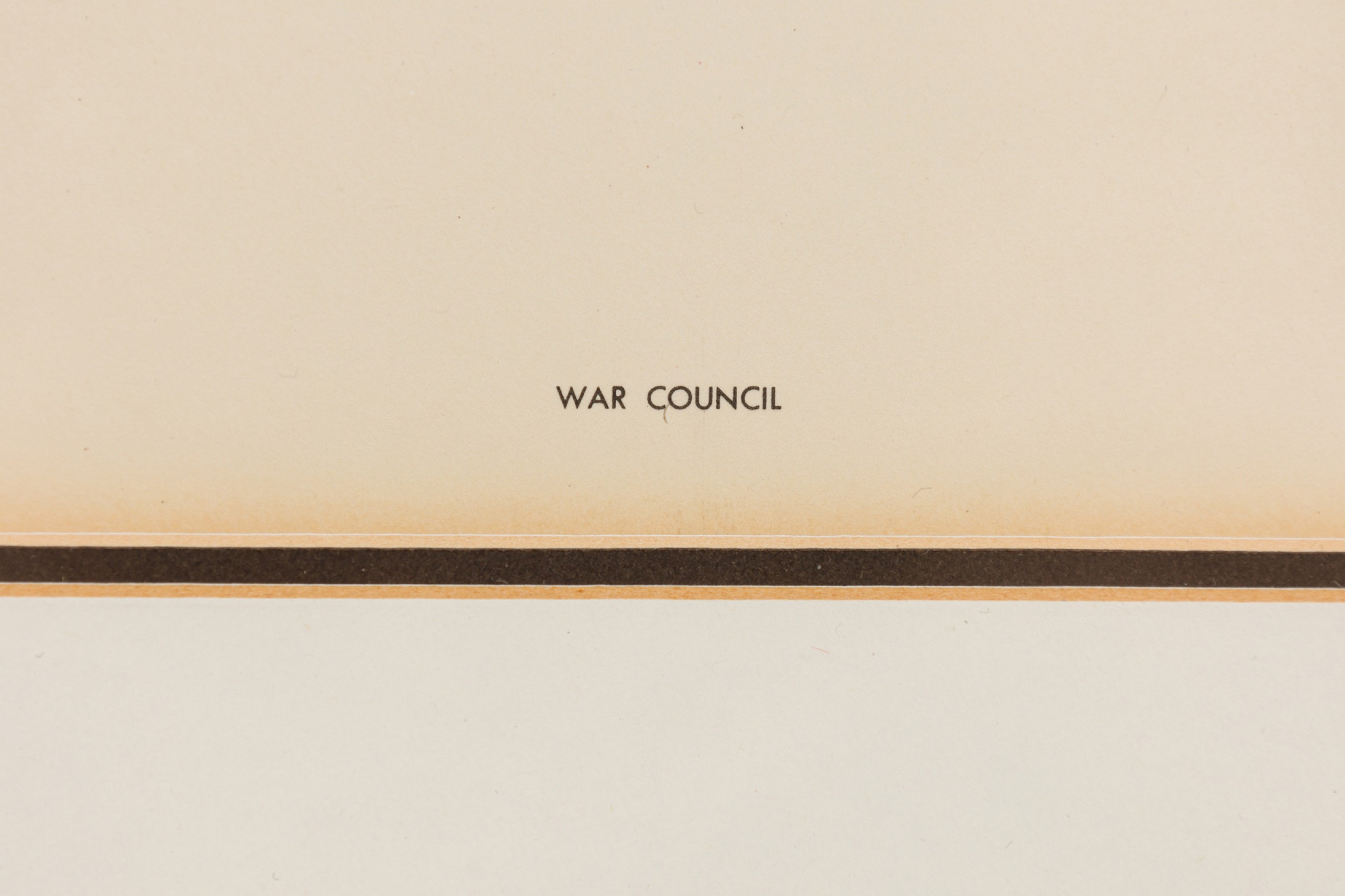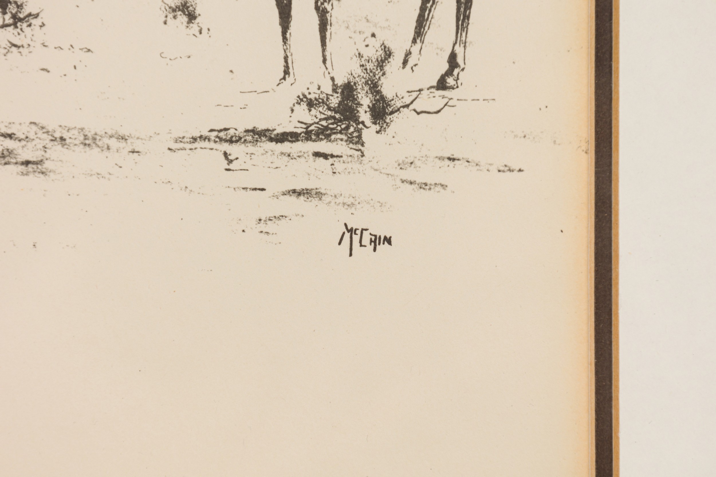 American Western style genre scene print of a group of Indians oh horses titlled: "War Council" in a mahogany frame and white mat (SIGNED: McCAIN) (similar items: NWL7281,, 7282A, 7284, 7285).
