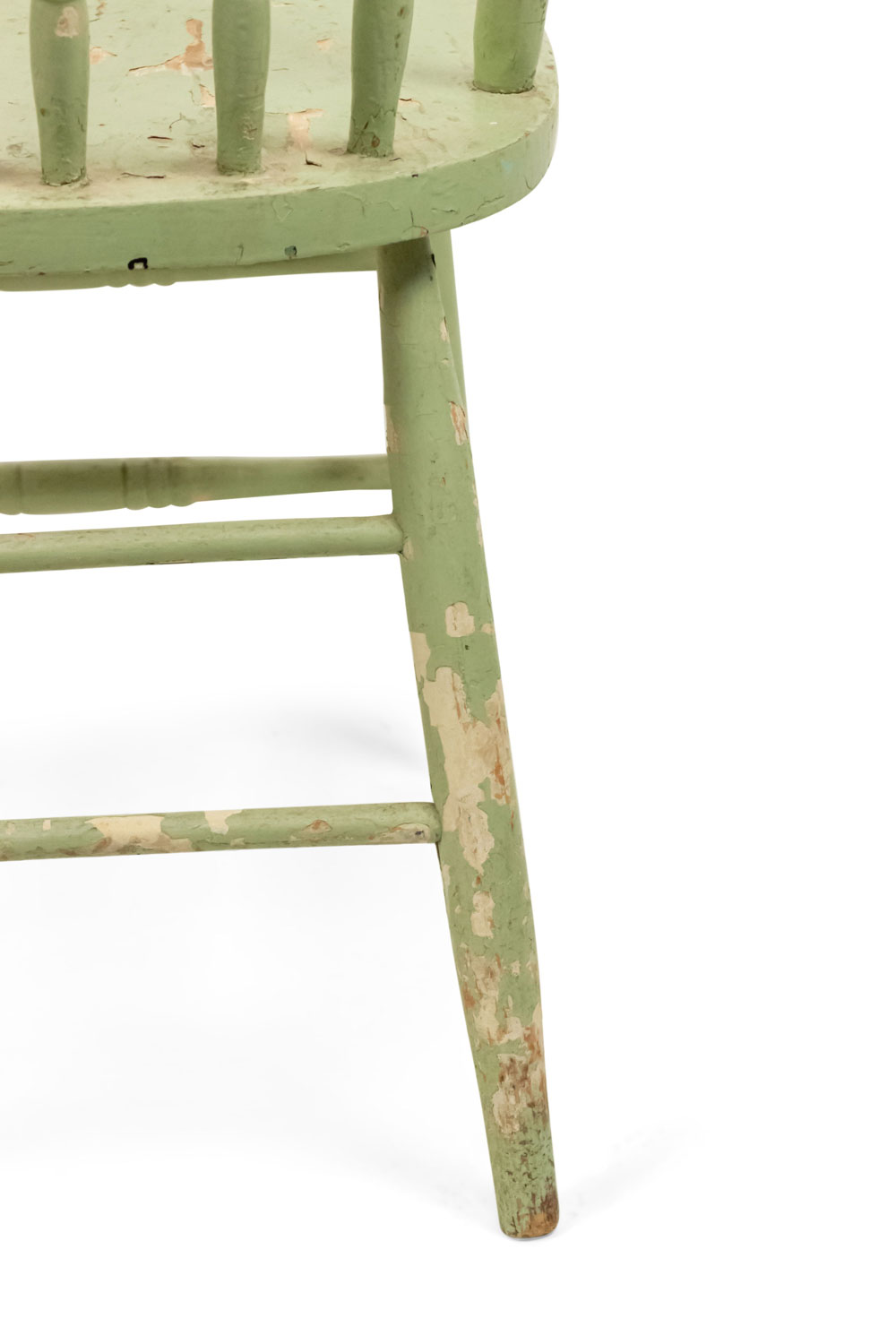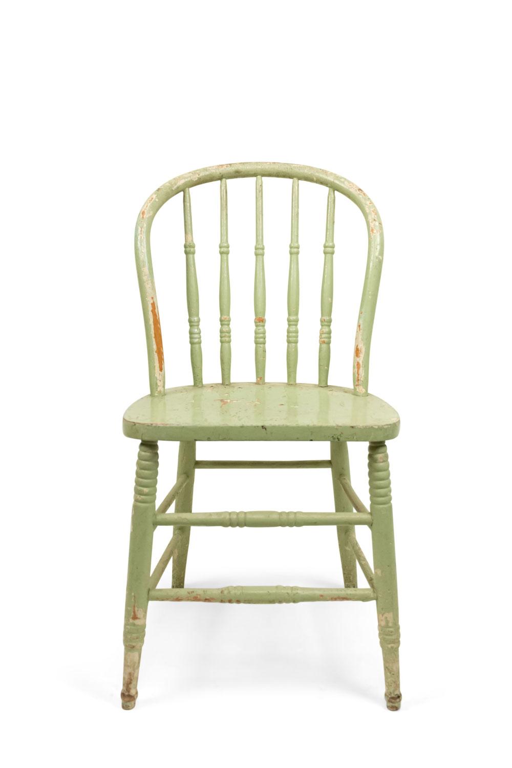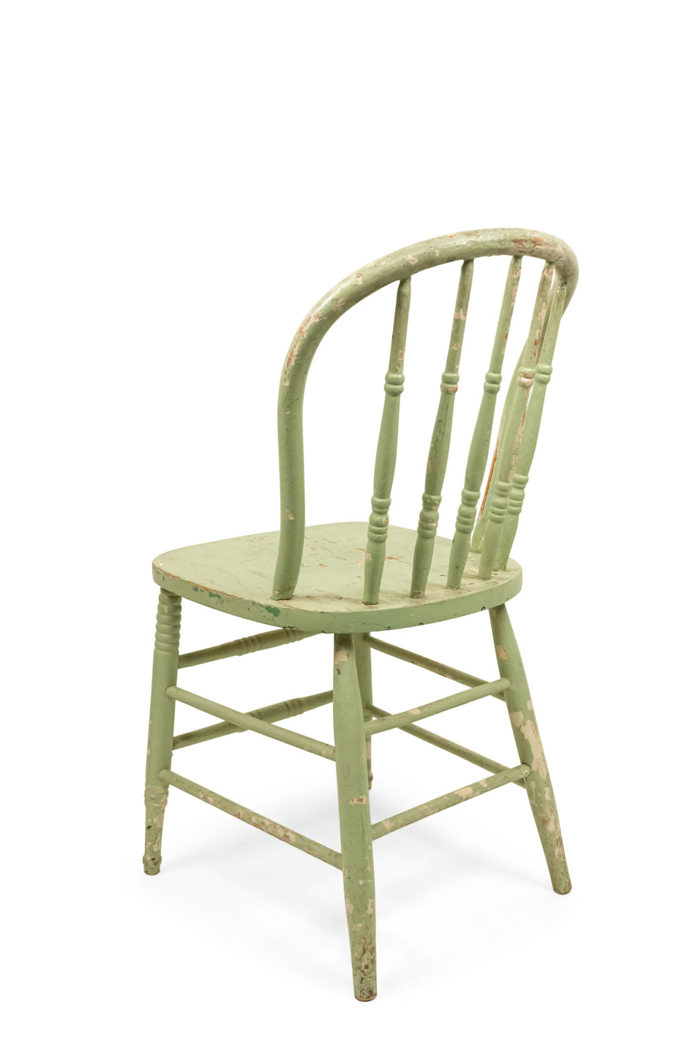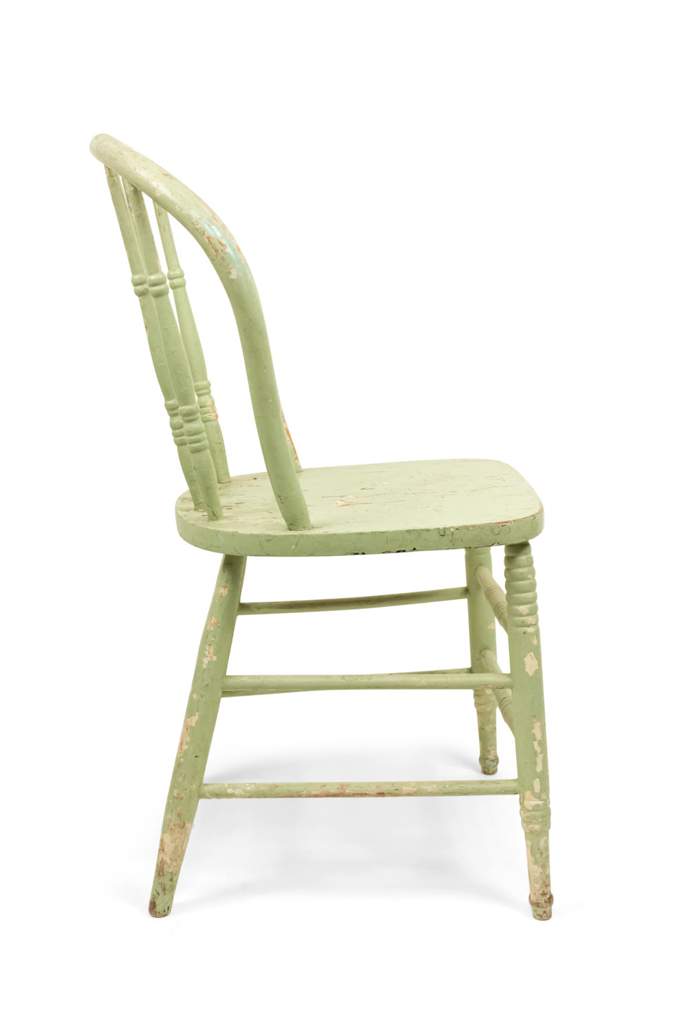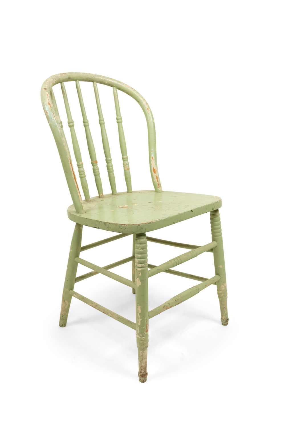 3 American Country style (19/20th Cent) antique green painted side chairs with a spindles and a hoop design back having a double stretcher. (PRICED EACH).