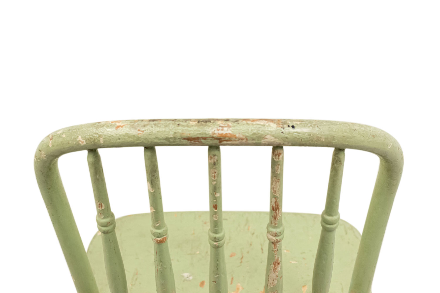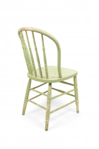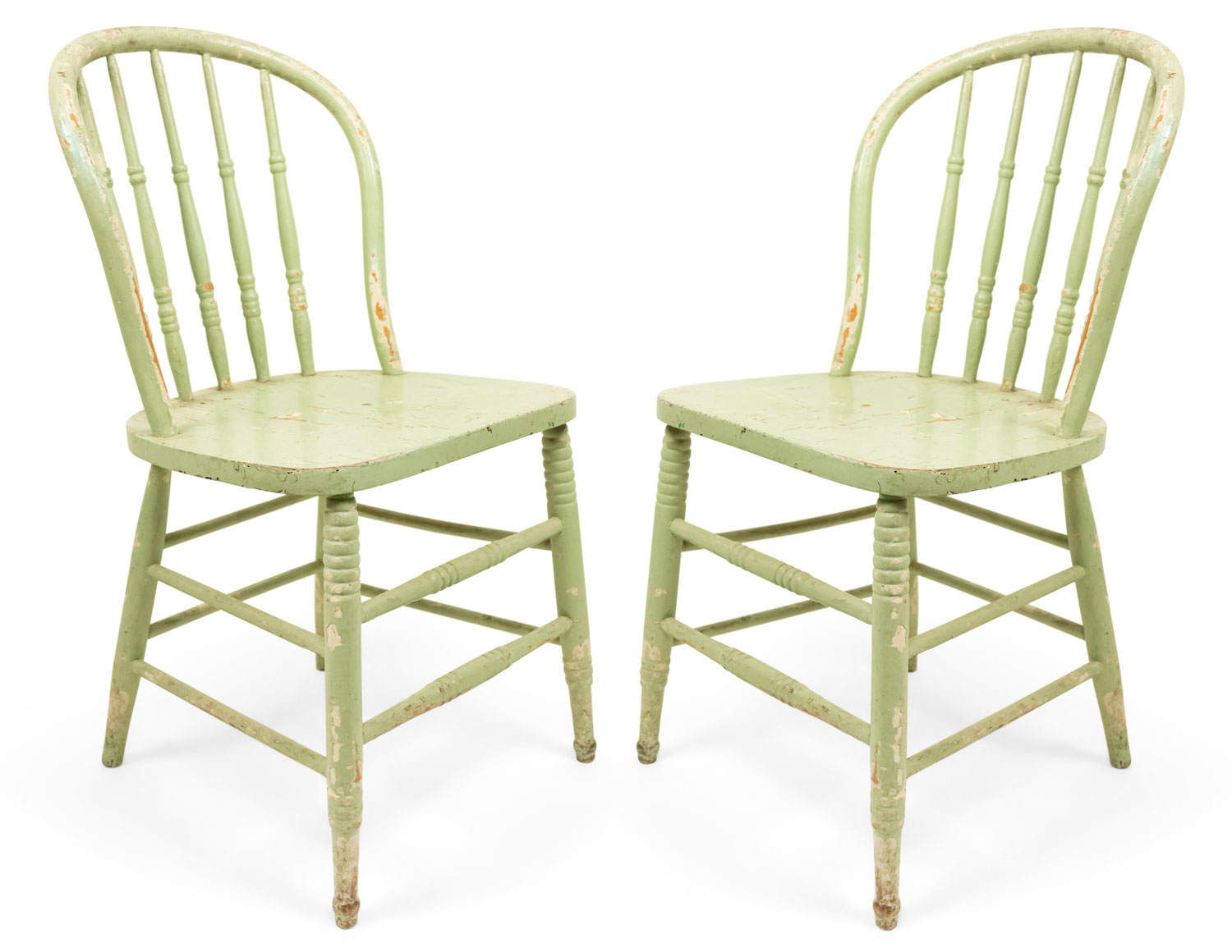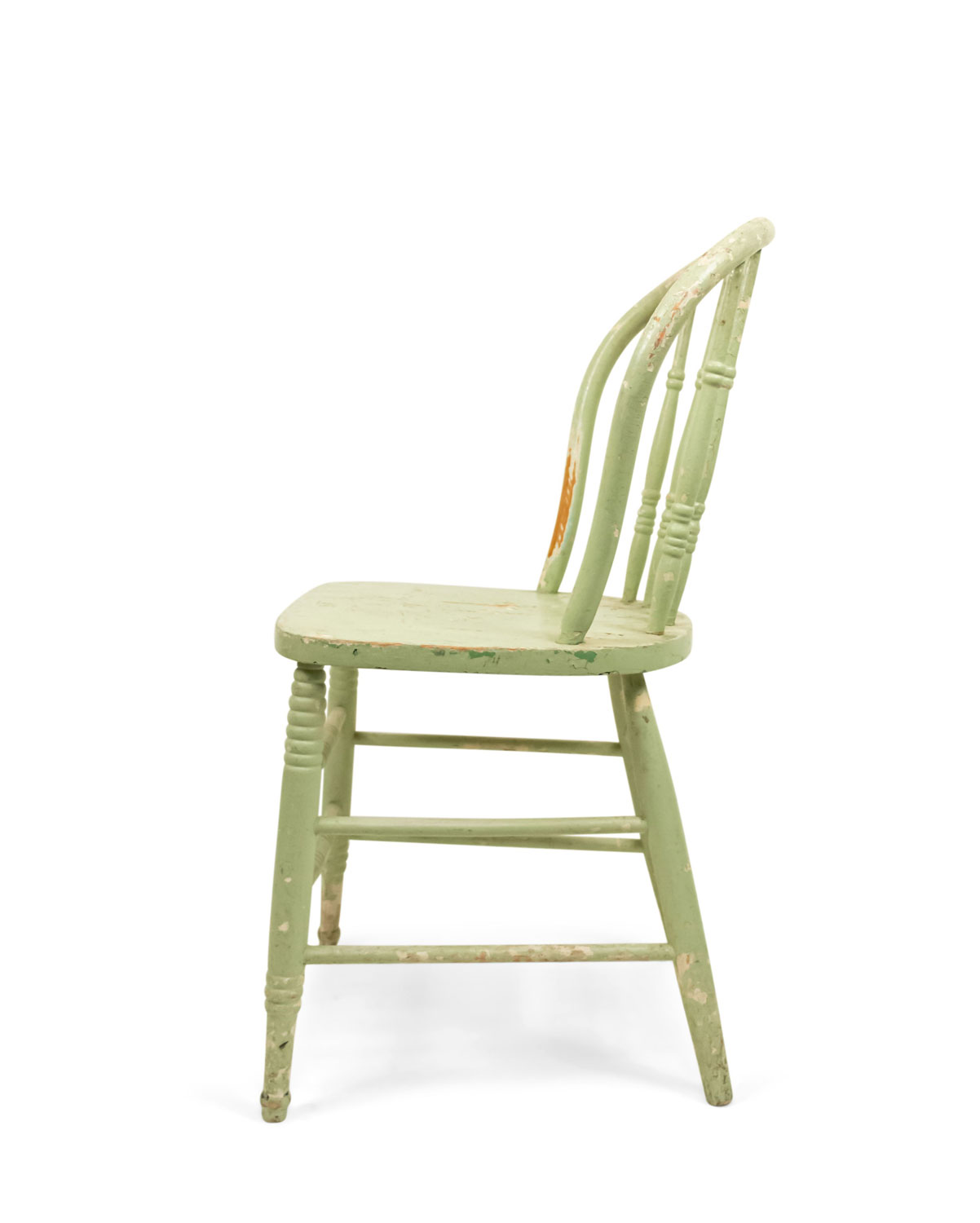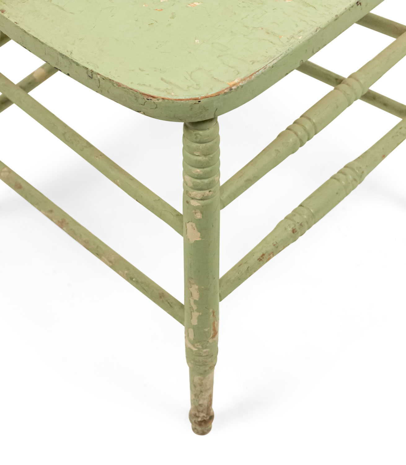 3 American Country style (19/20th Cent) antique green painted side chairs with a spindles and a hoop design back having a double stretcher. (PRICED EACH).