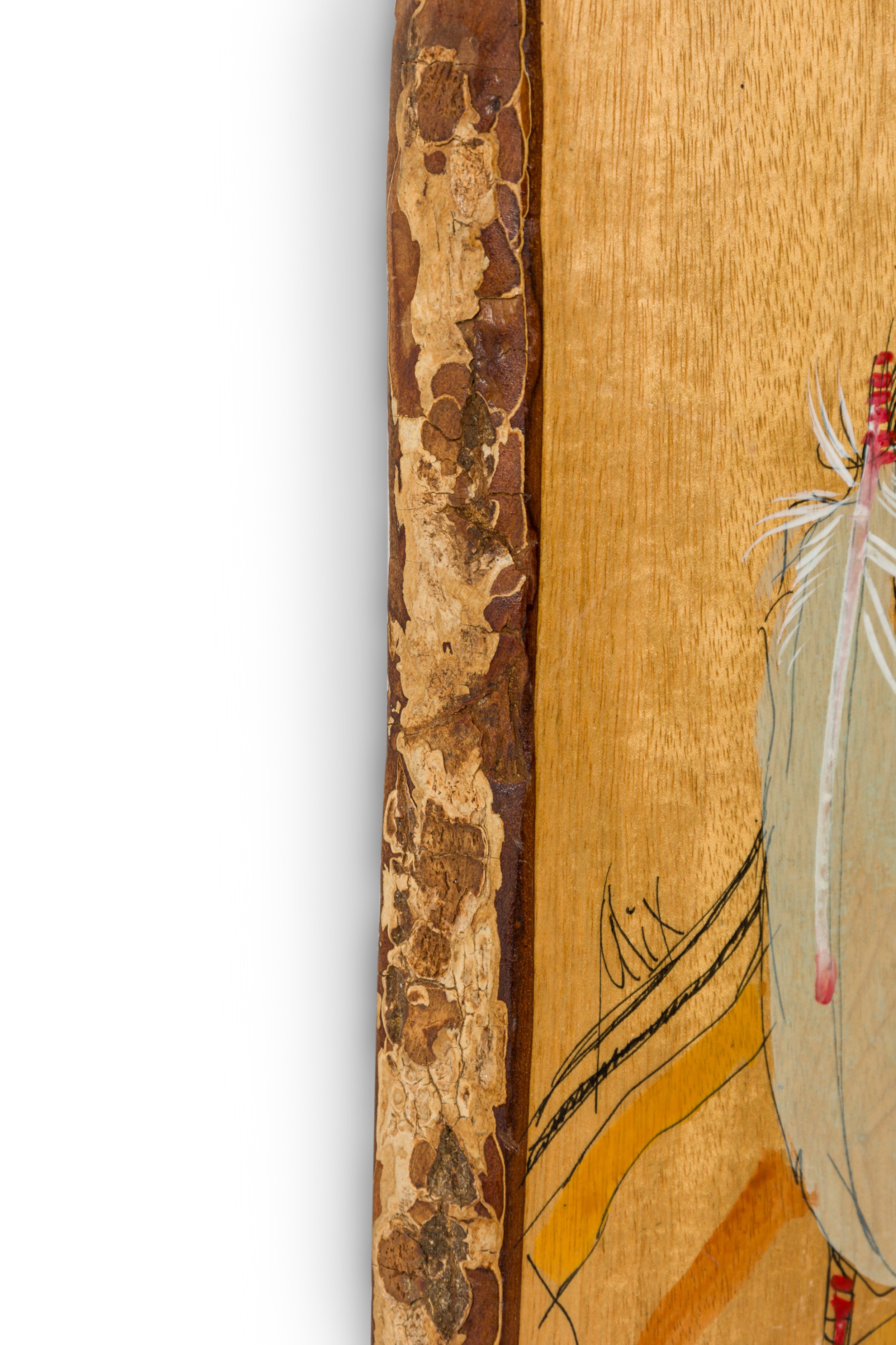 Vintage American watercolor and ink on myrtlewood board (wall plaque) portait of a Native American tribe leader (Nez Perce Tribe) named Chief Joseph wearing traditional clothing and an eagle feather in his hair (ALIX MOSIEUR)