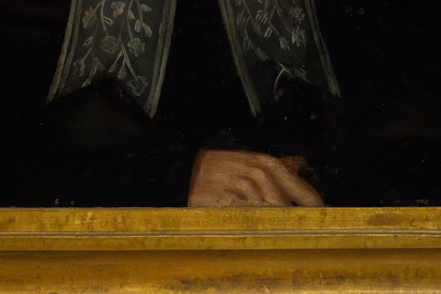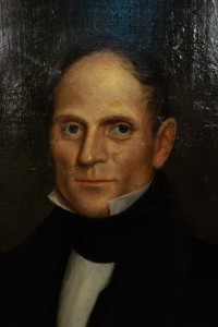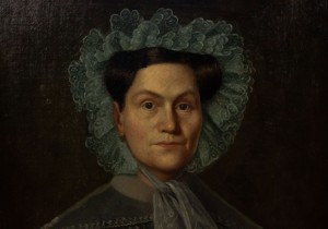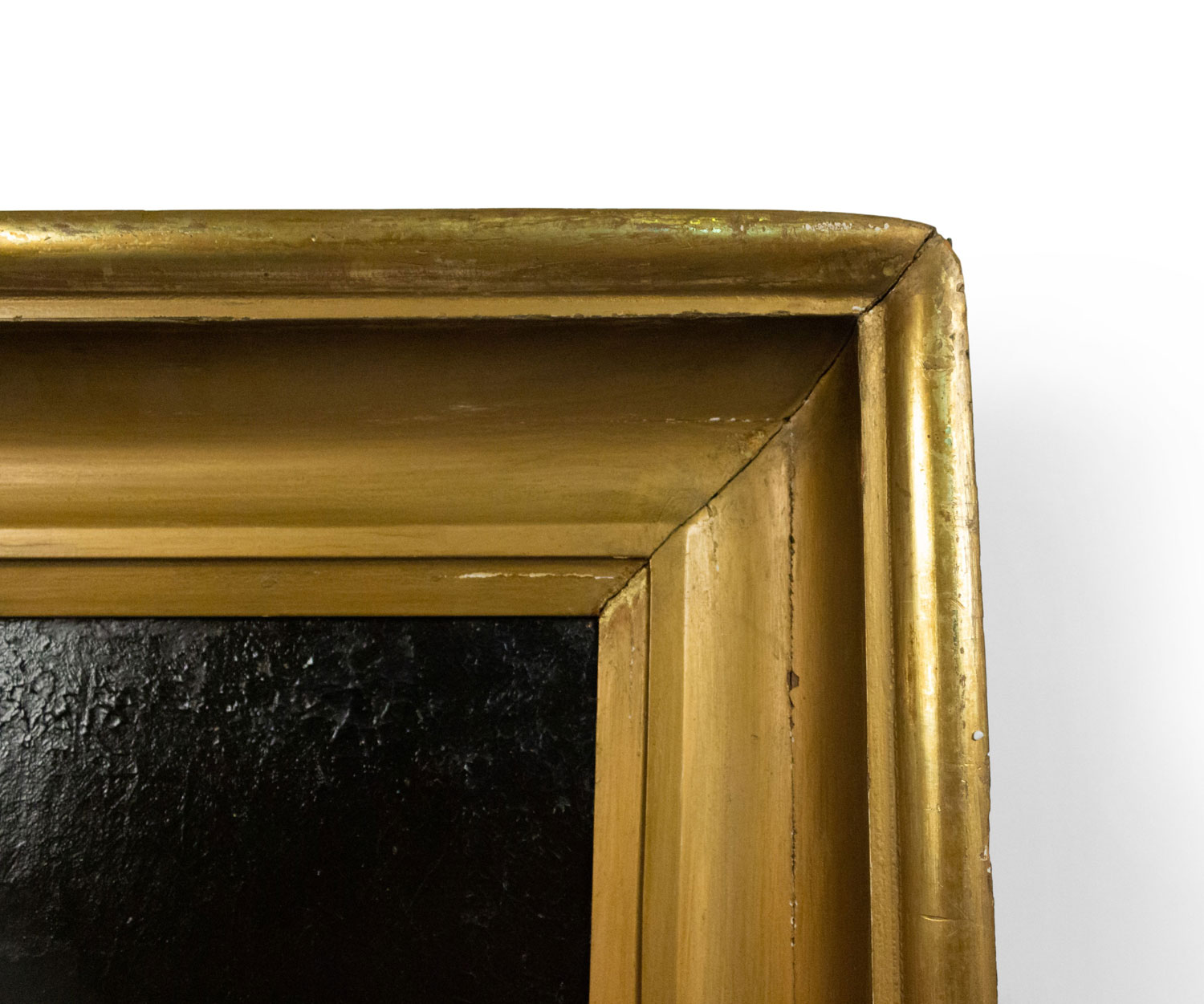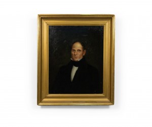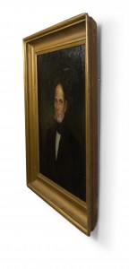 PAIR of American Country gilt framed oil paintings portraits of lady in lace and man with black collar (19th Cent)
