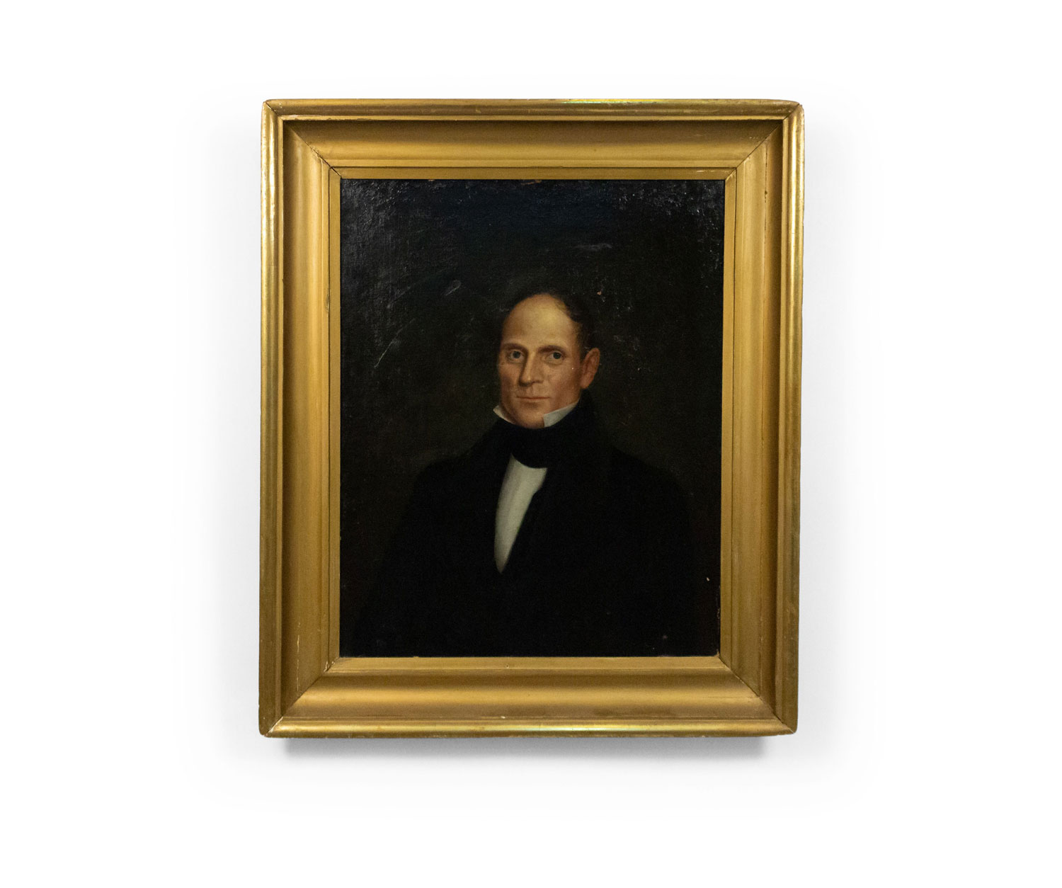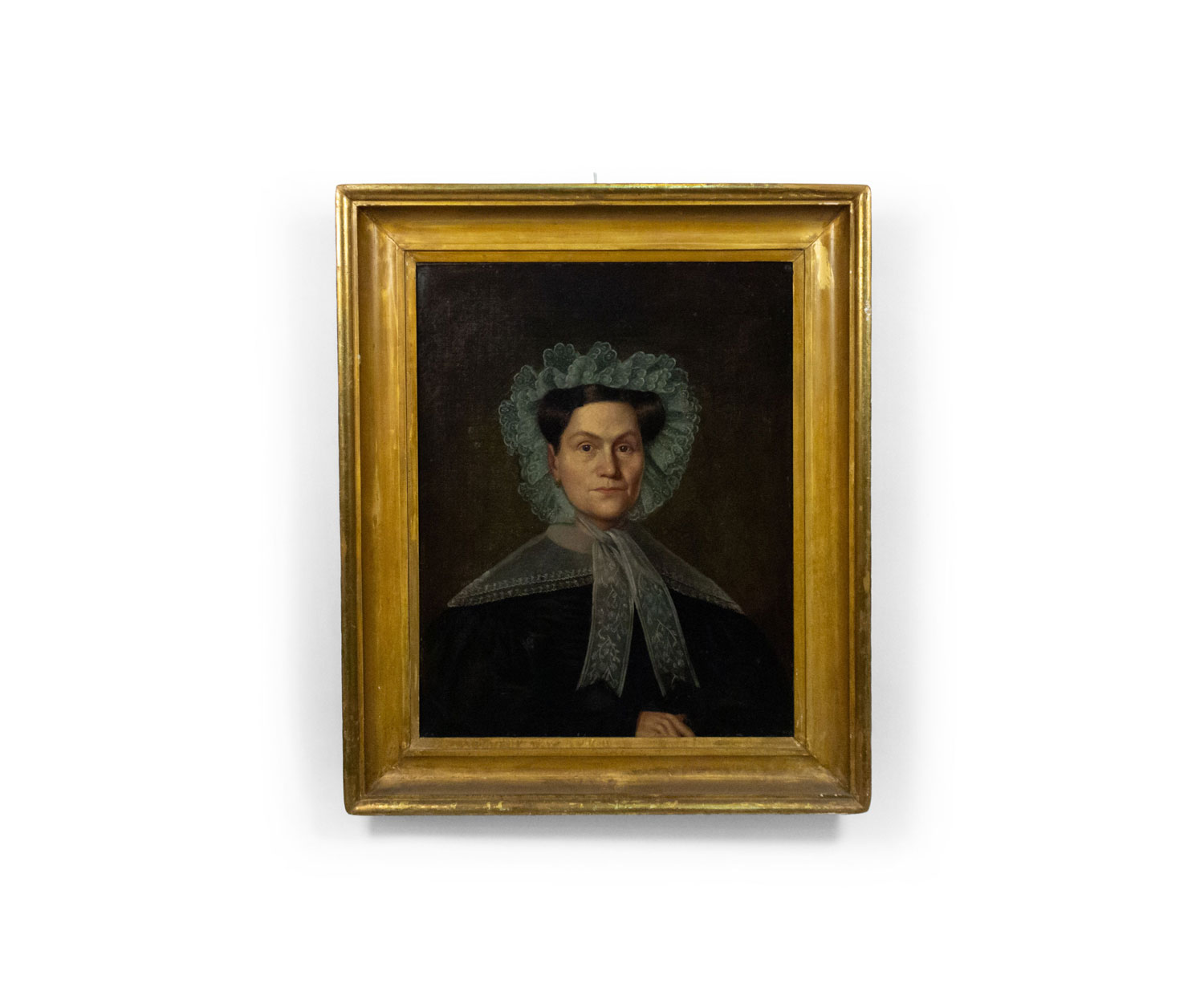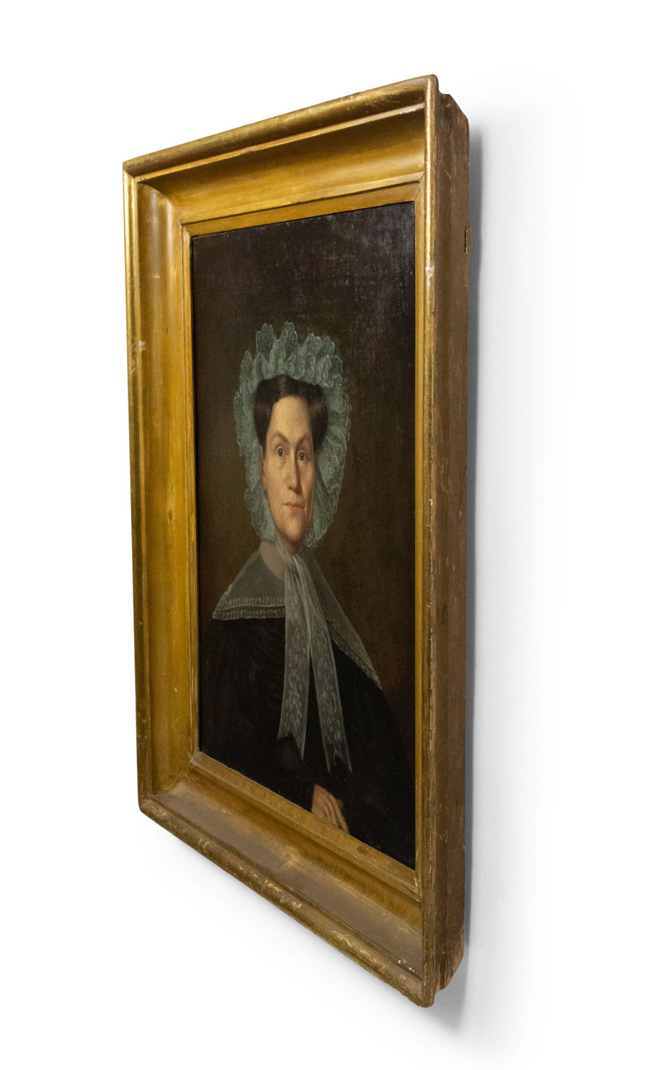 PAIR of American Country gilt framed oil paintings portraits of lady in lace and man with black collar (19th Cent).
