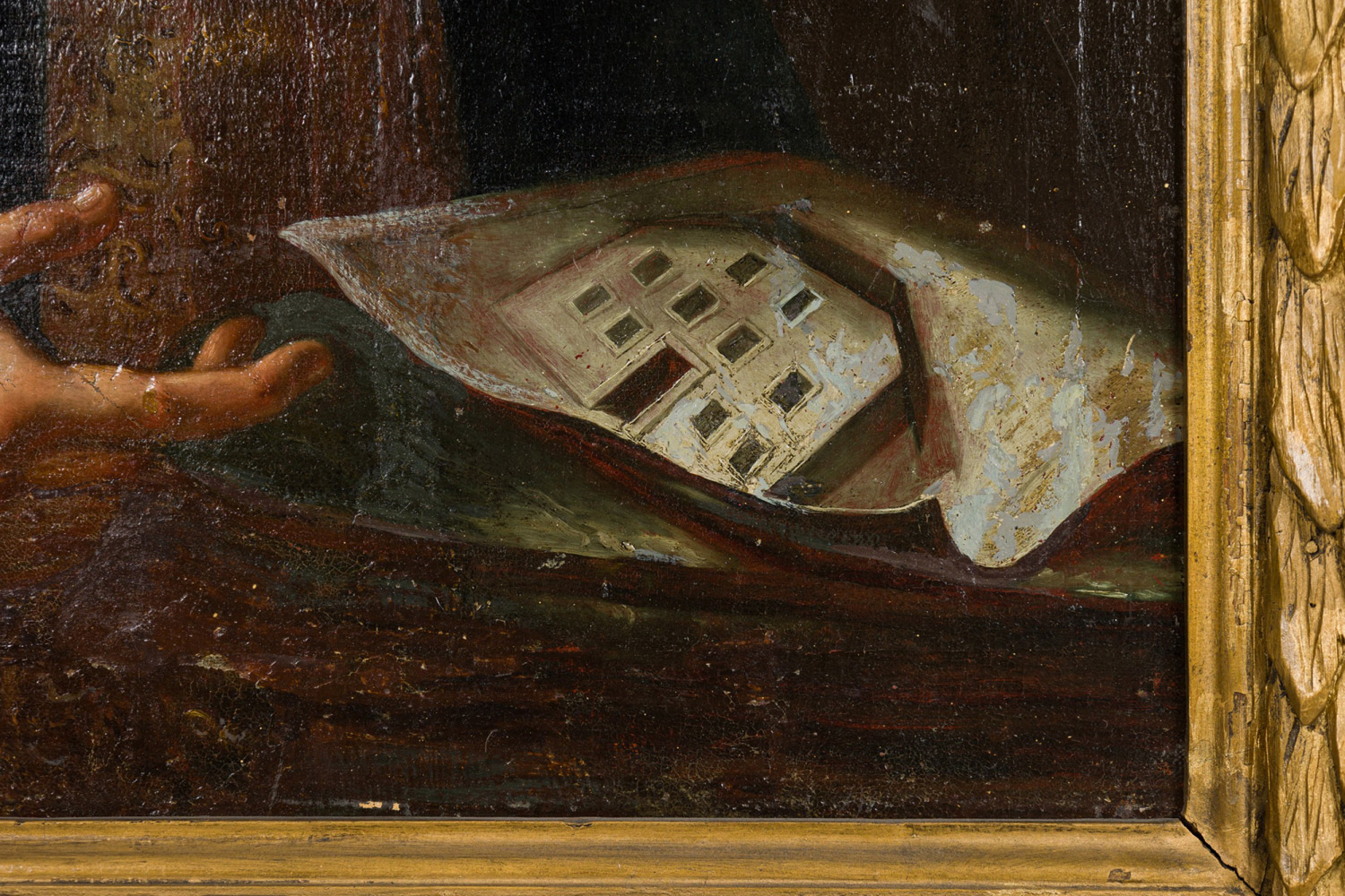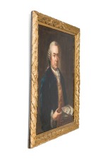 American gilt framed oil painting portrait of 18th Century man in blue coat with picture of house..