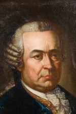 American gilt framed oil painting portrait of 18th Century man in blue coat with picture of house.