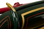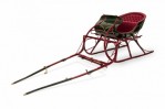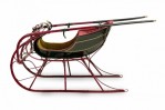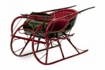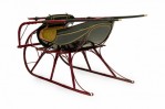 American (19th Century) sleigh with swell-sided, rounded-rectangular body painted in glossy green and red finish with interior plush, upholstered red seat and moss-carpeted bottom. Painted gilt stripe detailing brass hawk head pull stays. (Attributed to James Goold of Albany, New York circa 1830).