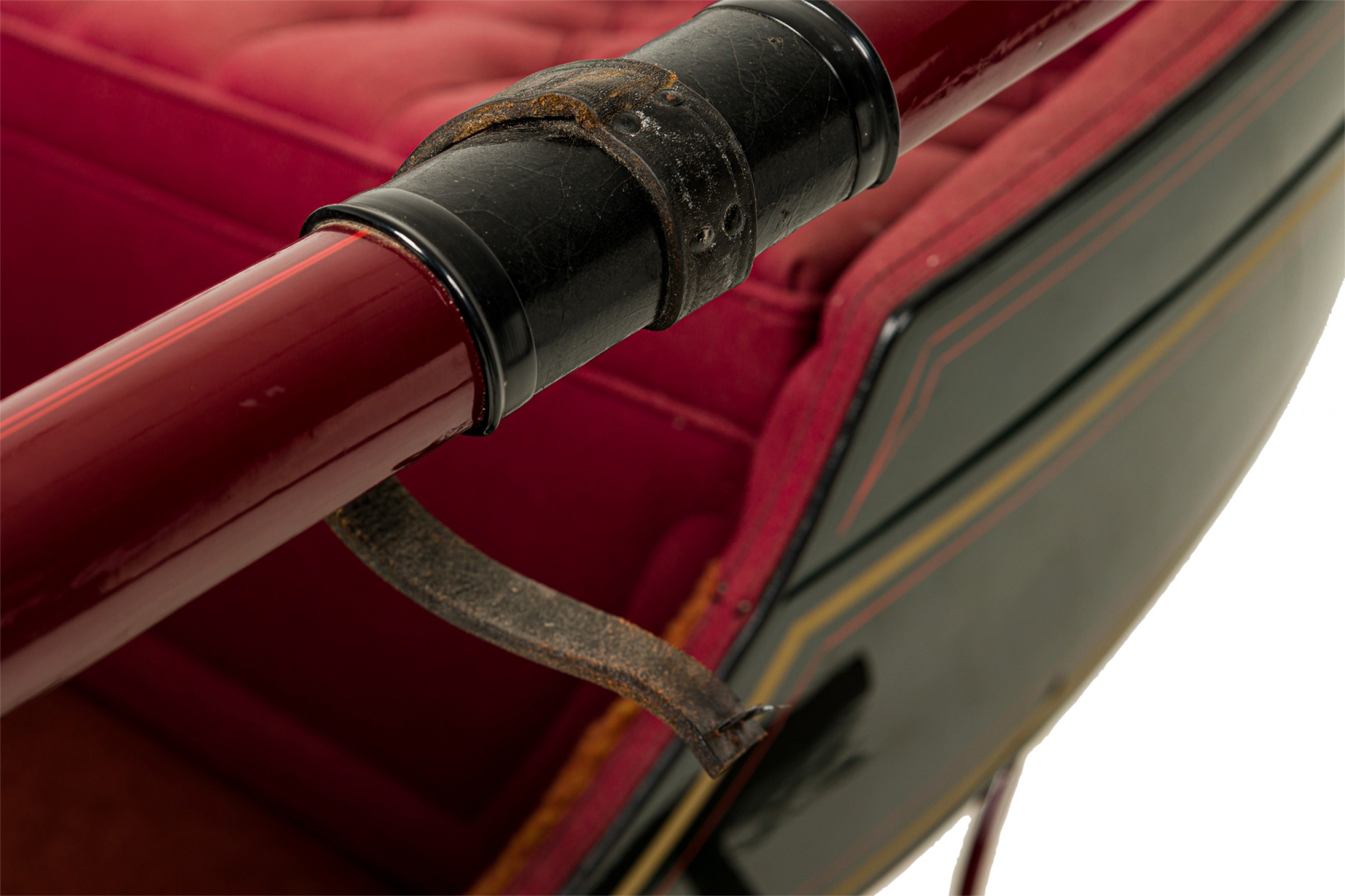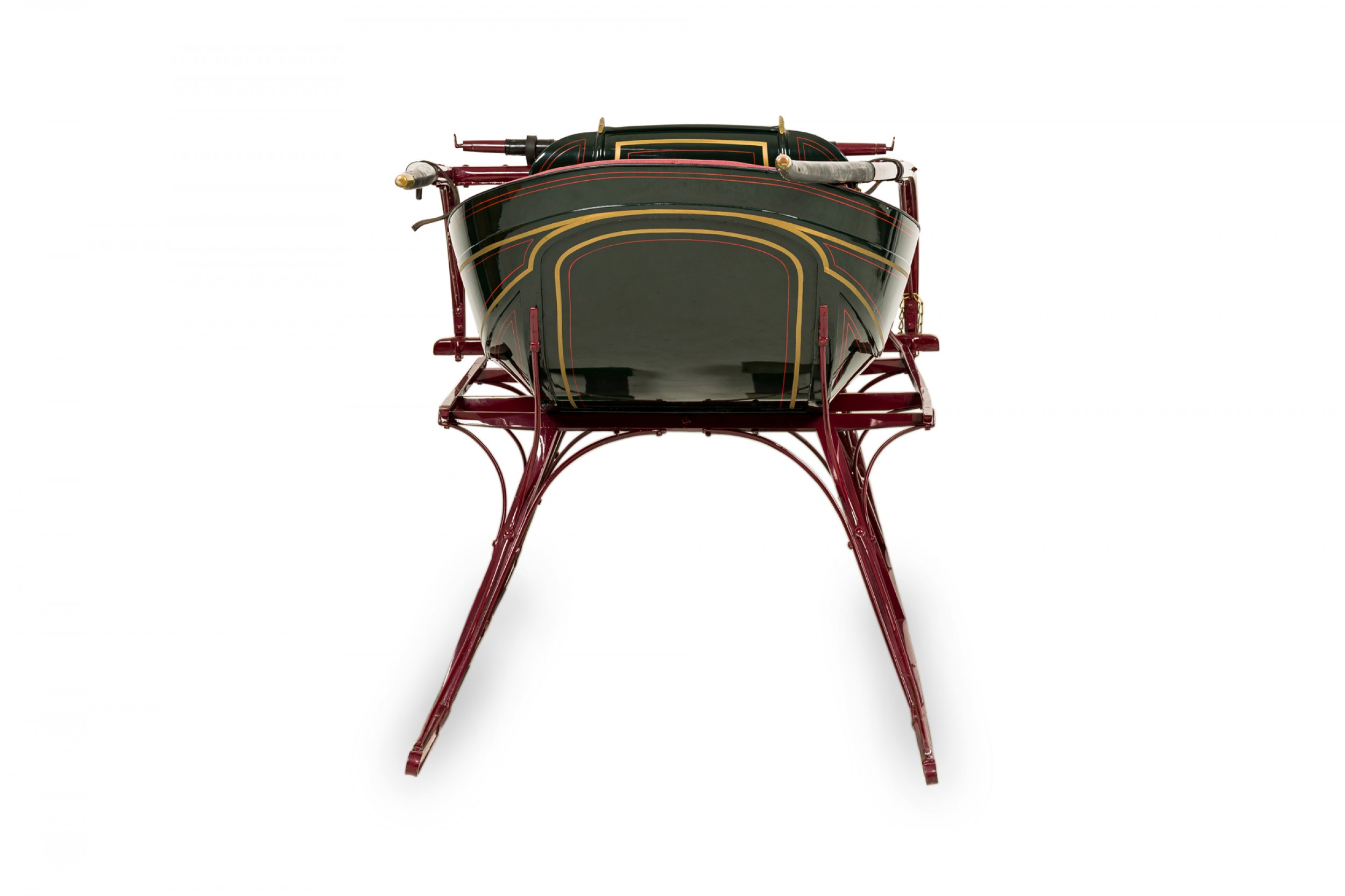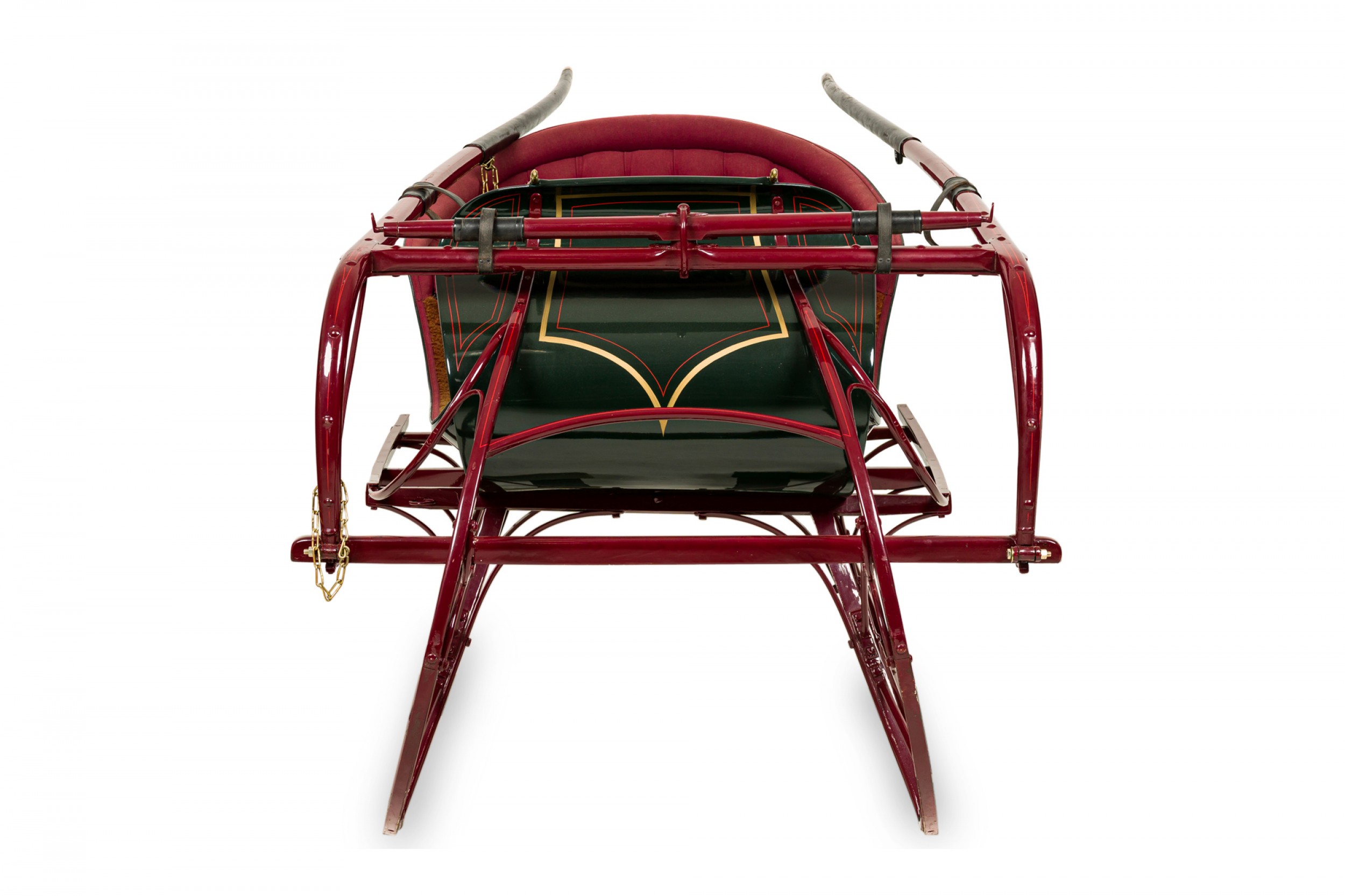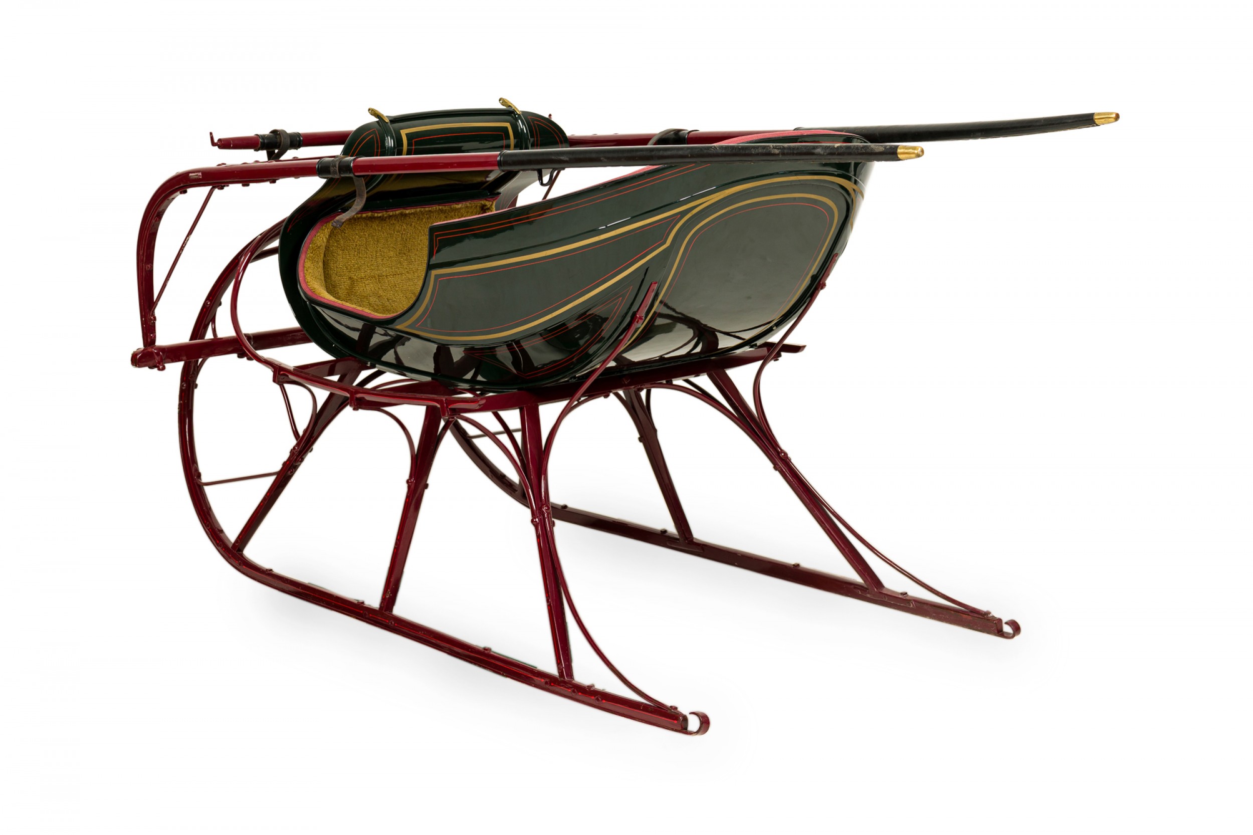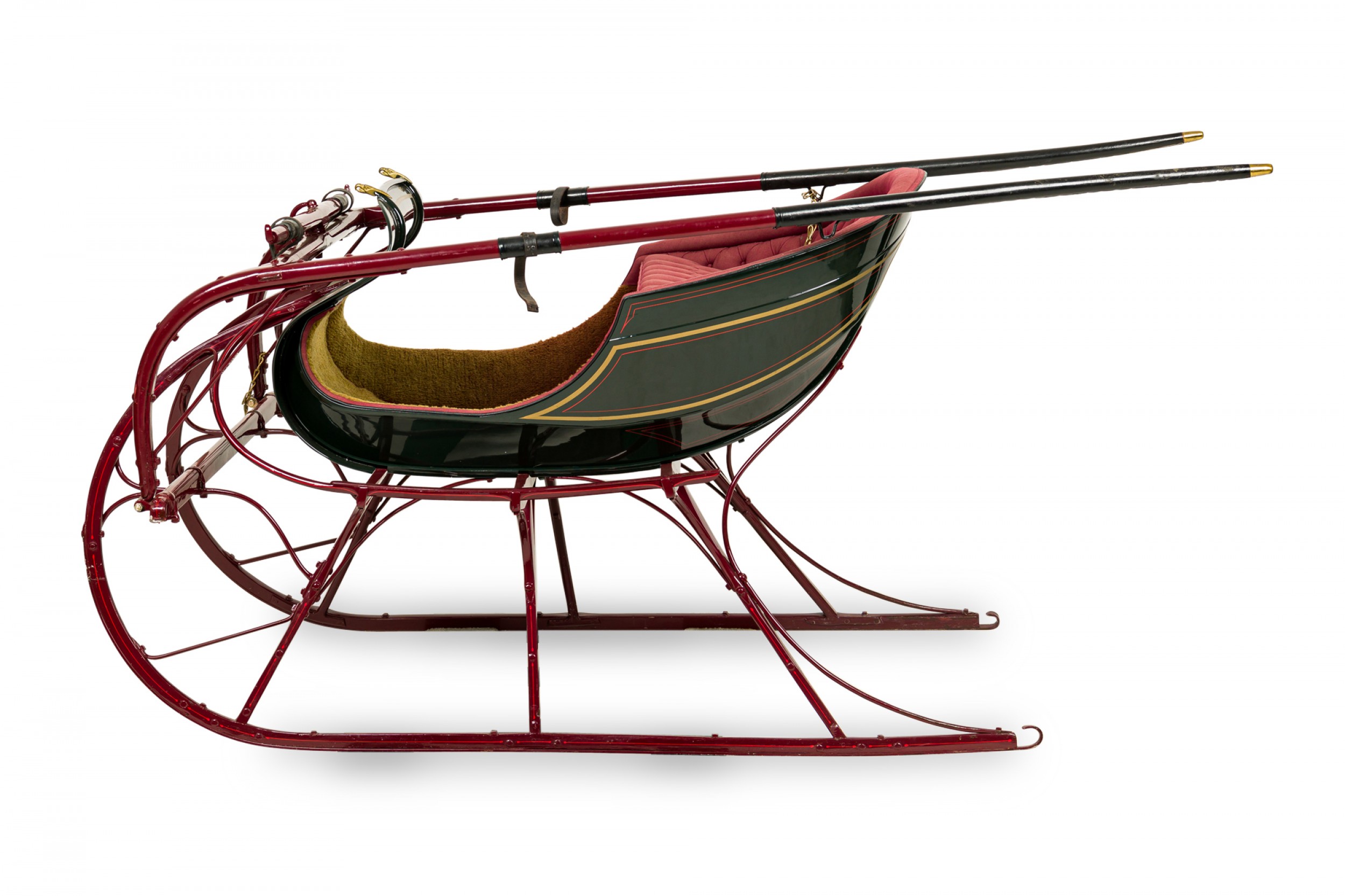 American (19th Century) sleigh with swell-sided, rounded-rectangular body painted in glossy green and red finish with interior plush, upholstered red seat and moss-carpeted bottom. Painted gilt stripe detailing brass hawk head pull stays. (Attributed to James Goold of Albany, New York circa 1830)