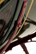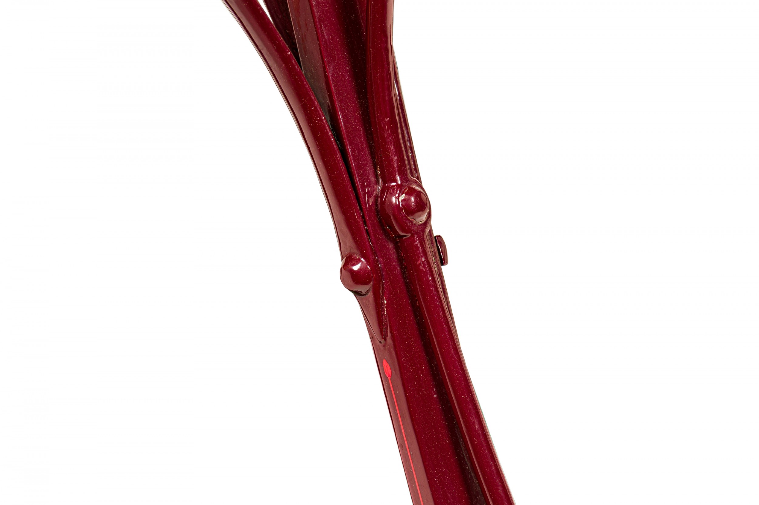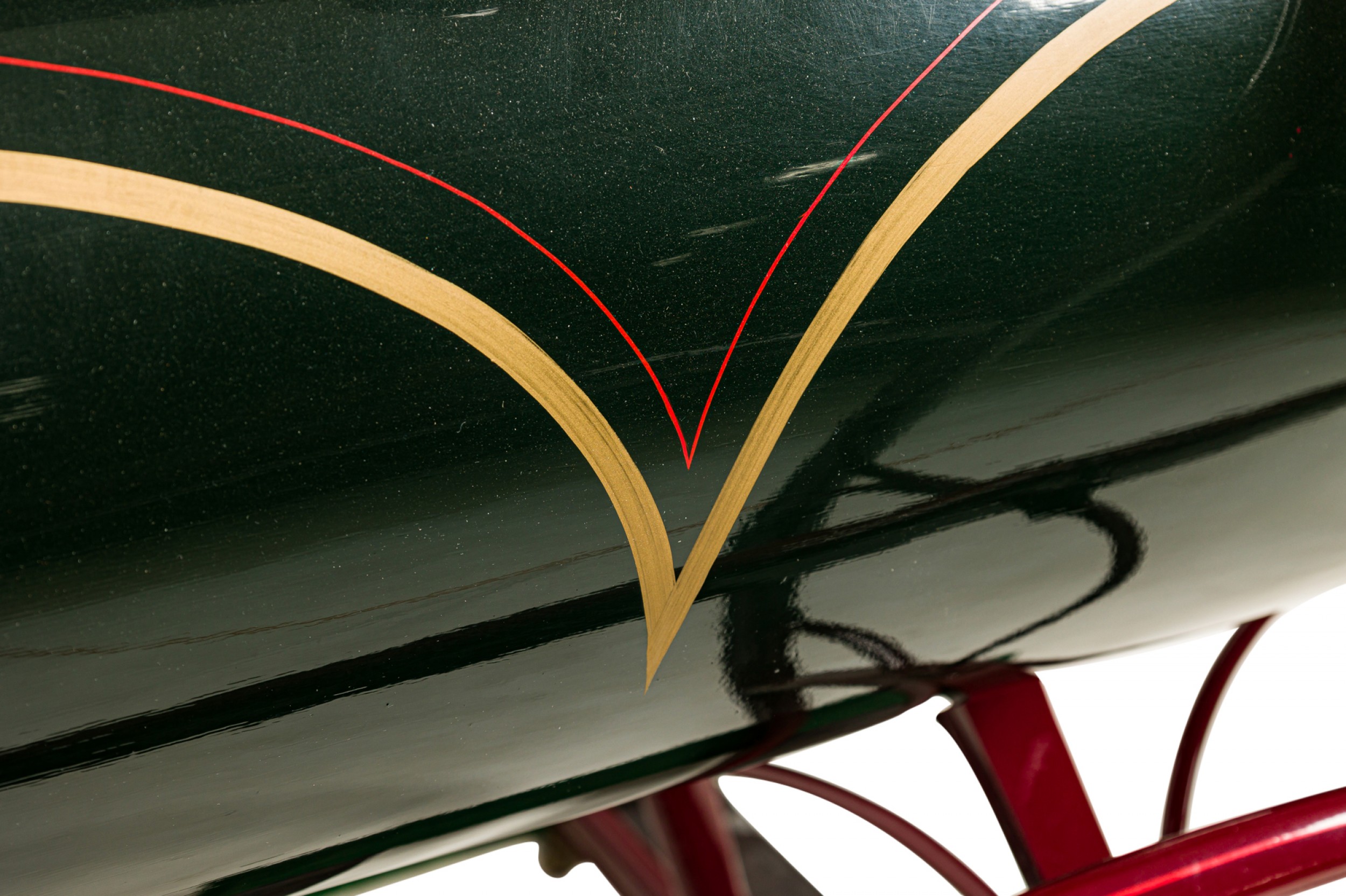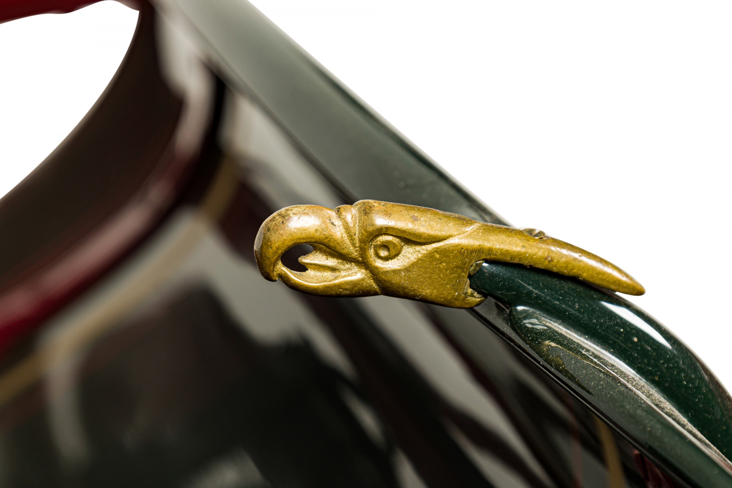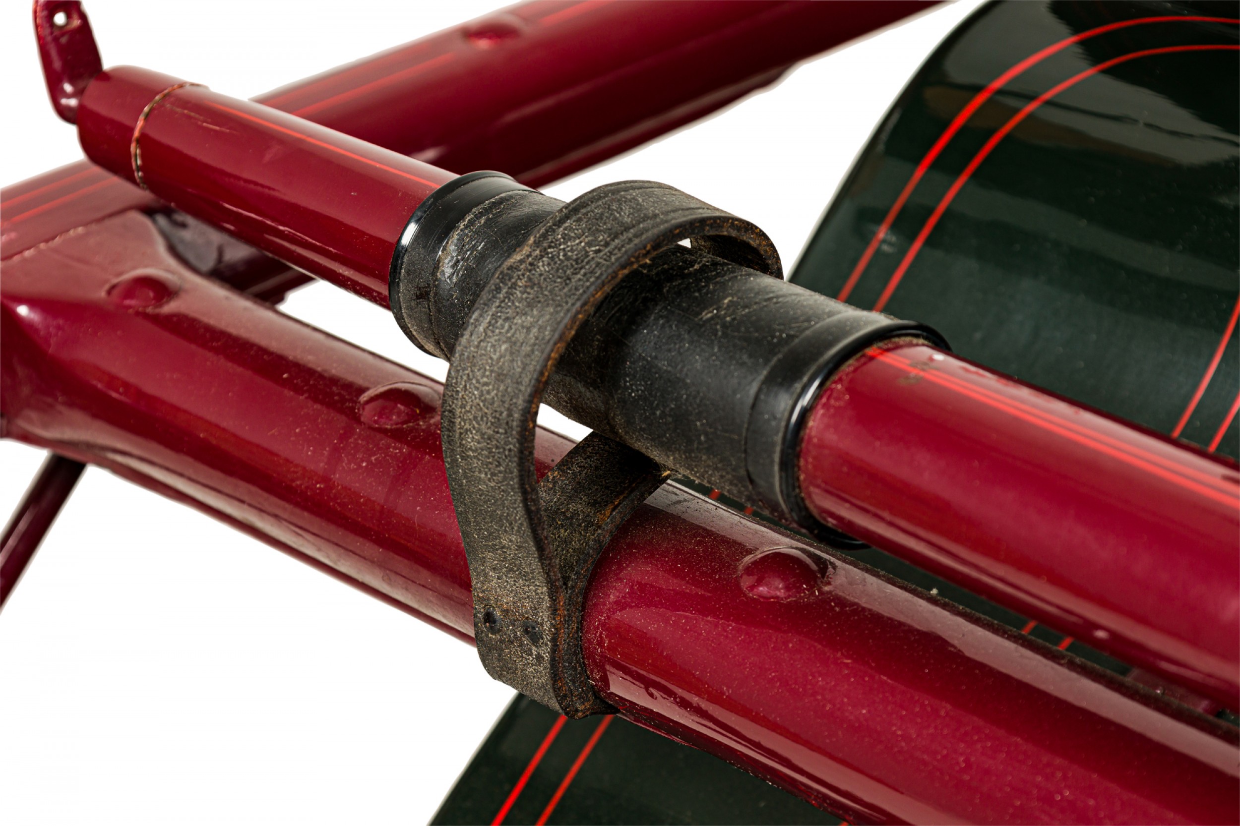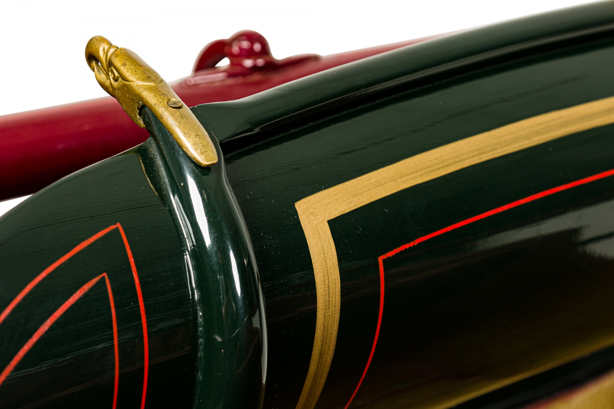 American (19th Century) sleigh with swell-sided, rounded-rectangular body painted in glossy green and red finish with interior plush, upholstered red seat and moss-carpeted bottom. Painted gilt stripe detailing brass hawk head pull stays. (Attributed to James Goold of Albany, New York circa 1830)