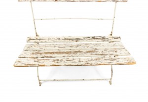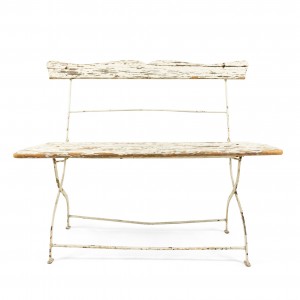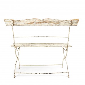 American Country style Outdoor folding iron loveseat with a weathered white painted wood slat design seat and single slat back.
