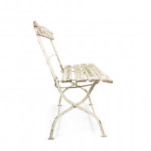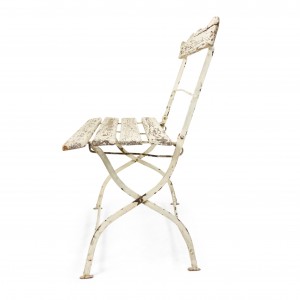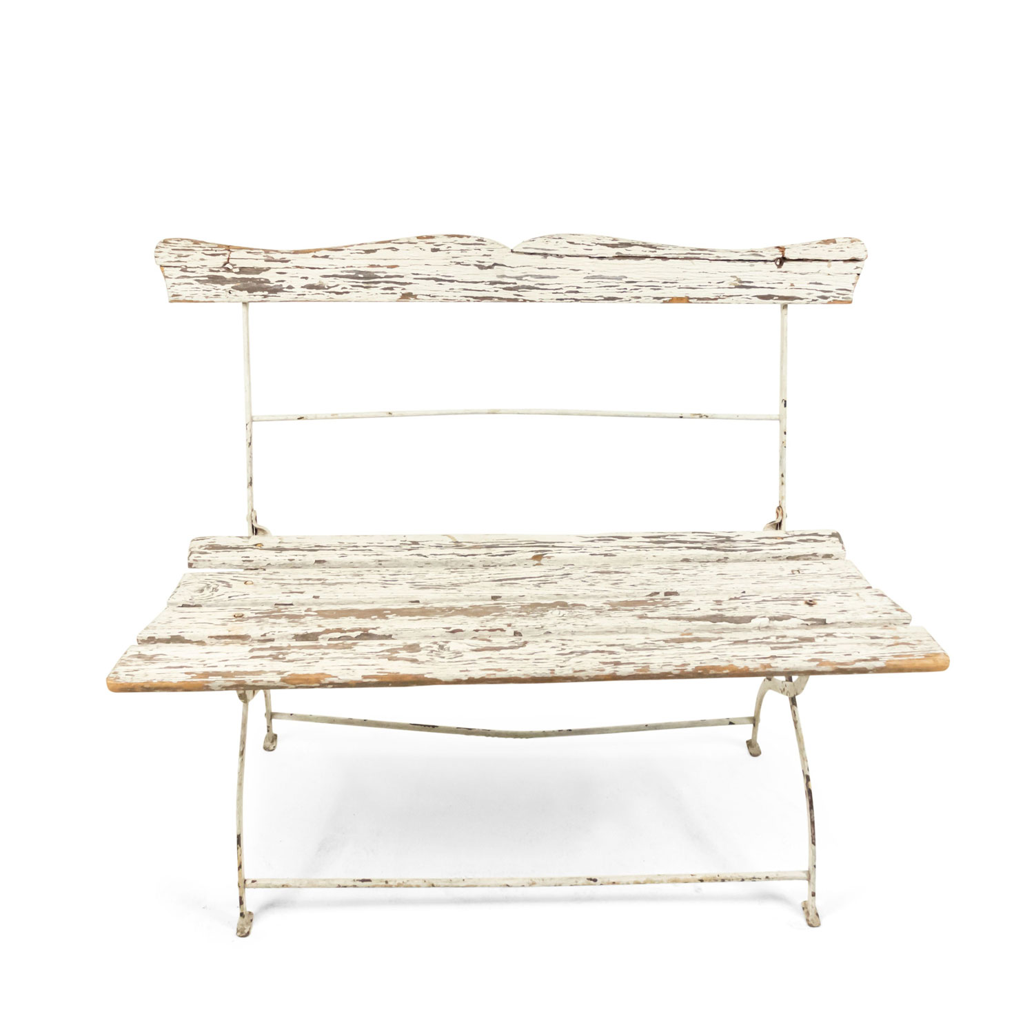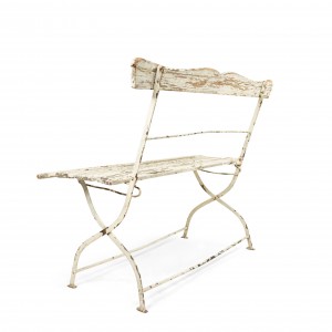 American Country style Outdoor folding iron loveseat with a weathered white painted wood slat design seat and single slat back