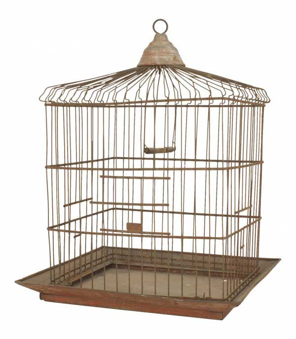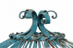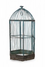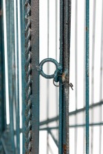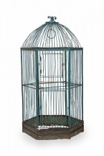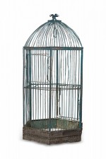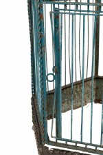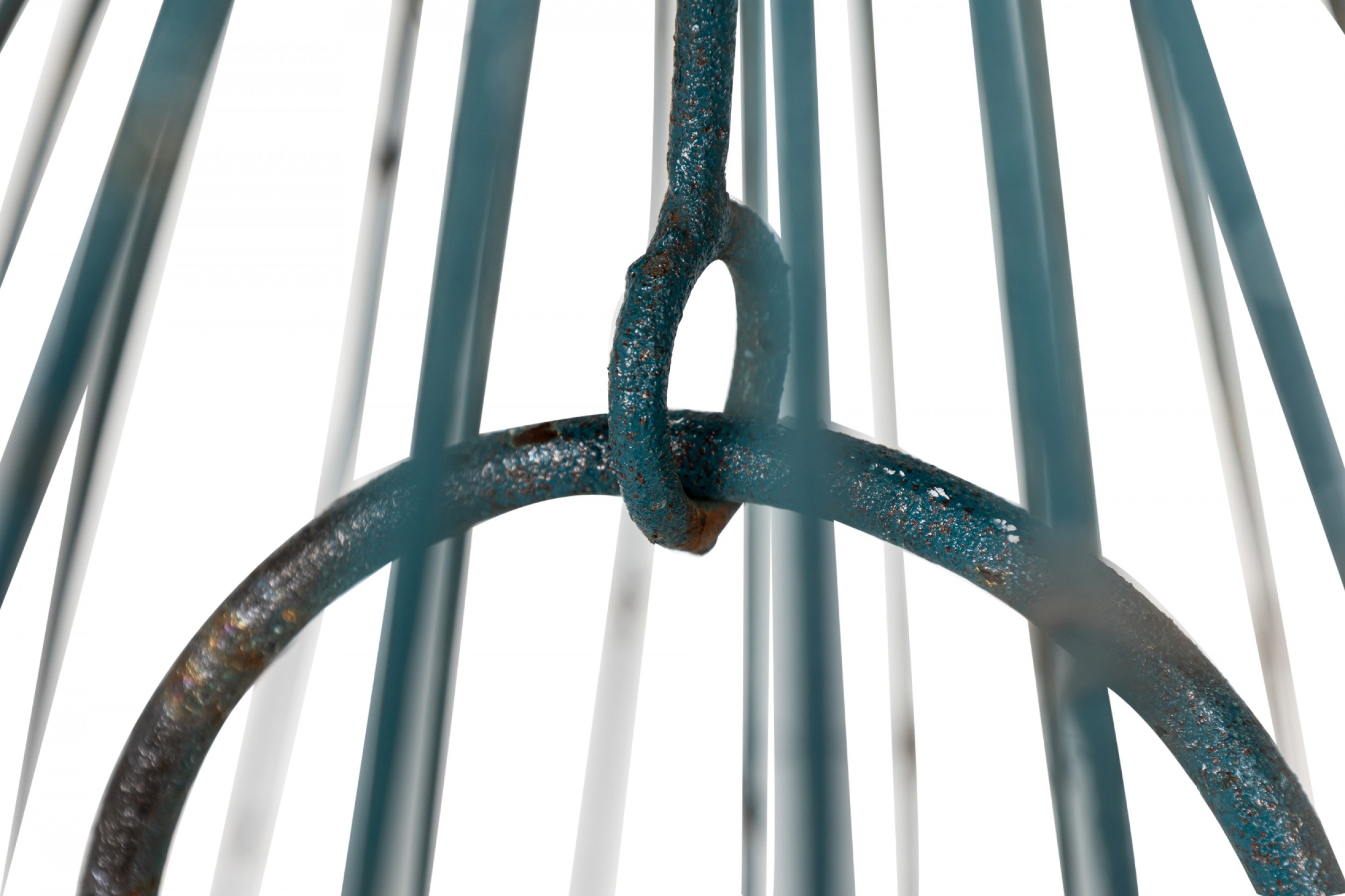American country outdoor birdcage with teal painted metal wire frame and domed roof..