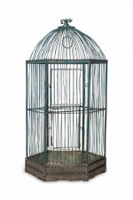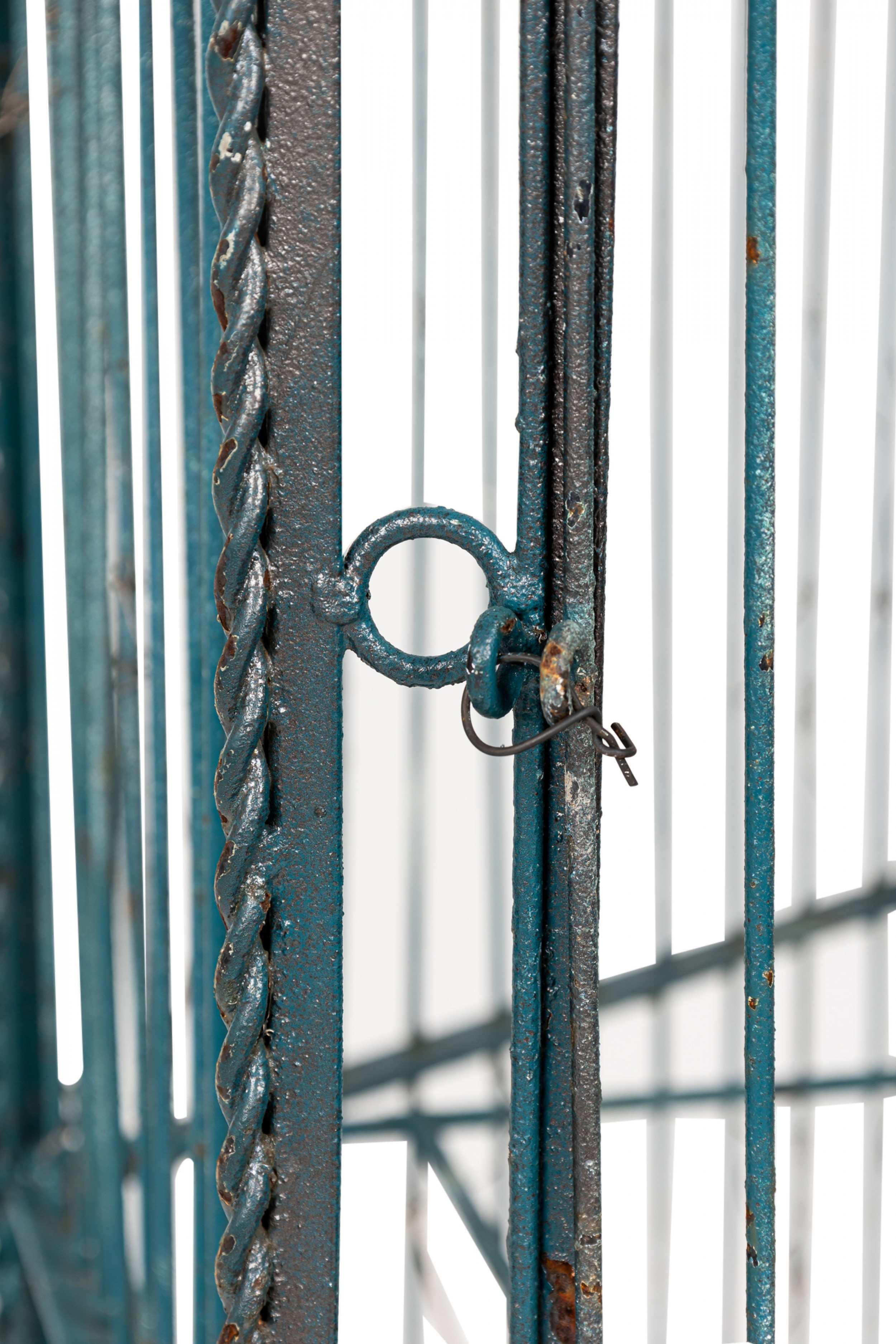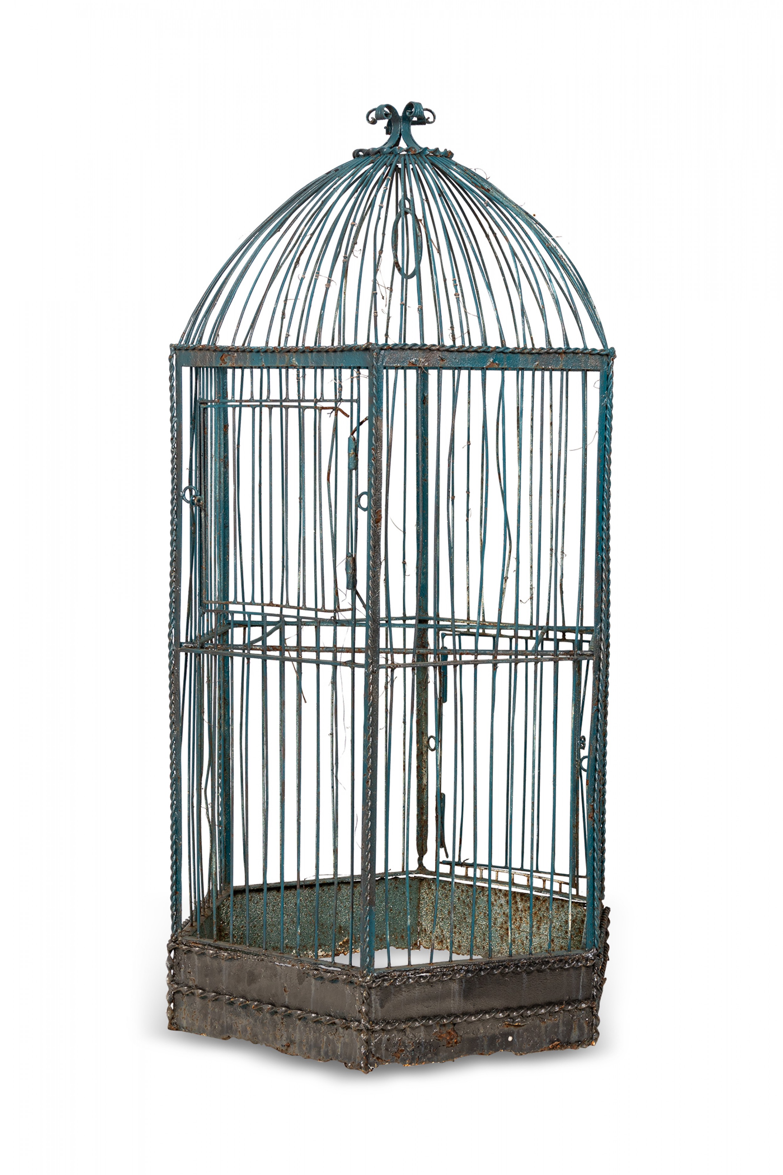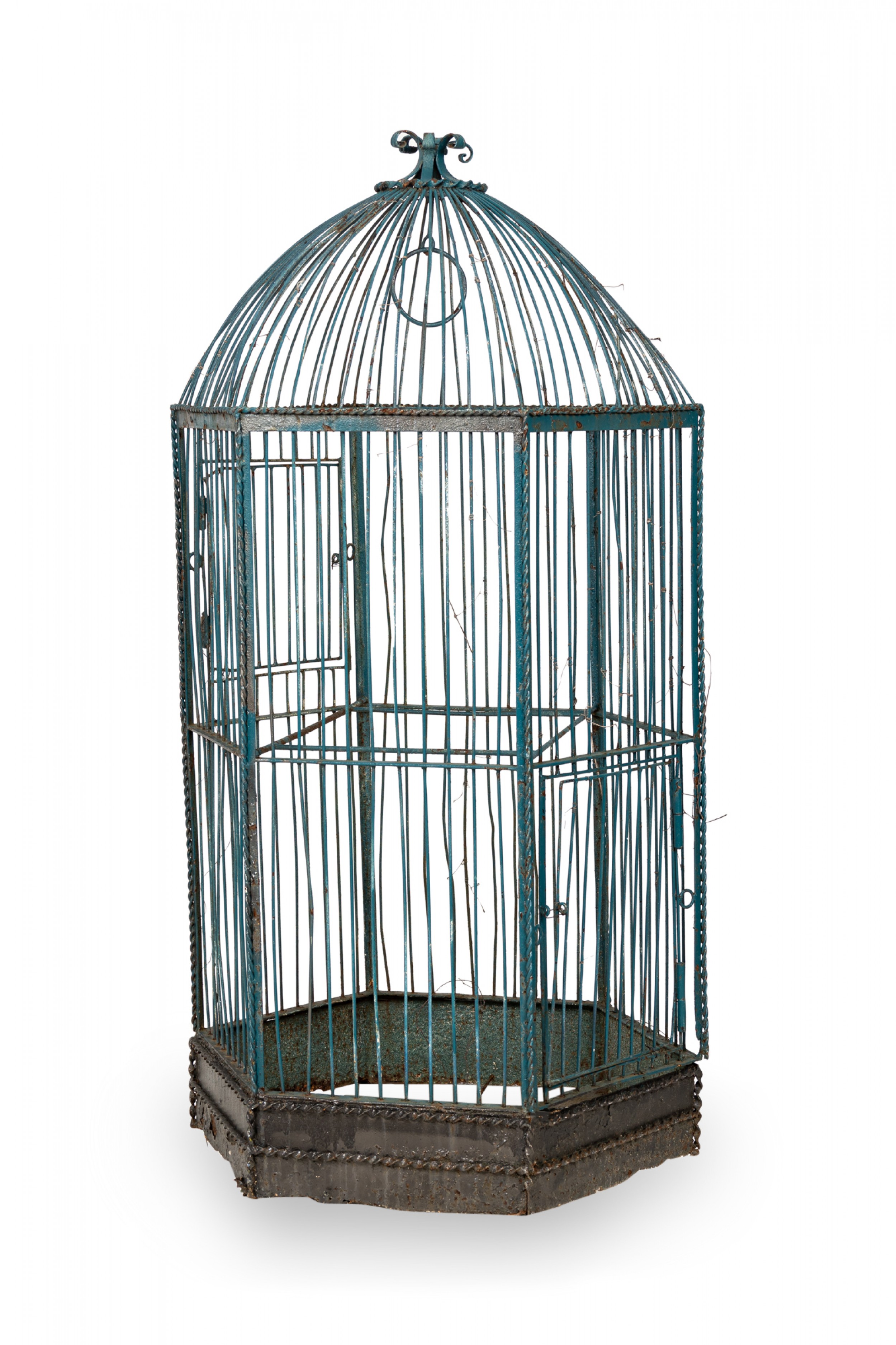 American country outdoor birdcage with teal painted metal wire frame and domed roof.