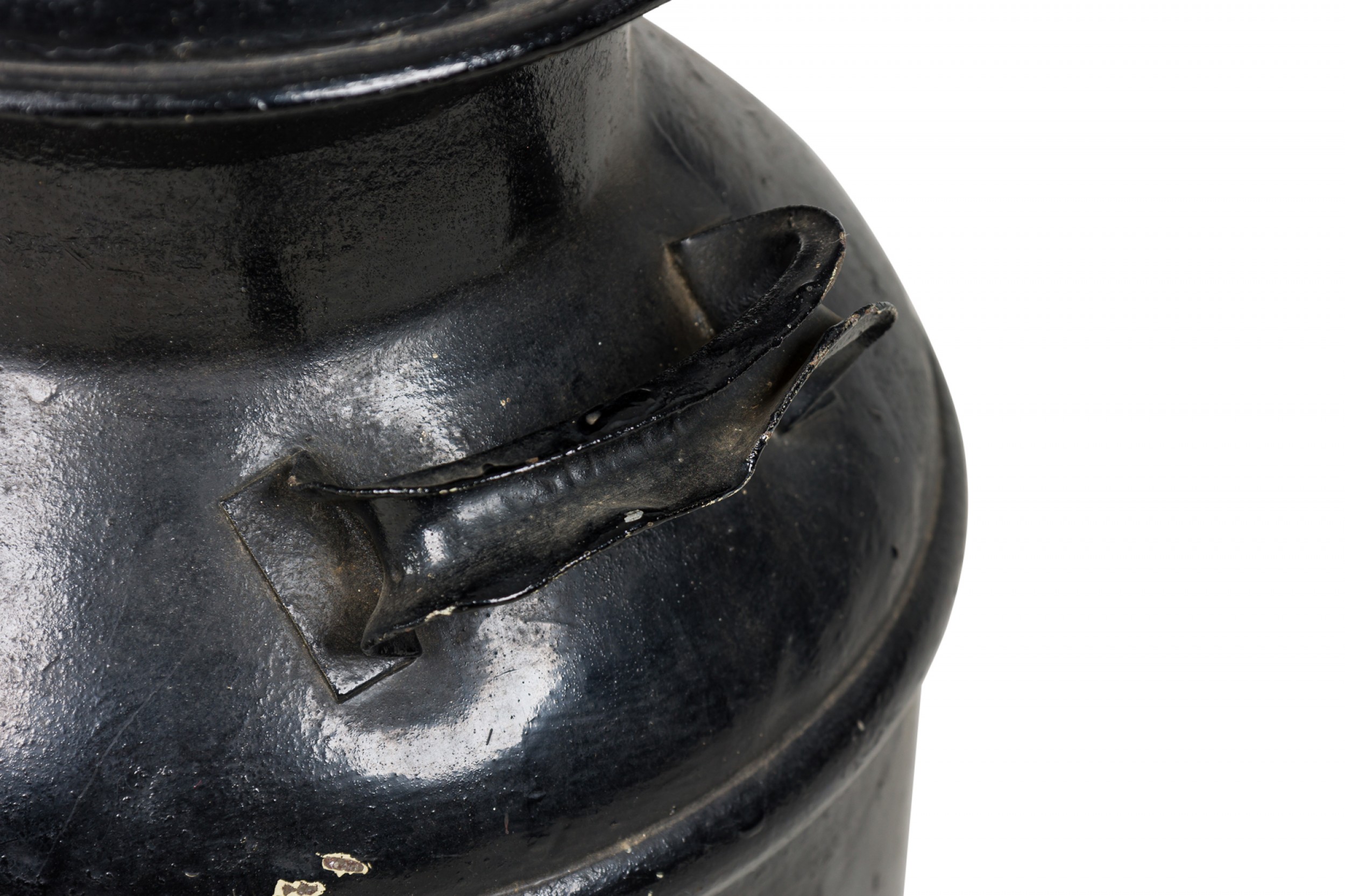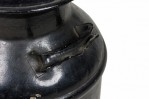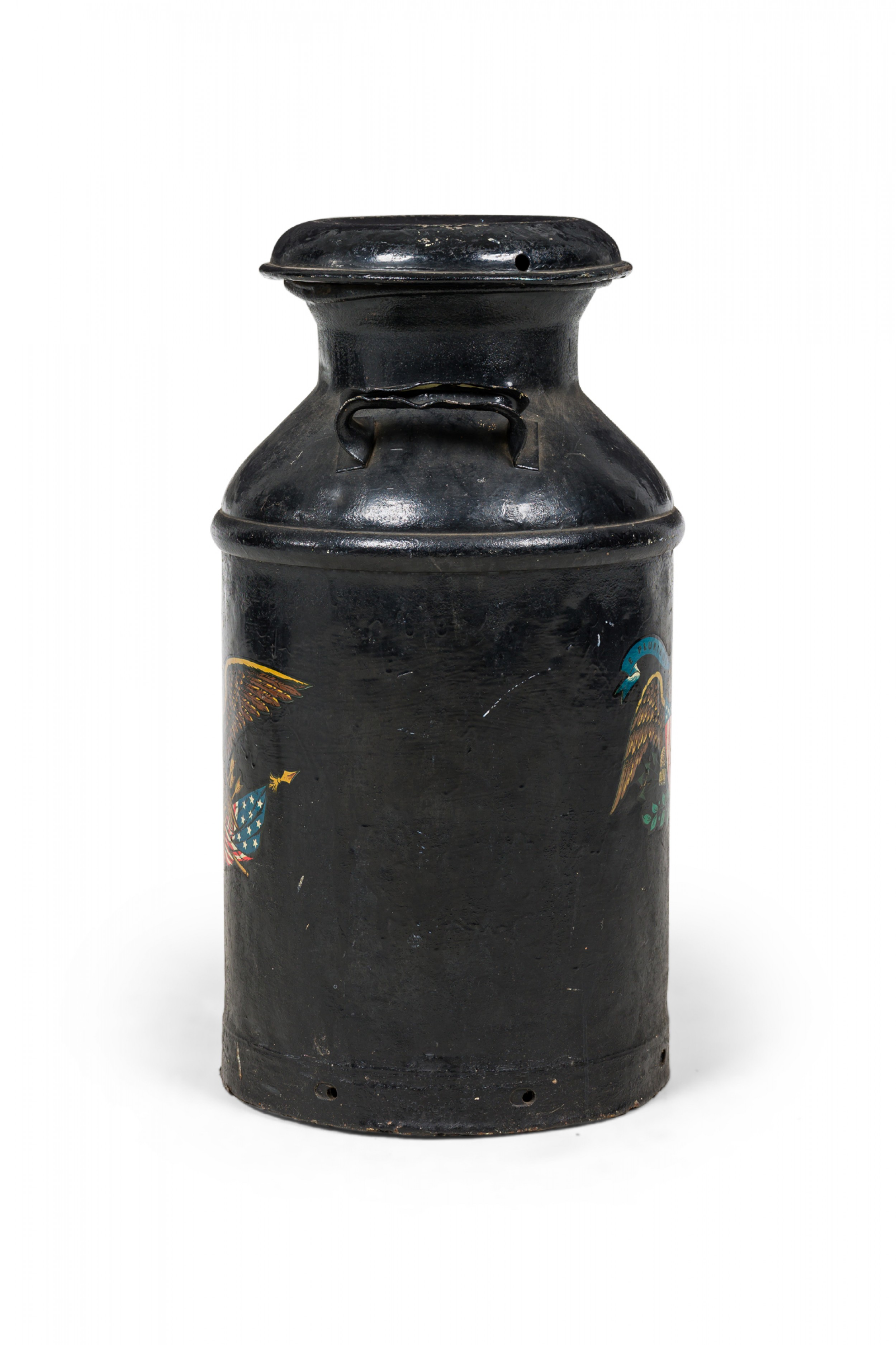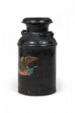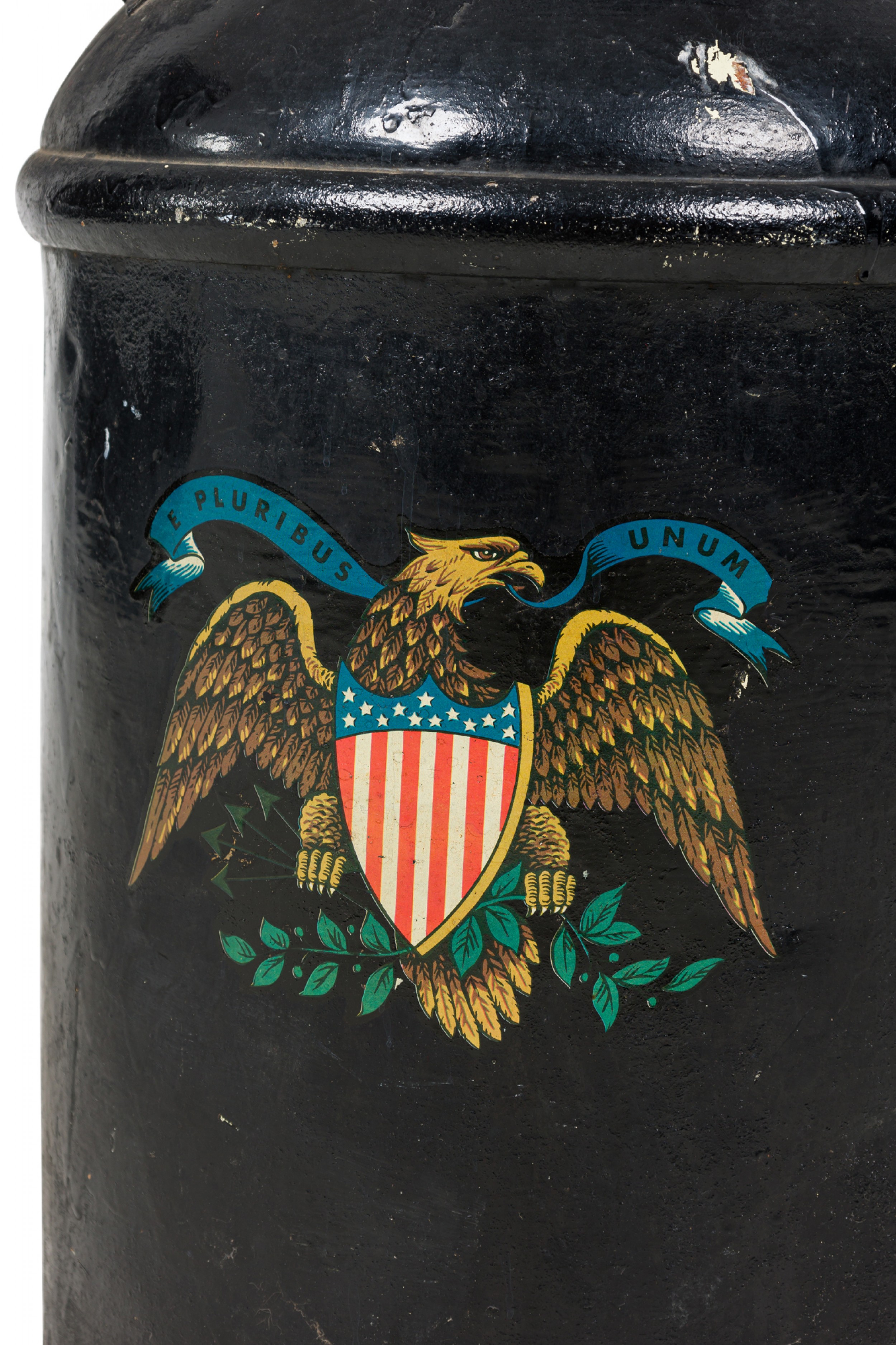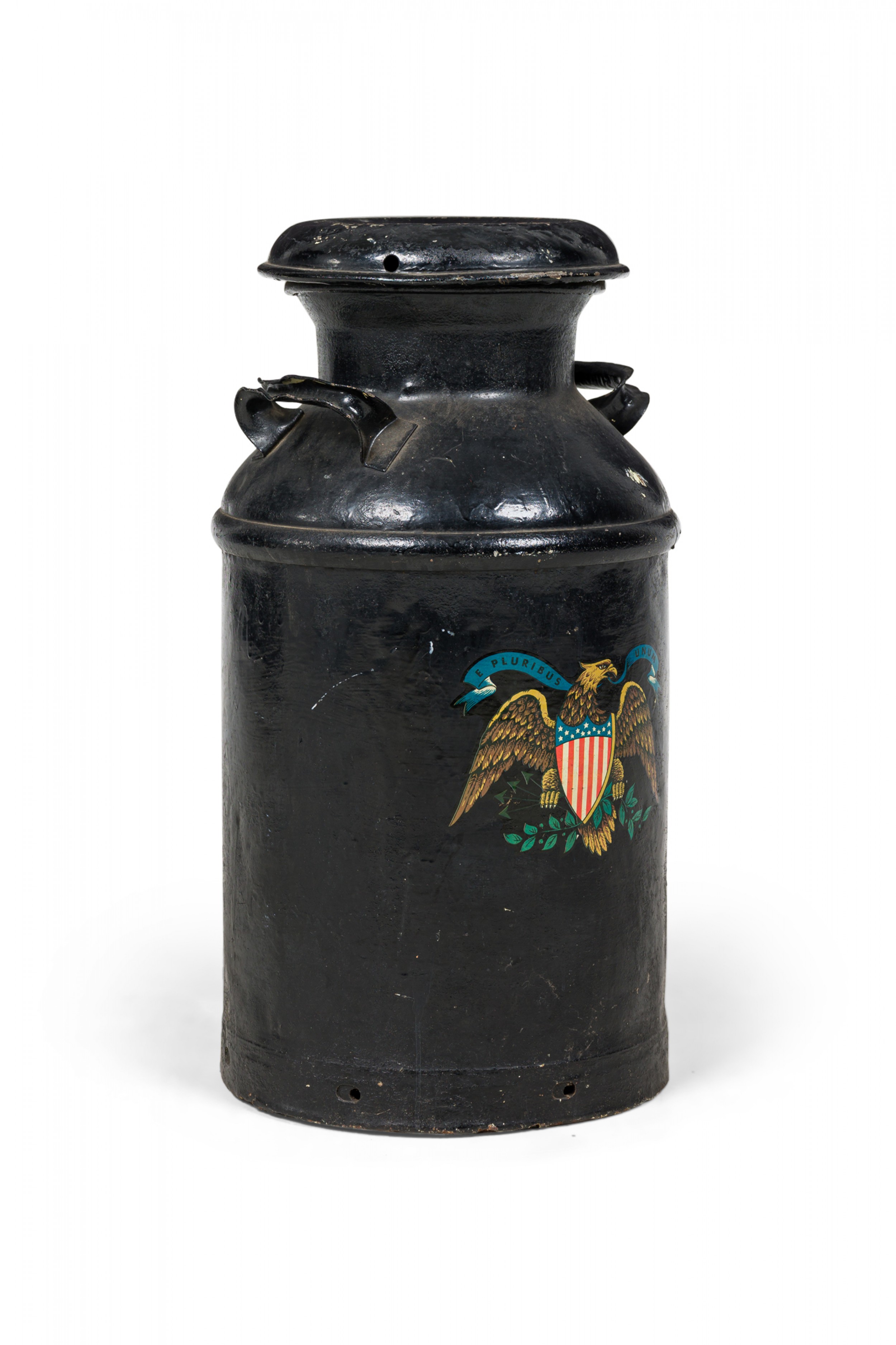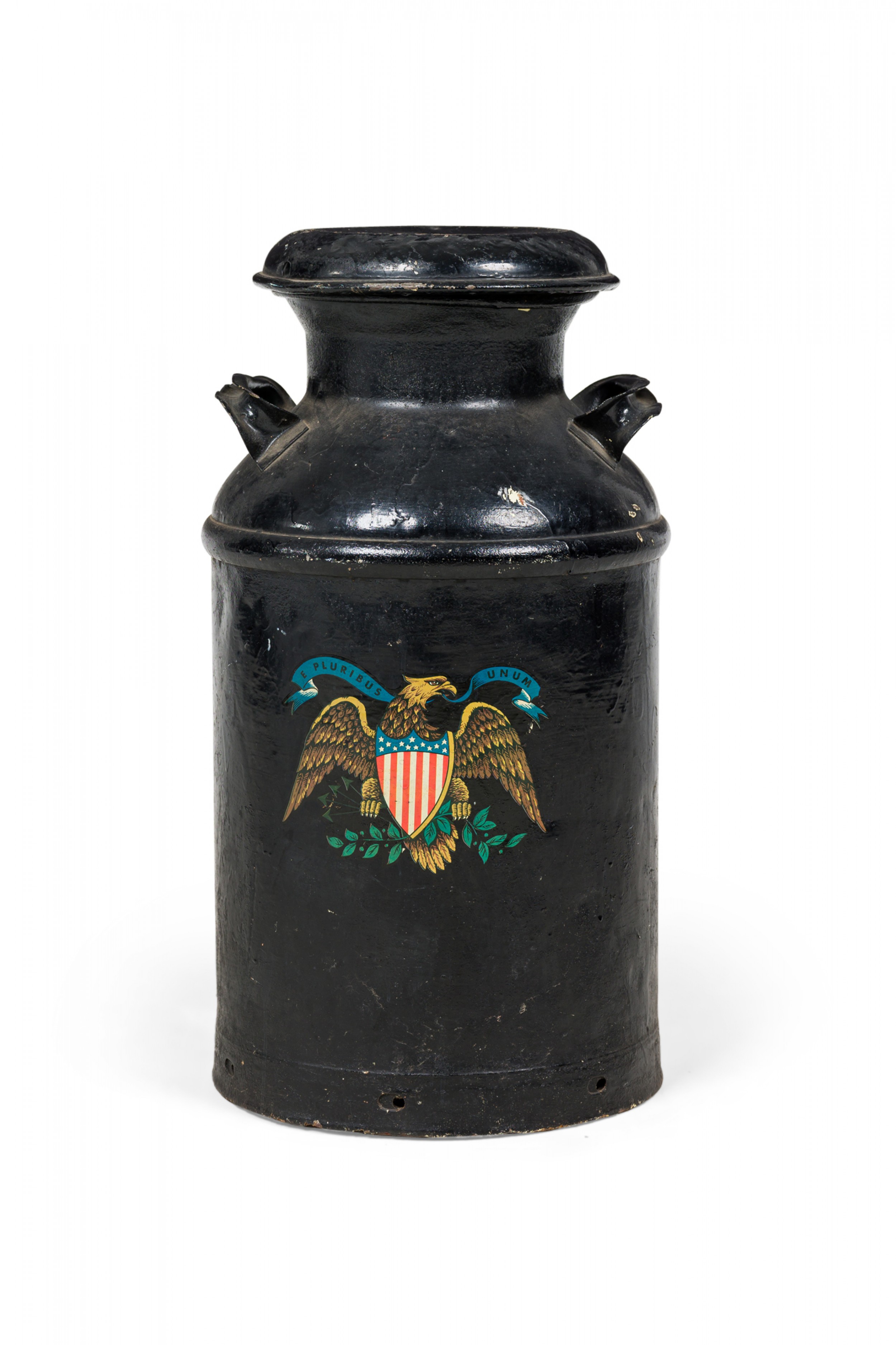 American Country-style decorative milk pail with a painted eagle standing atop two crossed American flags against a black painted background..