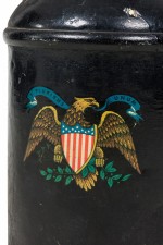 American Country-style decorative milk pail with a painted eagle standing atop two crossed American flags against a black painted background.
