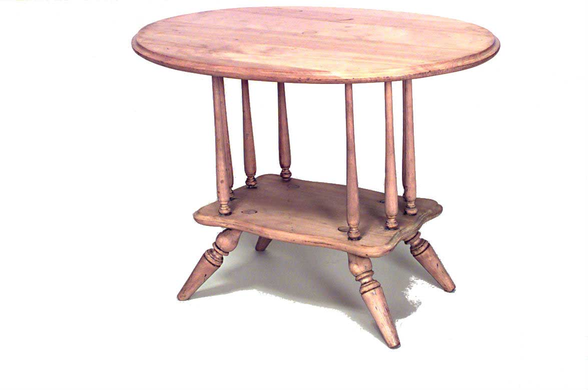 American Country-style (20th Century) small stripped pine coffee table with a bottom shelf, oval top, and spindle design.