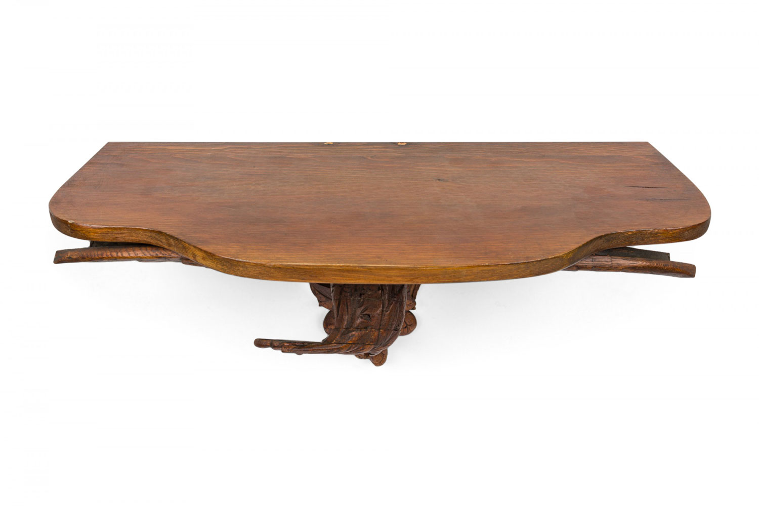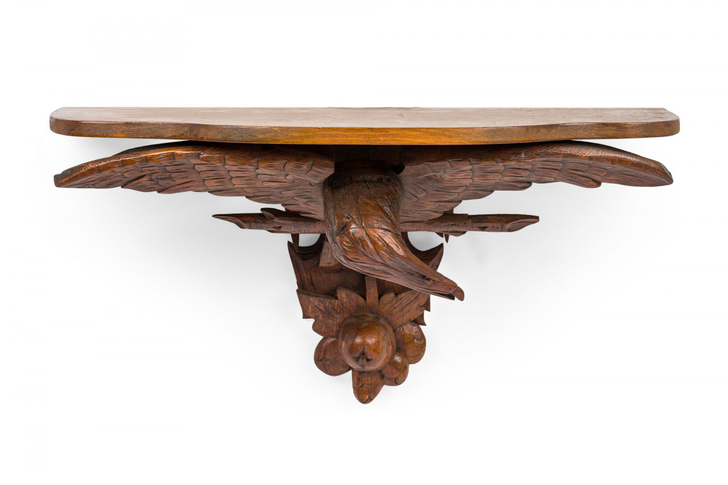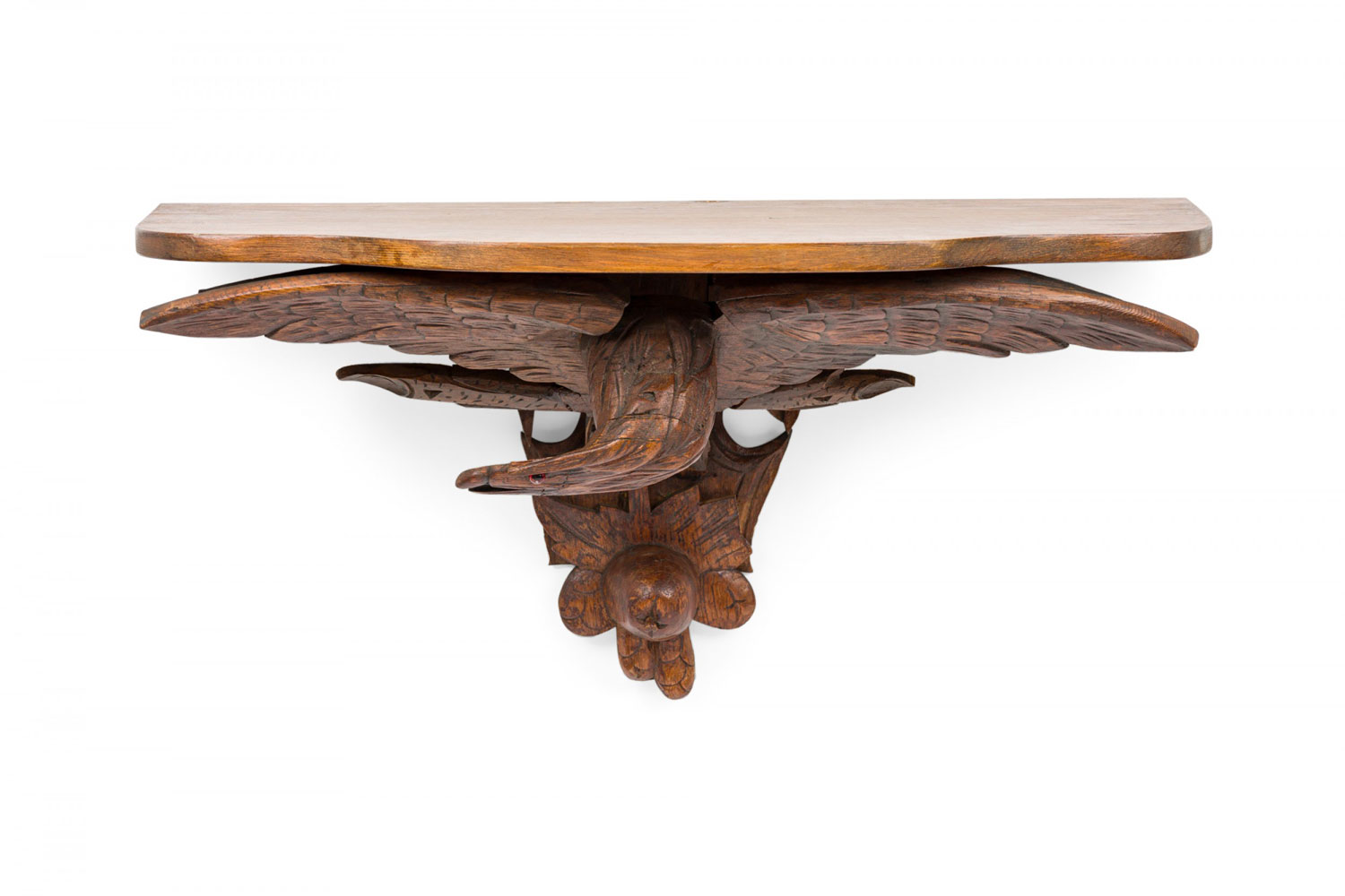 PAIR of American Country pine shaped top wall shelves supported by a carved eagle with spread wings above carved fruit (19/20th Cent).