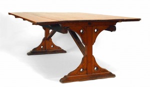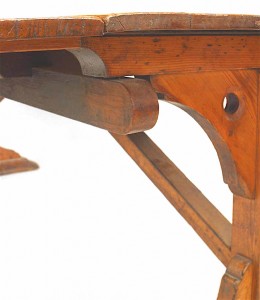 American Country-style (Mid 19th Century) pine dining "Harvest" table with folding leaves and pedestal end supports with cut out design (2 folding side leaves - 9.5 inches) (Attributed to PA. Moravian Sect).