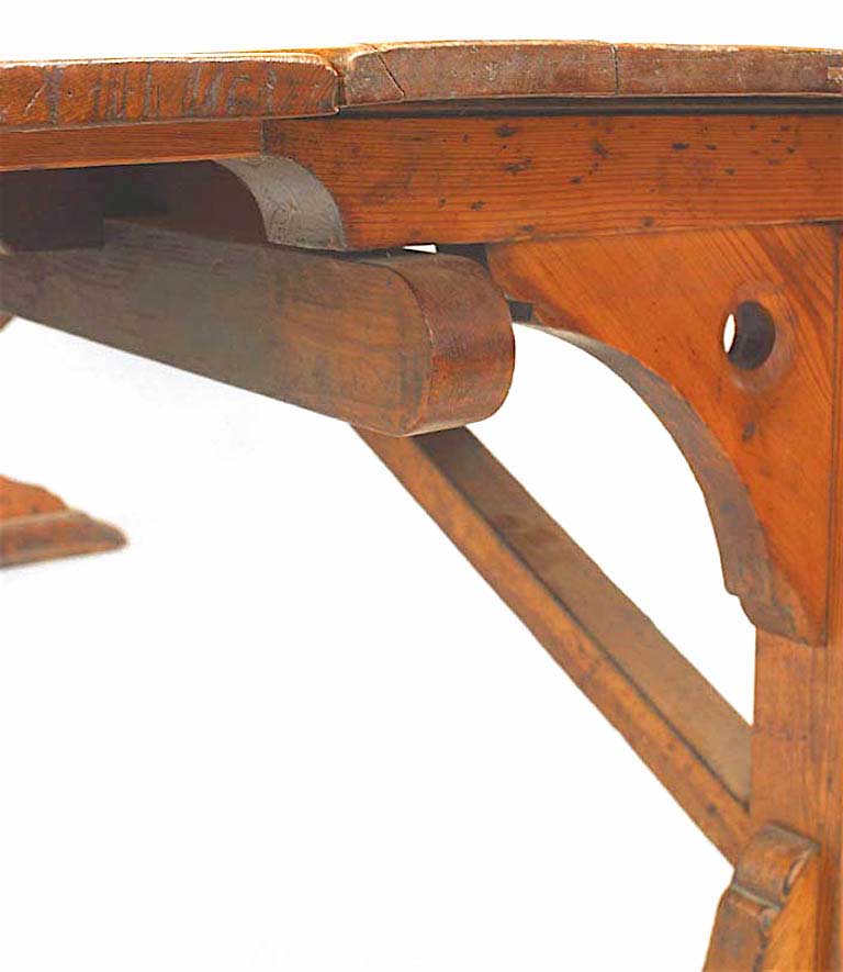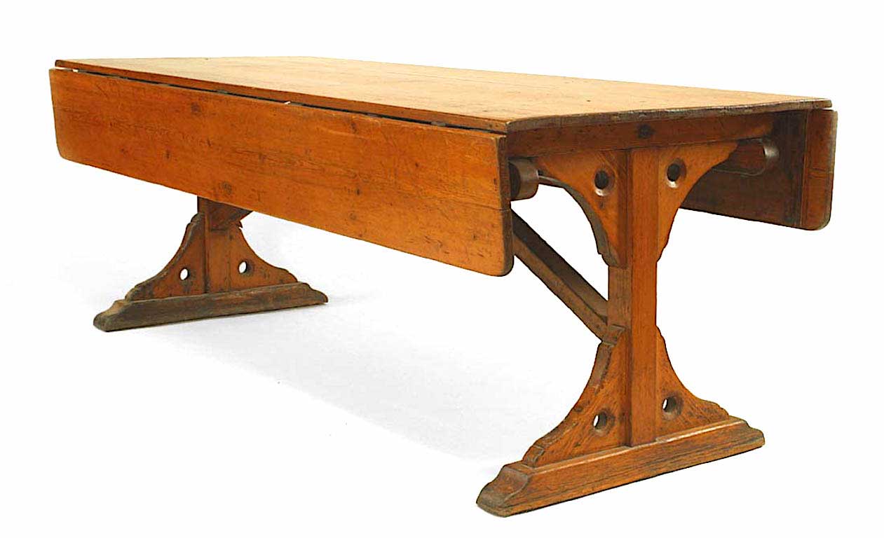 American Country-style (Mid 19th Century) pine dining "Harvest" table with folding leaves and pedestal end supports with cut out design (2 folding side leaves - 9.5 inches) (Attributed to PA. Moravian Sect)
