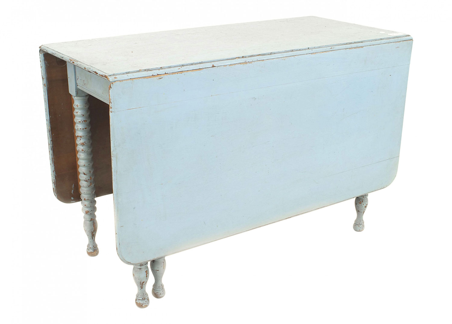 American Country Rustic-Style (19th Century) rectangular antique blue painted drop leaf table dining with spool design legs.