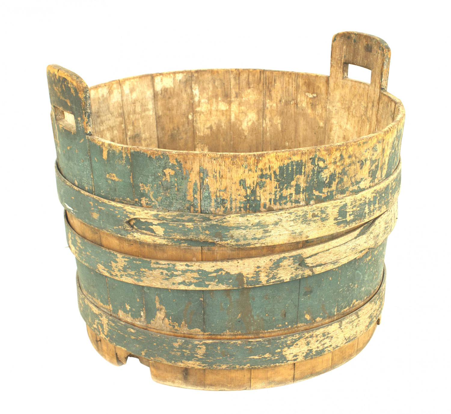 American Country Rustic style antique blue painted pine large water bucket with cut out handles..
