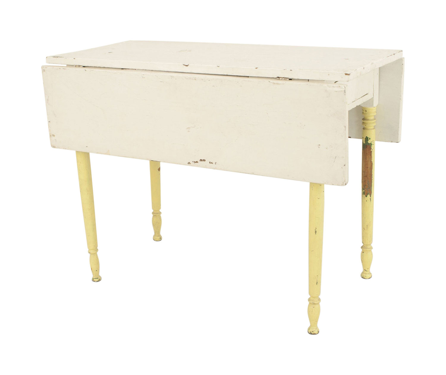 American Country Rustic-Style (19th Century) rectangular antique white painted pine drop leaf dining table with turned yellow legs.
