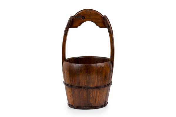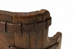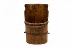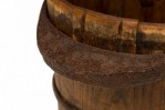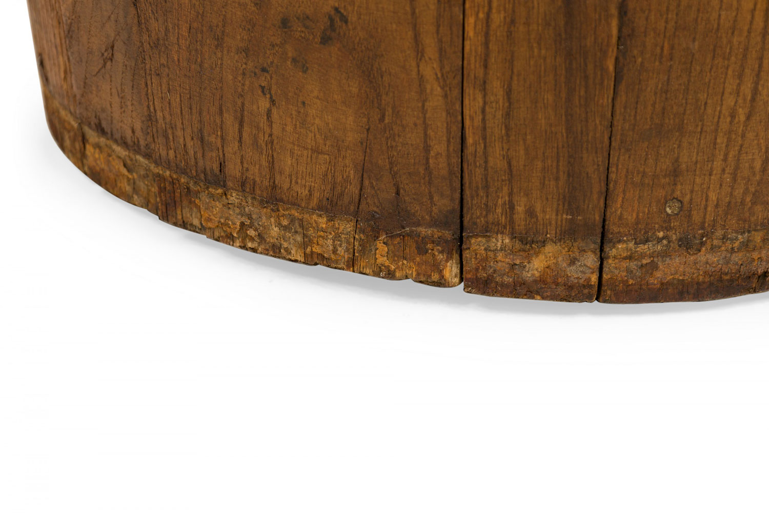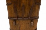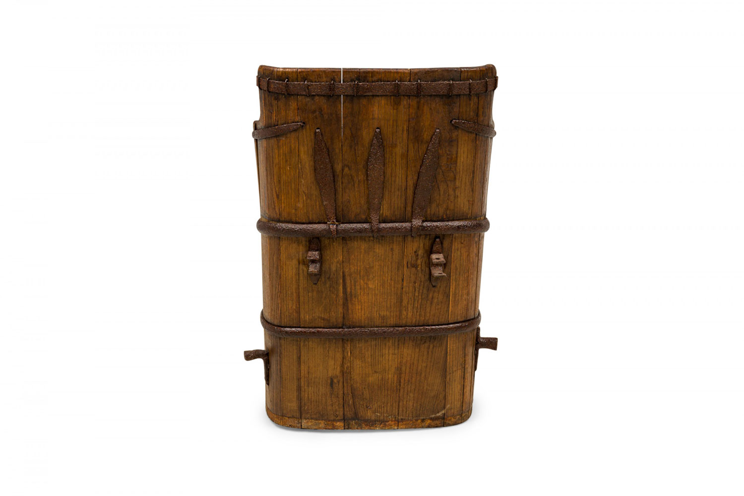 American Country / Rustic-style barrell umbrella stand made of wooden planks with iron banding with a high flat back and low front.