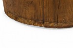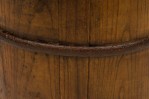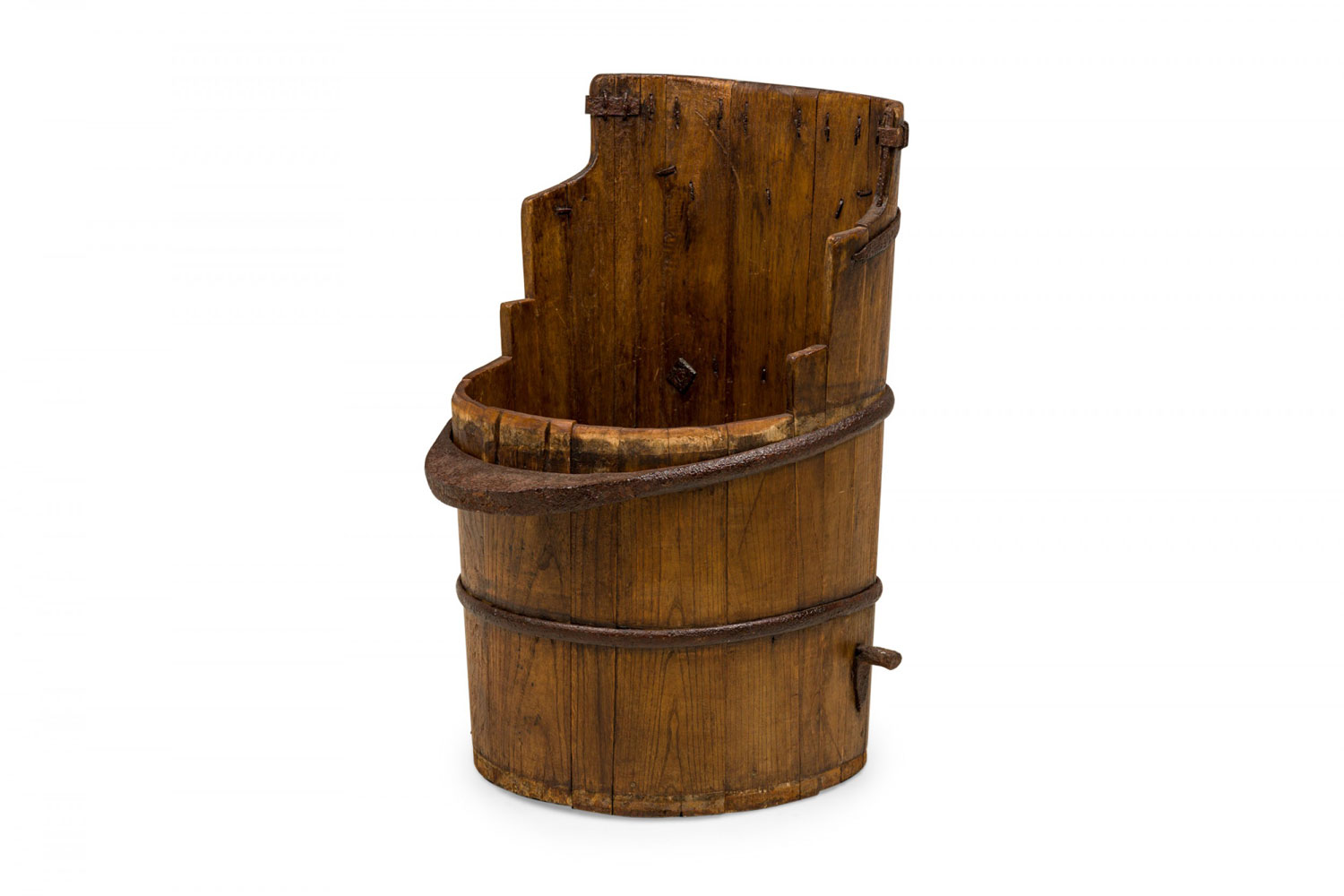 American Country / Rustic-style barrell umbrella stand made of wooden planks with iron banding with a high flat back and low front..