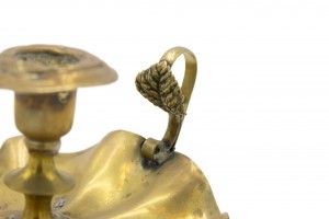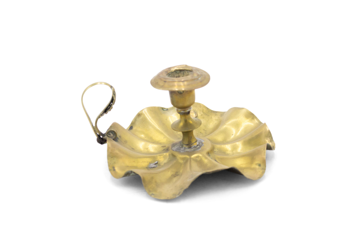 American Country-style (19/20th Century) brass round scalloped base candlestick with leaf handle..