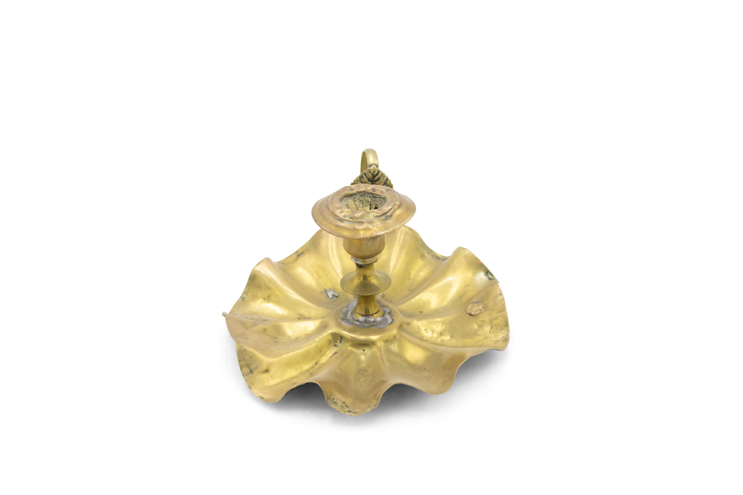 American Country-style (19/20th Century) brass round scalloped base candlestick with leaf handle.