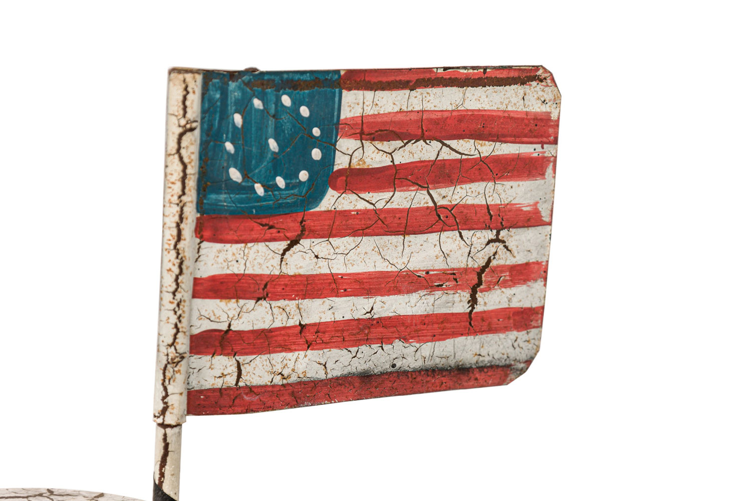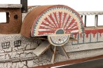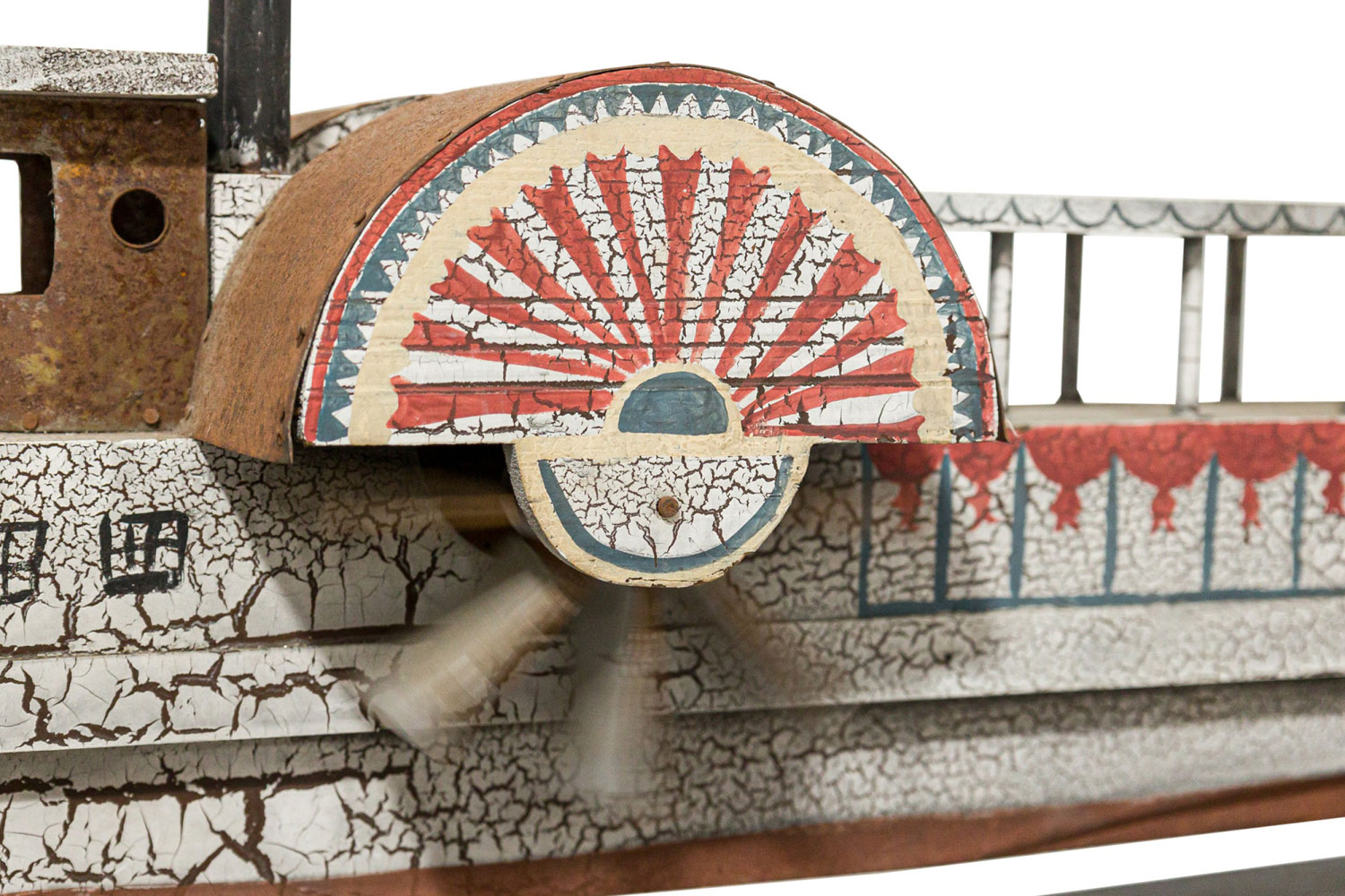 American Country Style carved wood folk art steamboat painted and textured in an antique finish with metal parts including the American flag, wheel covers and captain's helm, with rotating wheels, mounted on a rectangular beveled plinth..