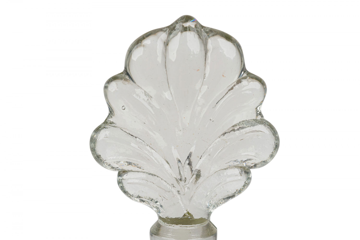 American Country-style cake plate with a carved wooden circular base featuring a filigree foliate design around the edge, resting on a turned wood post and circular foot, topped with a clear glass cloche wtih a pressed glass leaf finial..