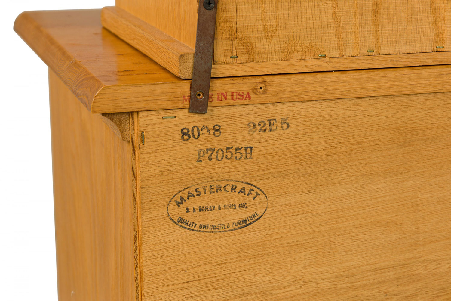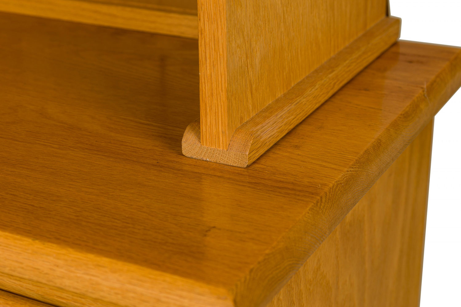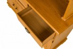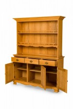Contemporary American Country-style provencial farmhouse wooden hutch with three shelves supported on a lower cabinet with three drawers and three base compartments..