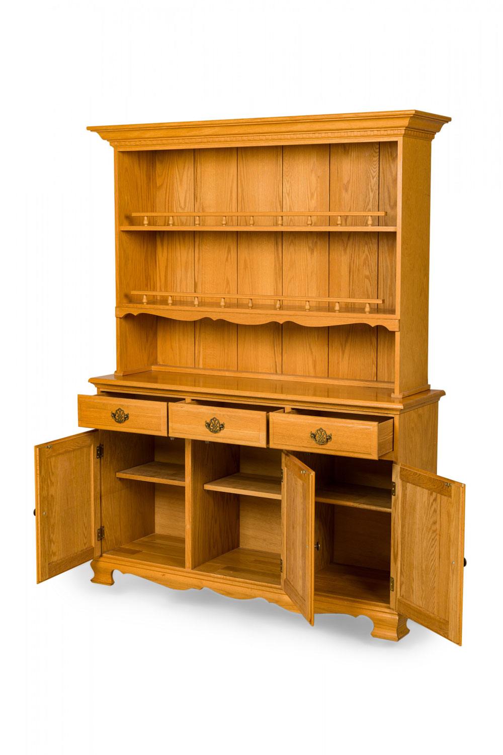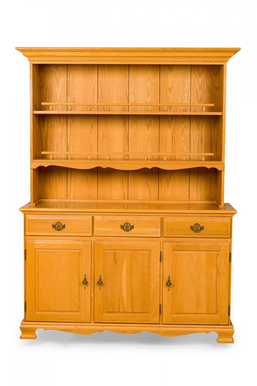 Contemporary American Country-style provencial farmhouse wooden hutch with three shelves supported on a lower cabinet with three drawers and three base compartments.