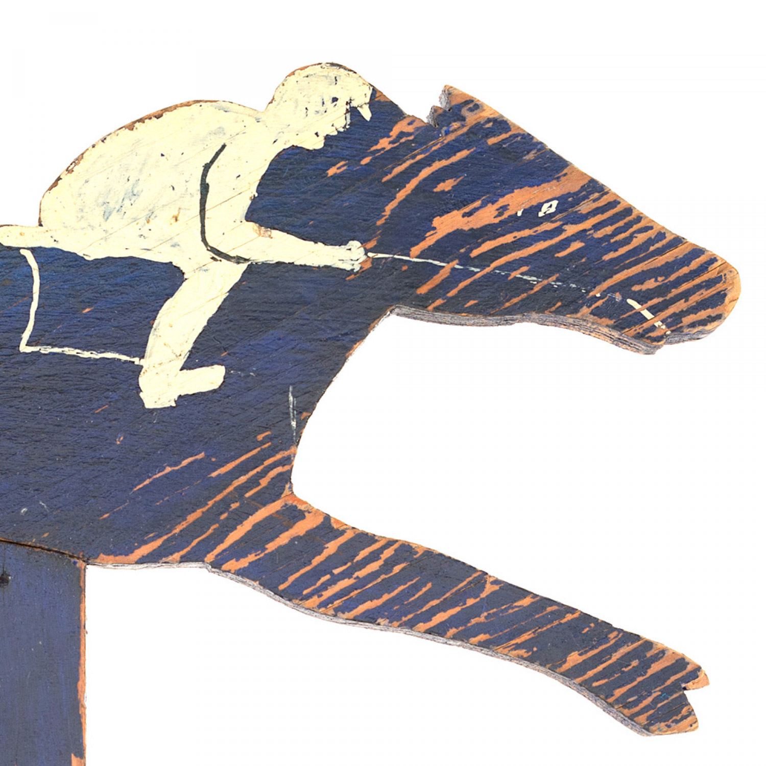 American Country blue painted wood sculpture a man riding a horse on a rectangular base..
