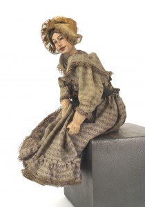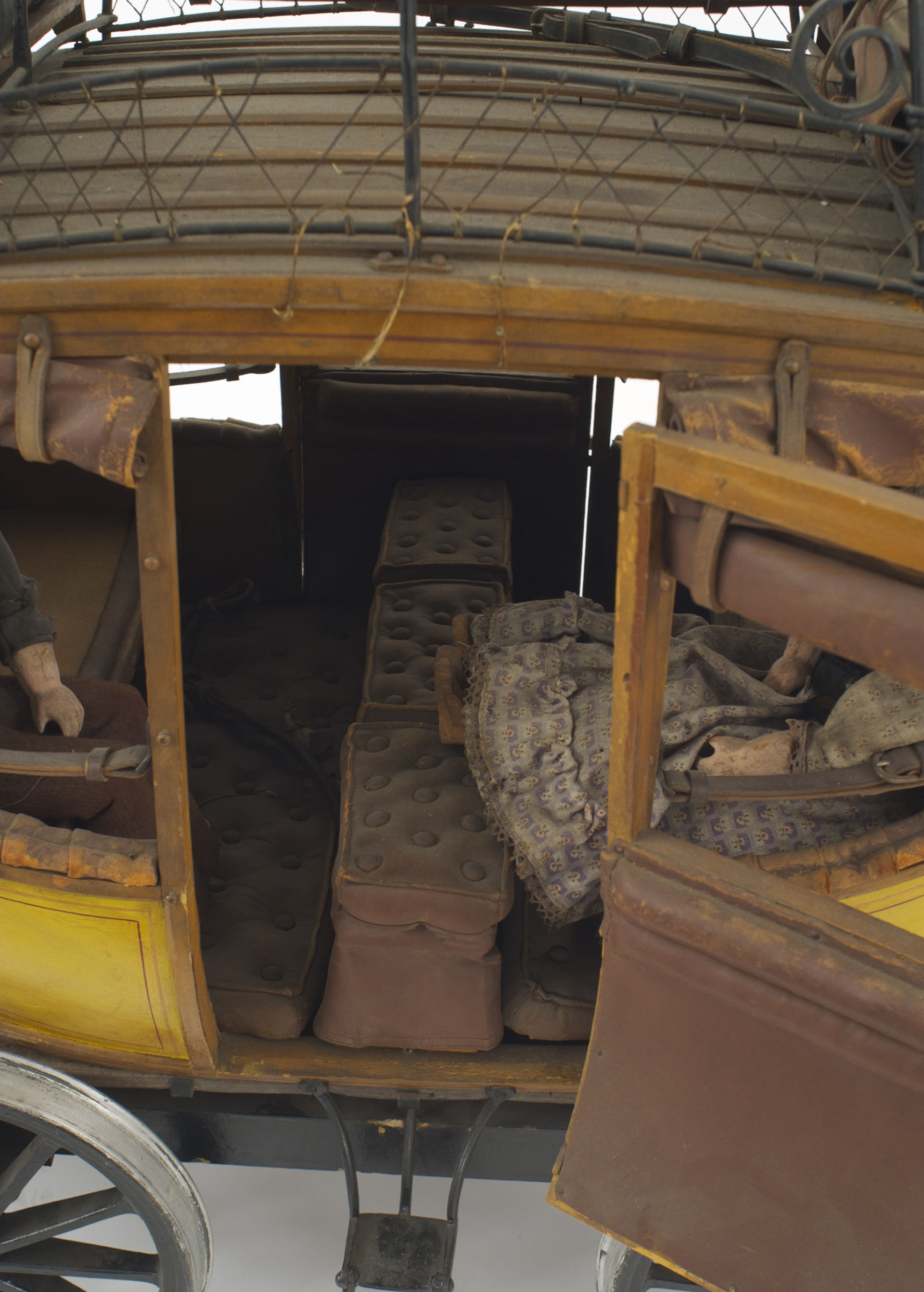 American Country style (20th Cent) painted wood model of DeWitt Clinton train coach with doll figures (see #037074-companion piece, Stephenson's Rocket steam engine).