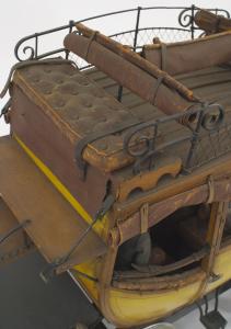 American Country style (20th Cent) painted wood model of DeWitt Clinton train coach with doll figures (see #037074-companion piece, Stephenson's Rocket steam engine)