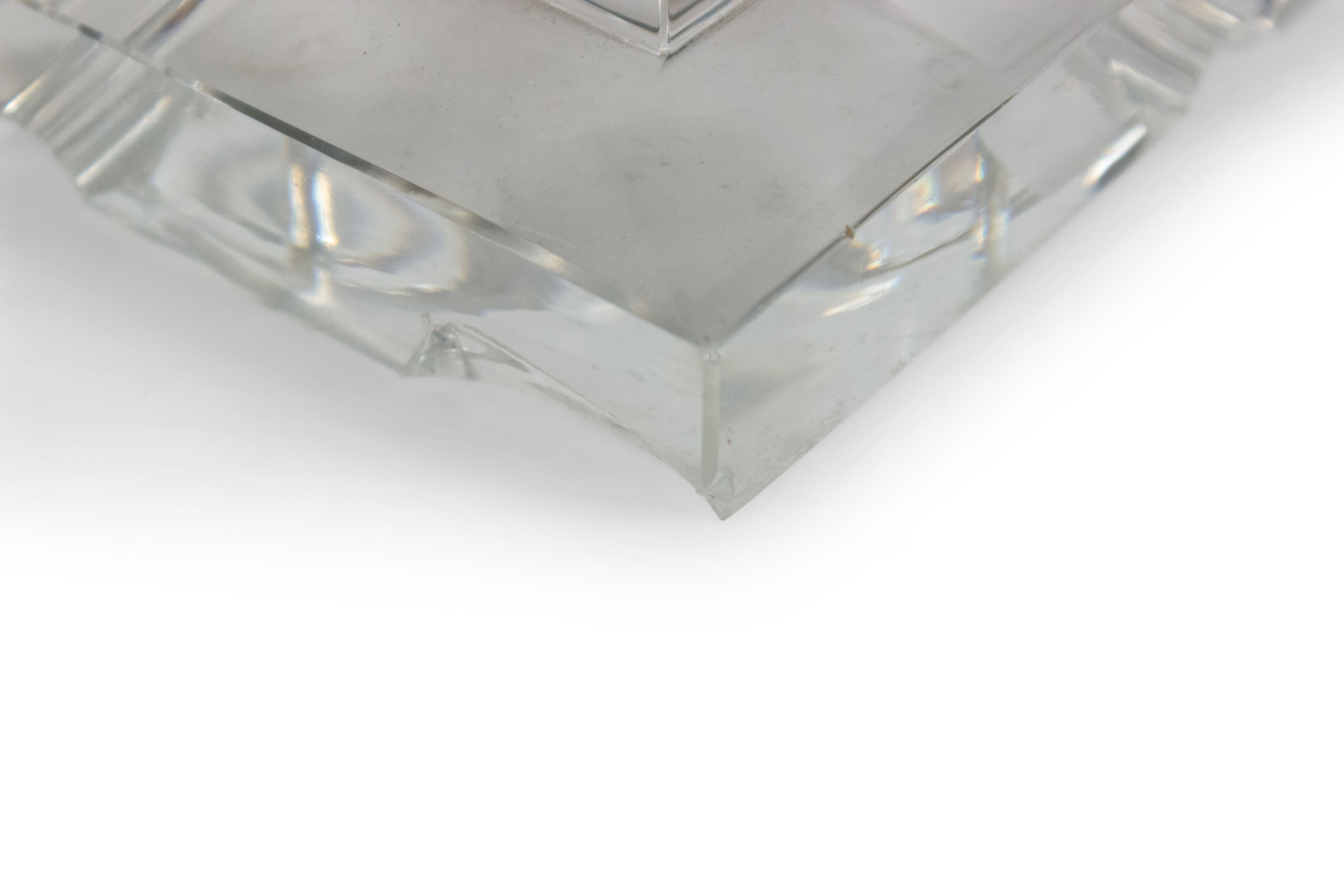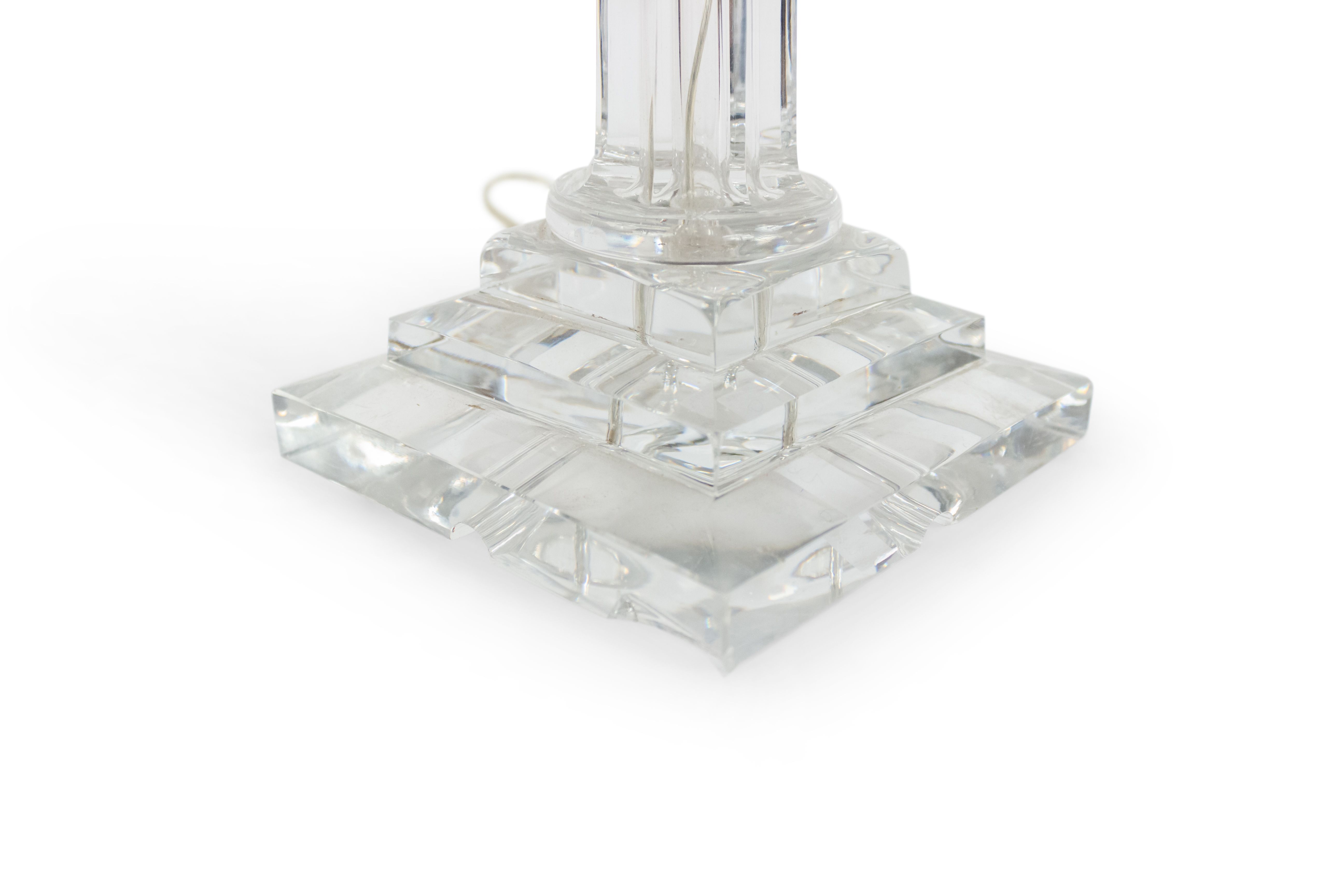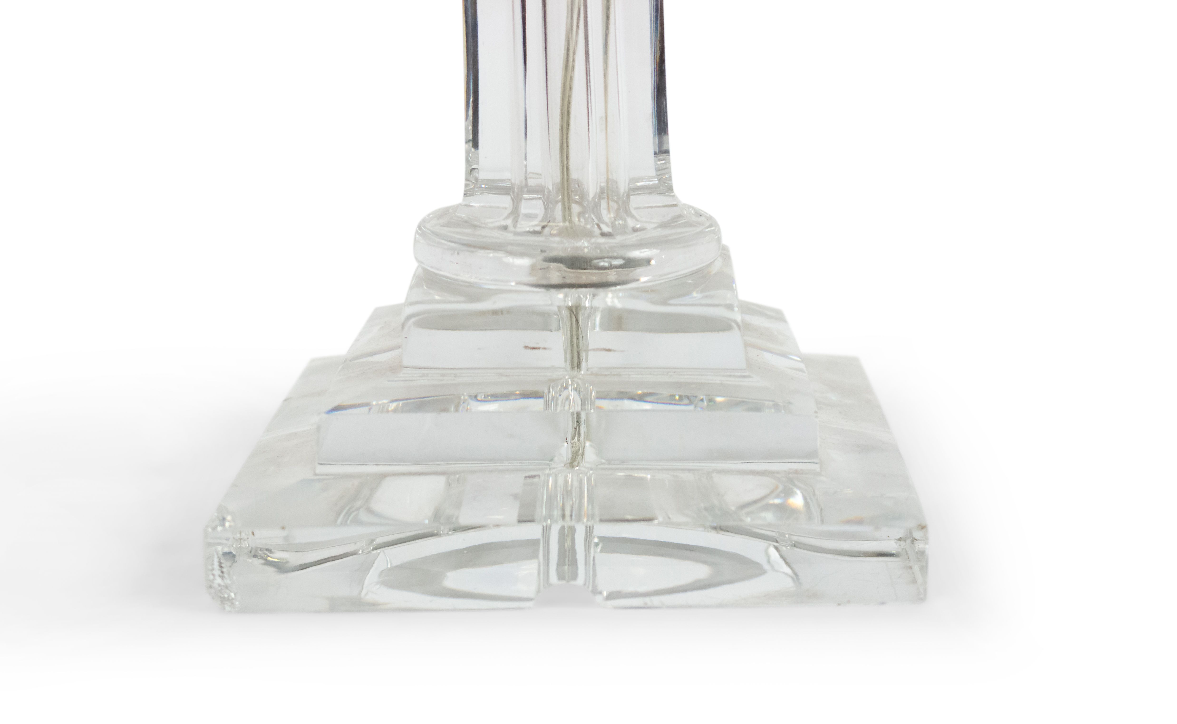 American (Mid-20th Century) crystal column table lamp with brass Corinthian capital on a square step-up base. (designed by David Barrett).