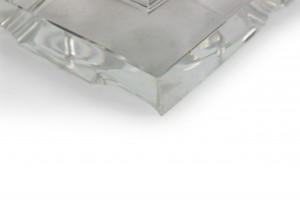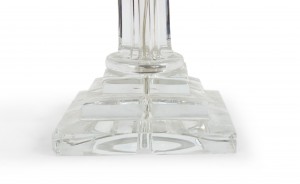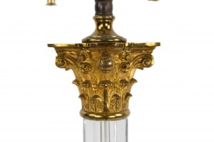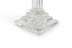 American (Mid-20th Century) crystal column table lamp with brass Corinthian capital on a square step-up base. (designed by David Barrett)..
