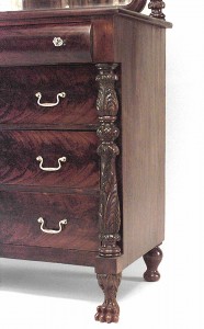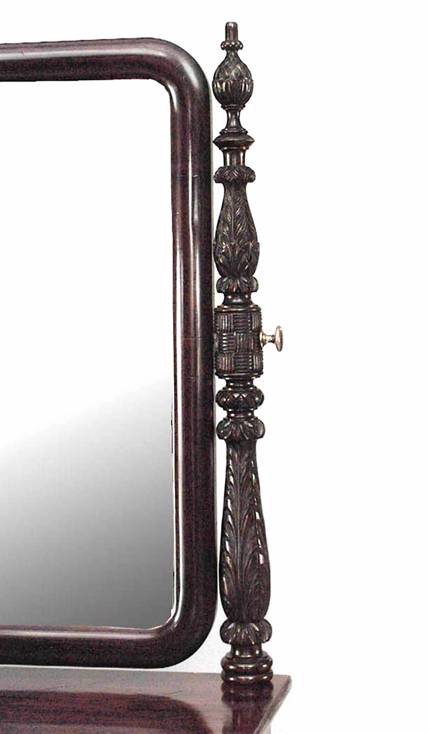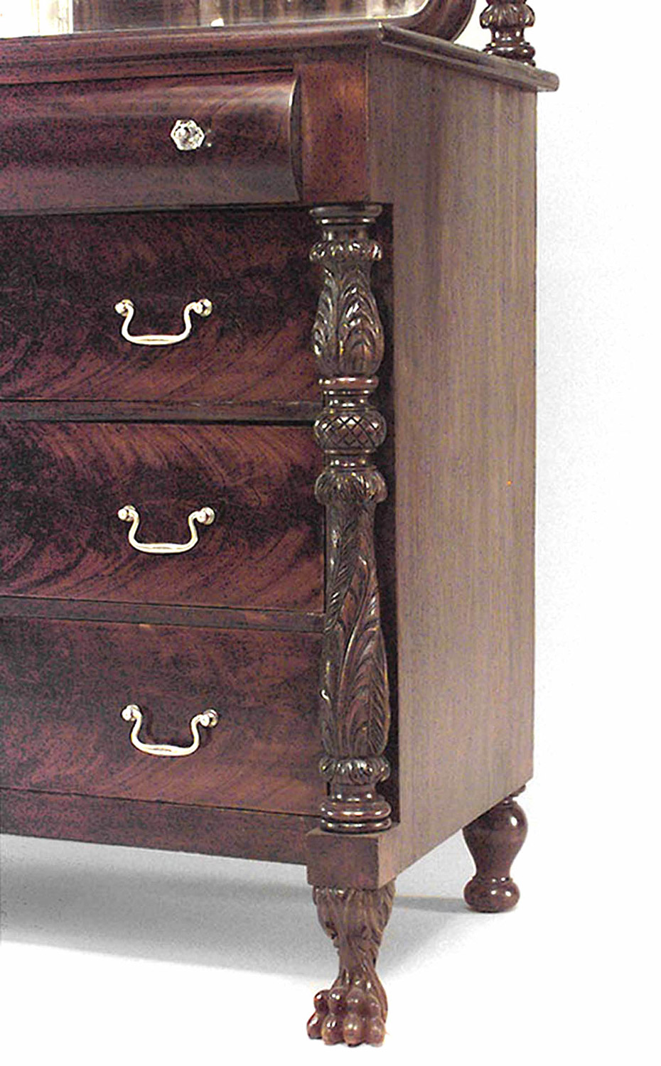 American Empire mahogany chest of drawers with carved pineapple finials and sides with swivel mirror top.