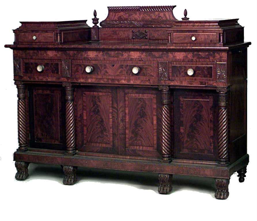 American Empire mahogany double platform sideboard cabinet with 4 carved swirl columns and backrail with finials.