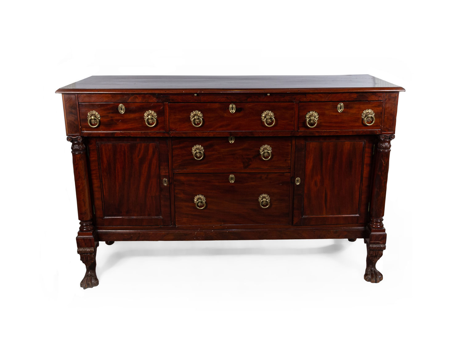 American Empire mahogany sideboard /buffet with 3 drawers over 2 cabinet doors centering 2 drawers all having brass ring pulls with carved ionic column sides and claw feet,.