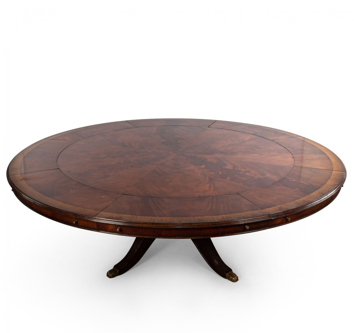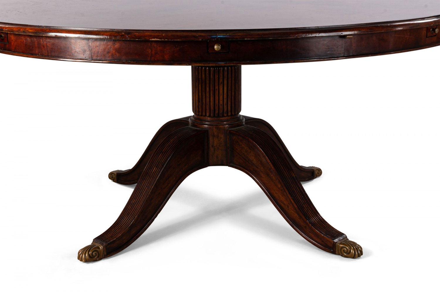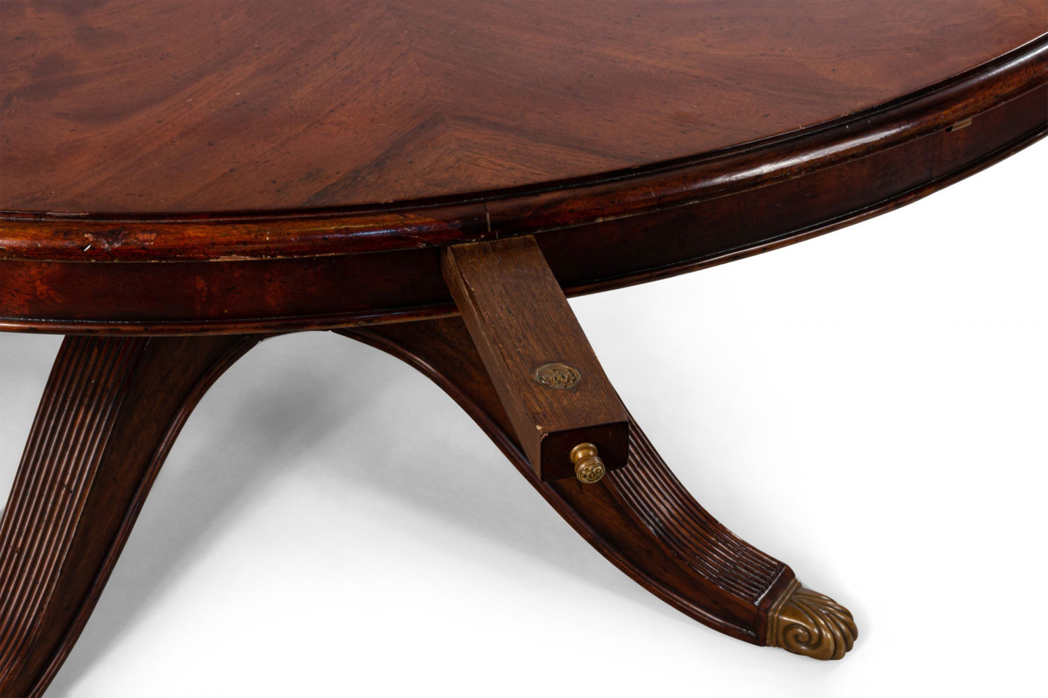 English Georgian style (circa 1920s) large round mahogany center / conference table with 4 fluted legs having dark brass feet emanating from a pedestal base (ten 12" deep circular extension leaves stored in 062484).