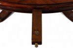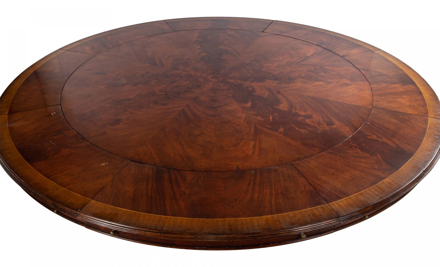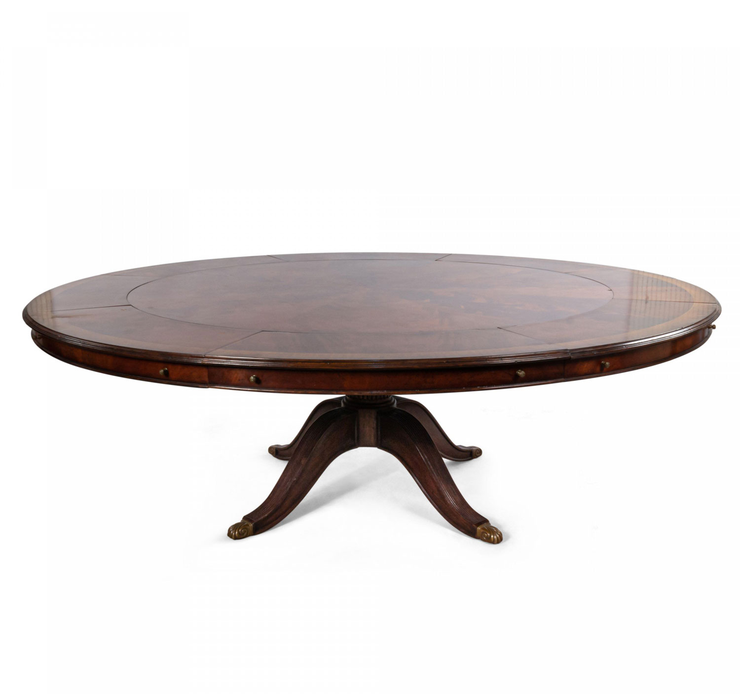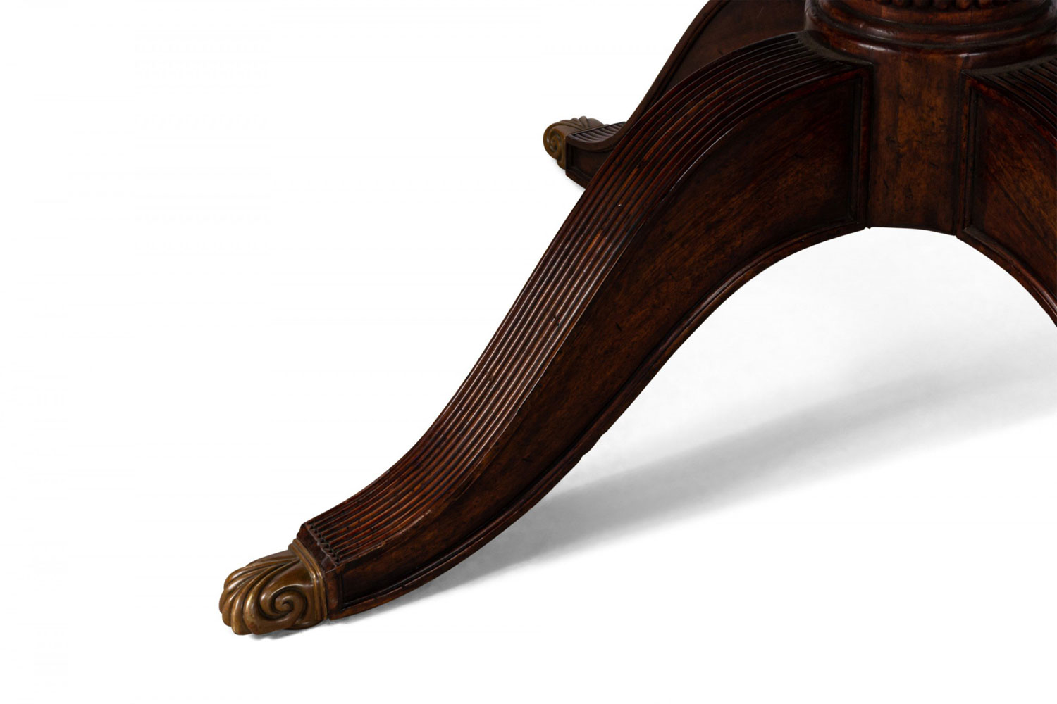 English Georgian style (circa 1920s) large round mahogany center / conference table with 4 fluted legs having dark brass feet emanating from a pedestal base (ten 12" deep circular extension leaves stored in 062484).